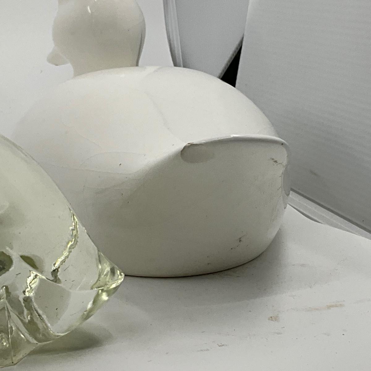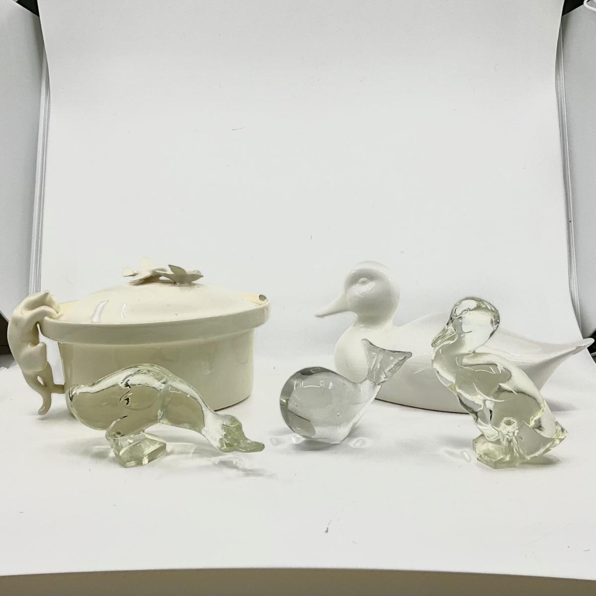 1276 Glass Figures and Ceramic White Duck with Cat Covered Vegetable Dish