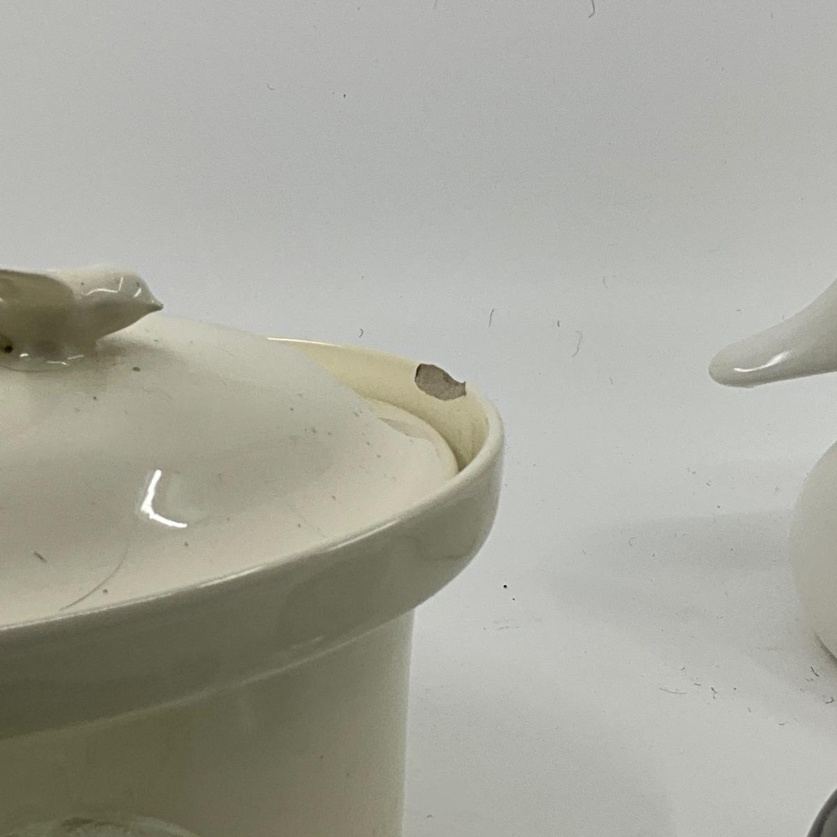 Vegetable dish has a small chip on edge, duck has a small chip on tail