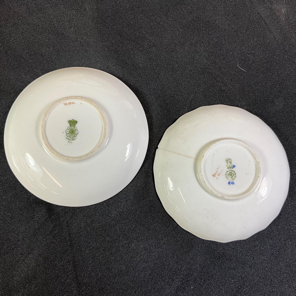 The three large dinner plates measure 10" diameter and the two saucers are 4.5" diameter with one having a hairline crack