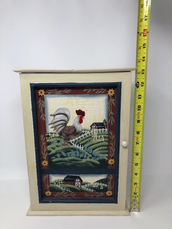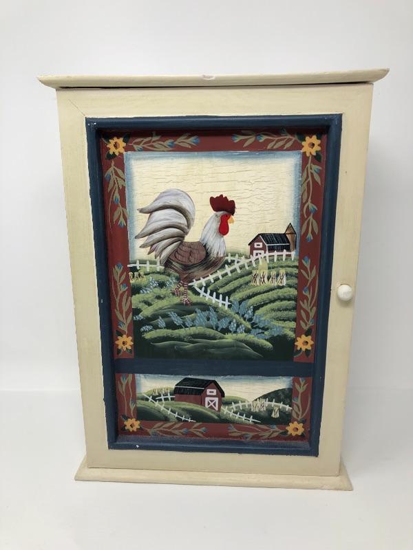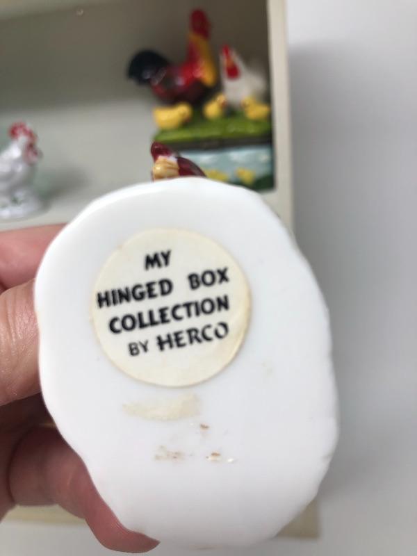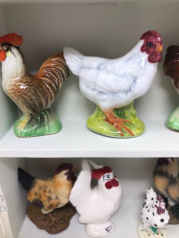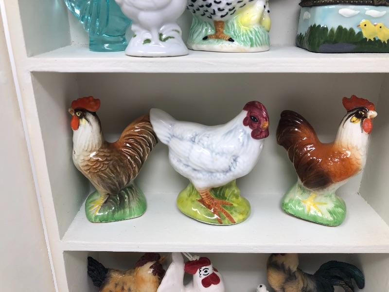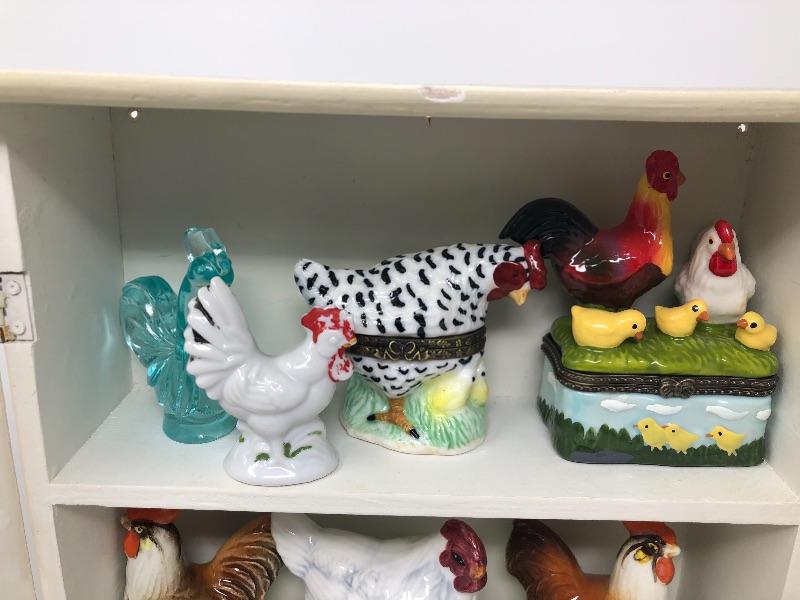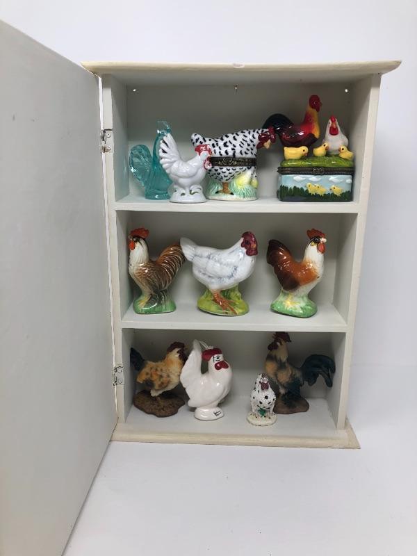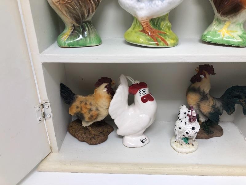 Miniature Chicken and Rooster Collection in Charming Wood Shelf Cabinet. Herco hinged chicken and other very sweet chicken collectibles. Shelf/cabinet is included.