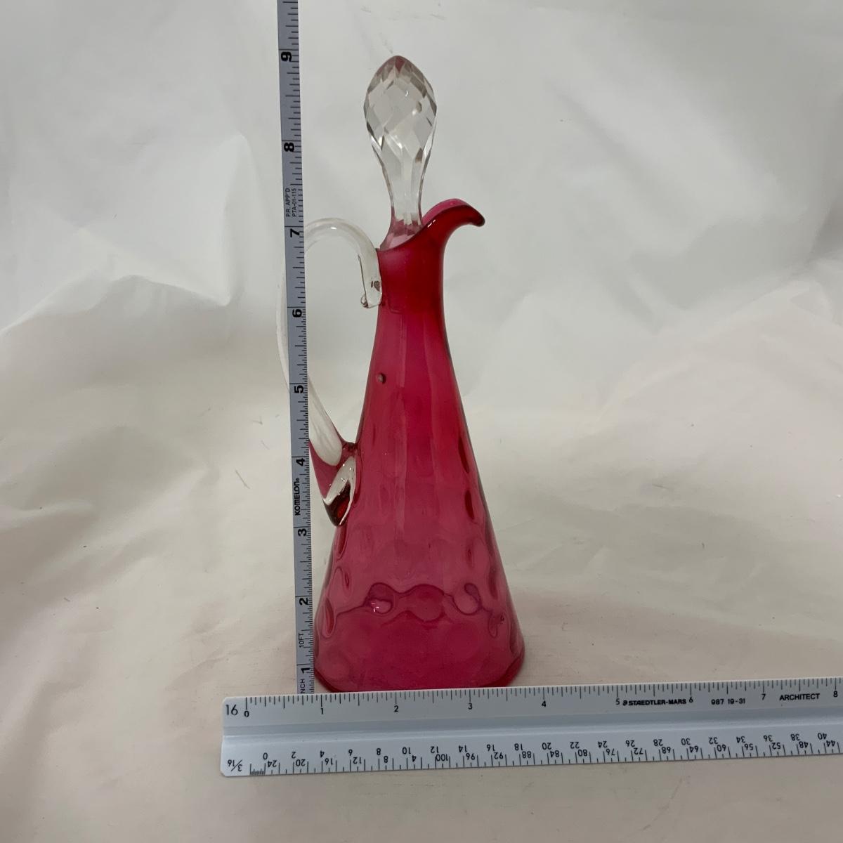 Beautiful Cranberry Thumbprint Ewer with faceted stopper. Nice condition, and you can’t go wrong with cranberry glass! Please see photos for details and condition. There is a small flaw behind the handle that is from production. ::: Shipping is available on this lot. If you require shipping you must let us know at the close of the auction. We will coordinate with you after the item has been won. Shipping fees will include insurance up to or exceeding the value of all items being mailed. If you have any questions regarding this lot please contact the auctioneer either via this website, by direct email or by phone. PICK UP TIMES and other important information can be found in the TERMS and DESCRIPTION of the auction. Please take a look for pertinent information. Thanks!