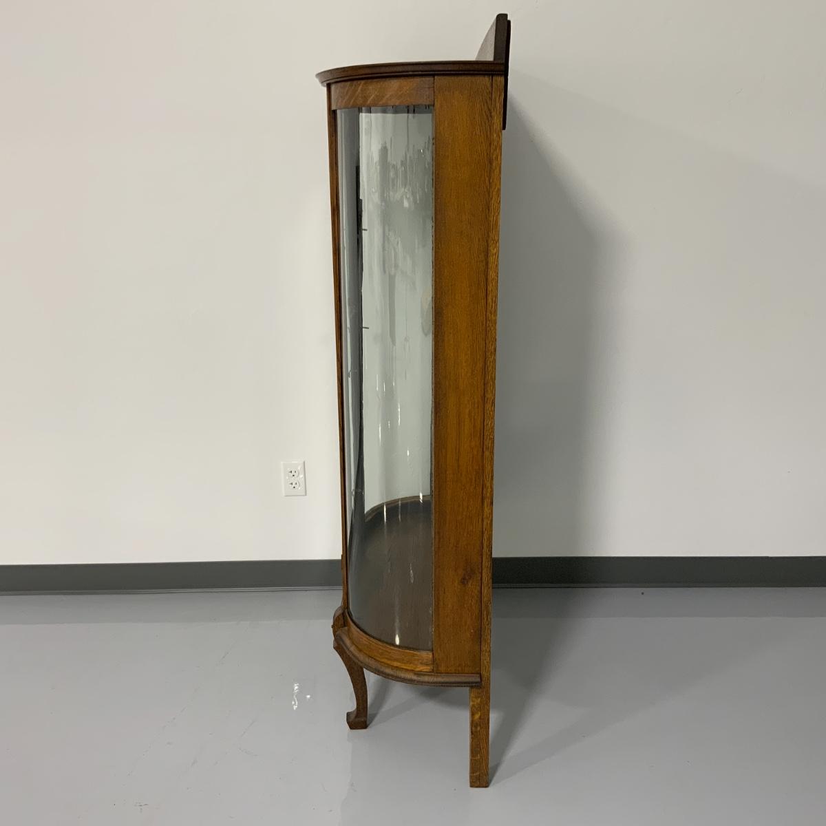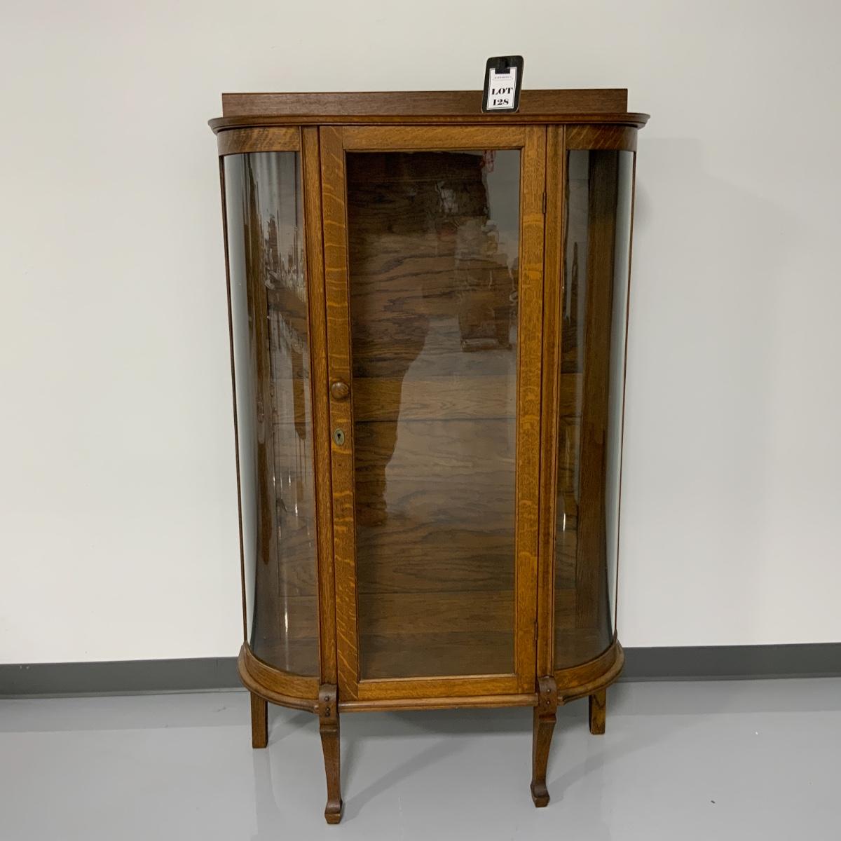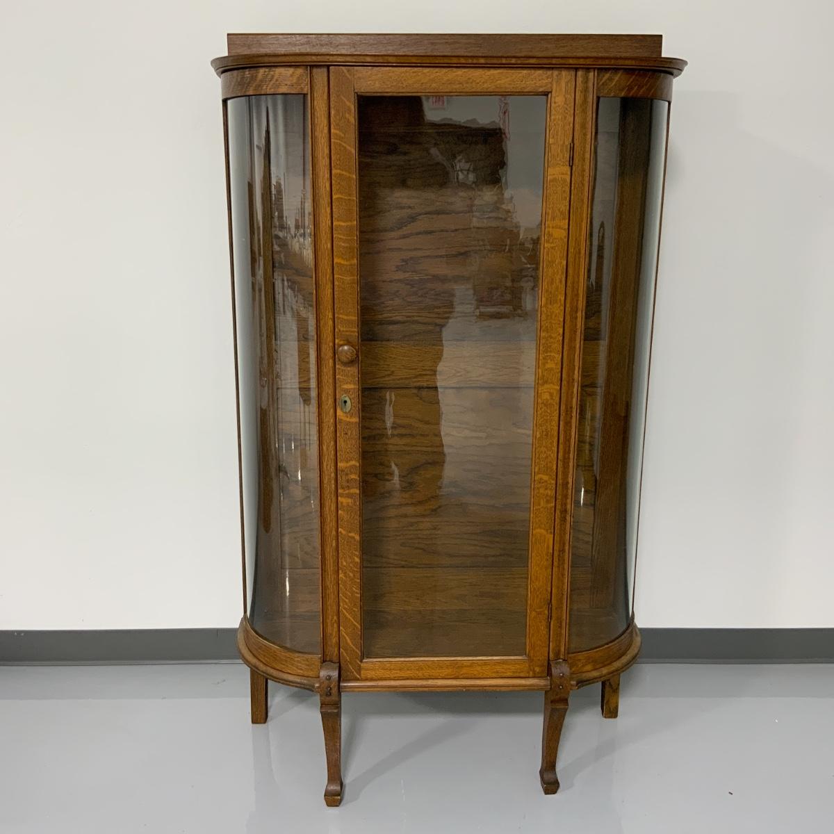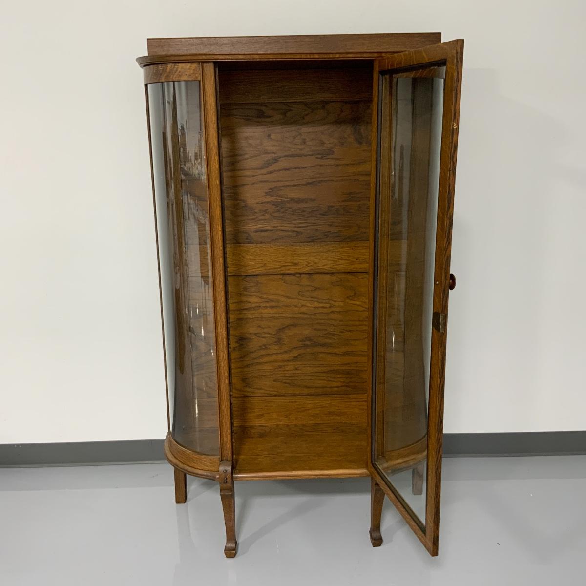 From the Estate of Peter Radovanovich: Beautiful Oak Curved Glass Curio Cabinet. Includes three adjustable shelves and the brackets to hold them in place. Key is also included. Curio Measures 62” x 37” x 14”. Please see photos for details and condition. ::: Shipping is NOT available on this lot. If you have any questions regarding this lot please contact the auctioneer either via this website, by direct email or by phone. PICK UP TIMES and other important information can be found in the TERMS and DESCRIPTION of the auction. Please take a look for pertinent information. Thanks!