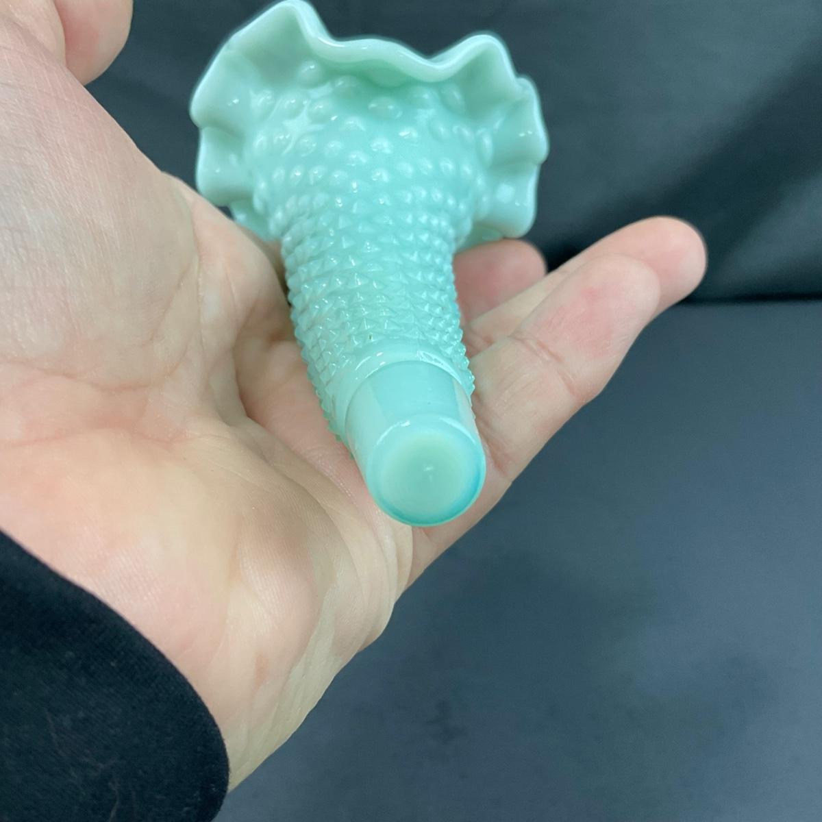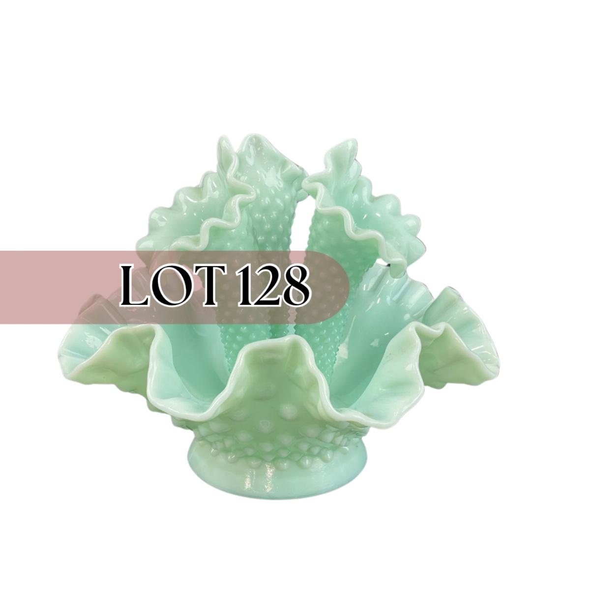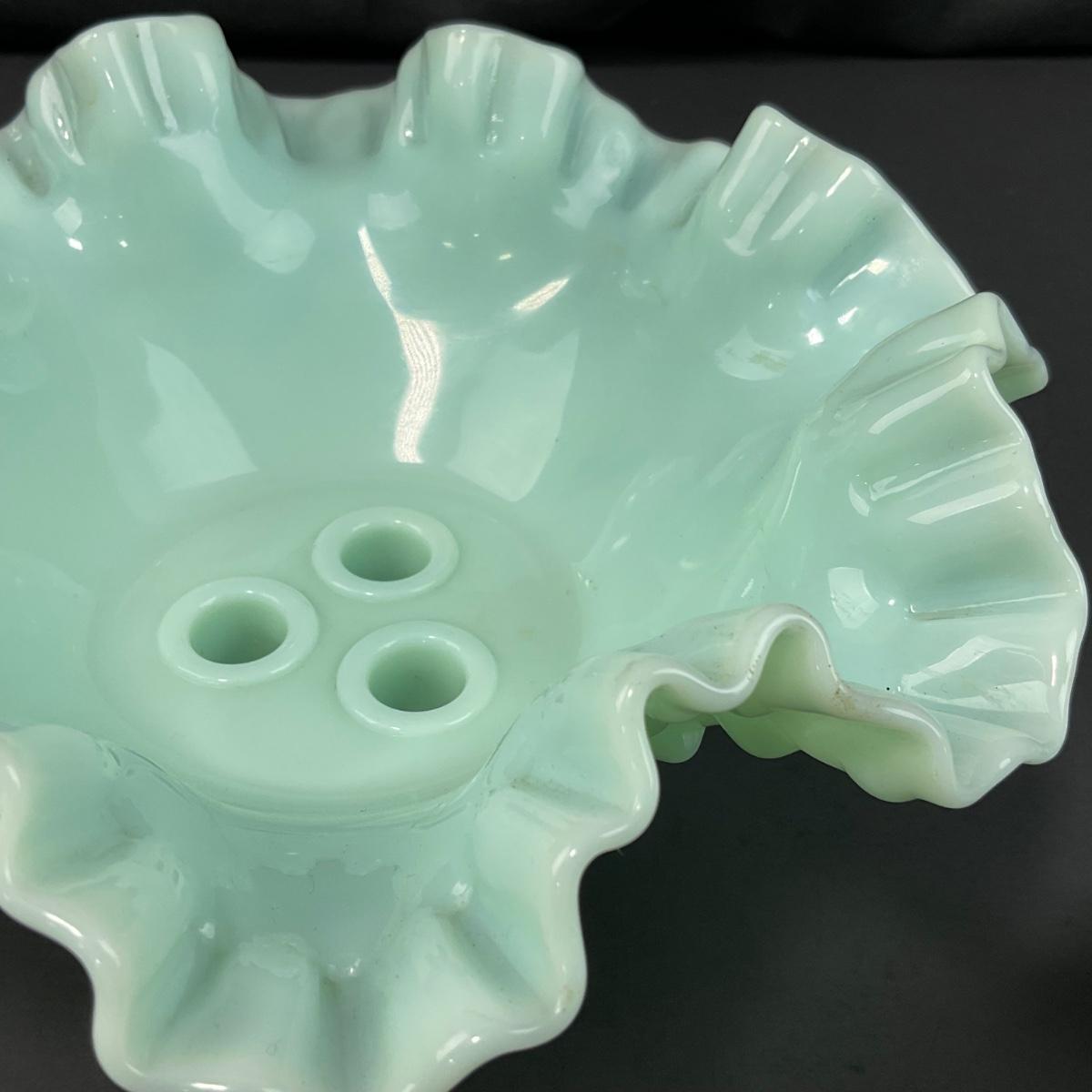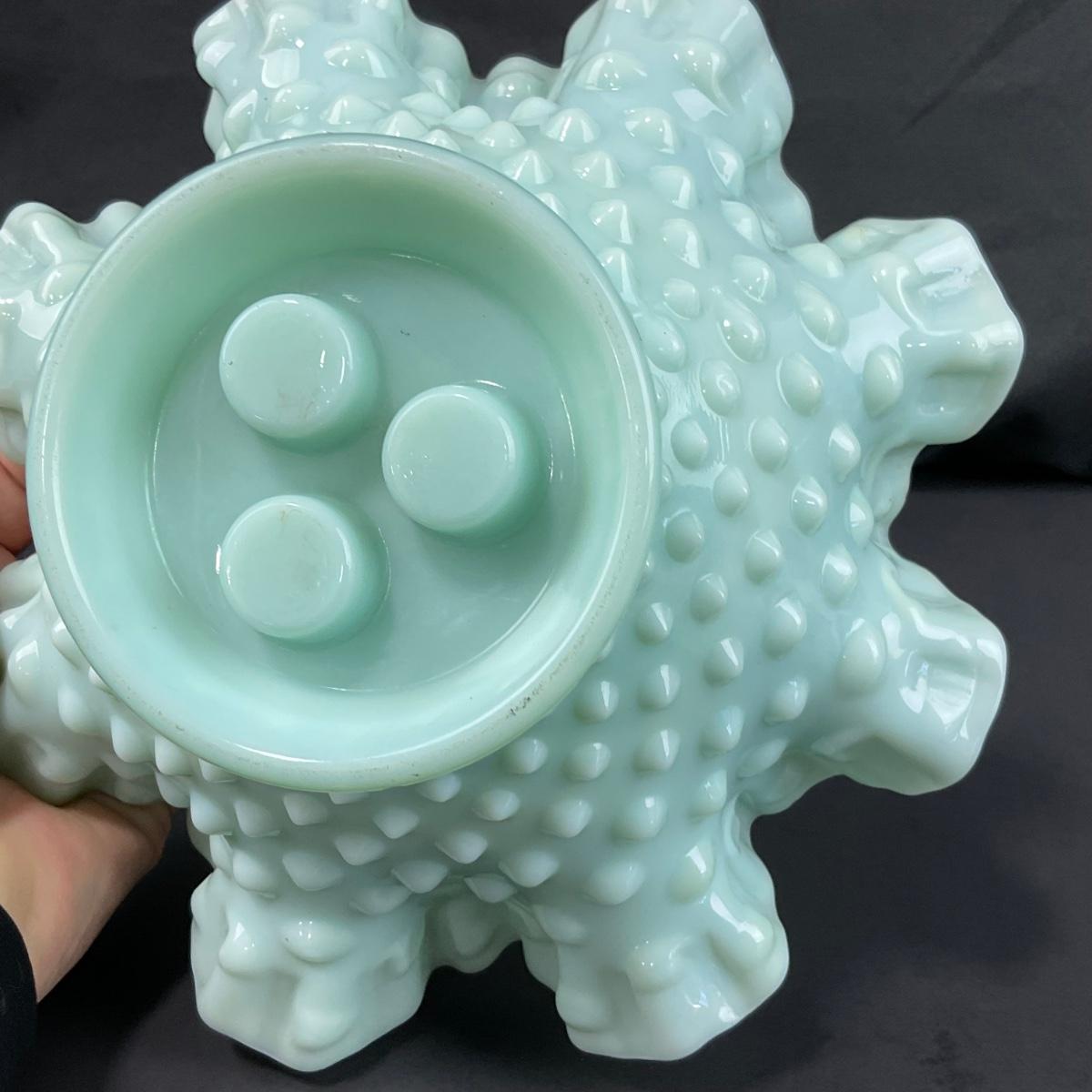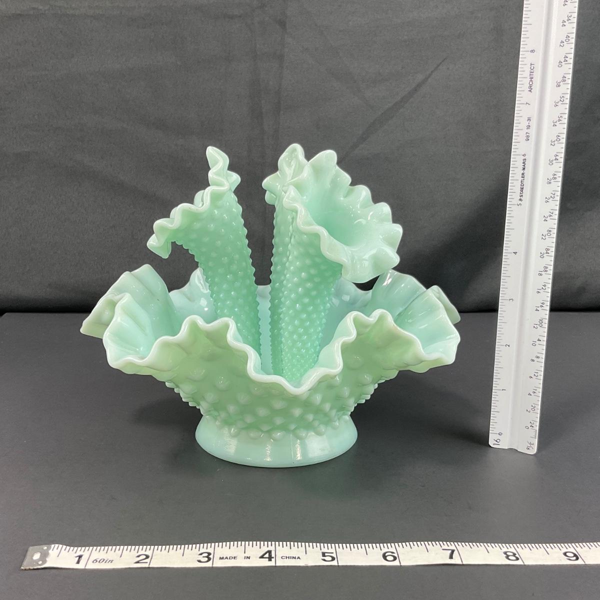 One vintage Fenton green pastel milk glass hobnail three horn Epergne. This piece does have some scuffs, scratches, marks, or slight damage, but otherwise appears to be in great shape. Please see photos for details and condition. Any condition statement is given as a courtesy to a client, is an opinion, and should not be treated as a statement of fact. Reference to condition written, oral or within a condition report shall not be regarded as a full account of condition and may not include all defects, alterations, or restorations. Absence of a condition report does not imply a lot is flawless or lacking imperfections or damage. Katherine’s Auction & Appraisal Service shall have no responsibility for any error or omission. Returns shall not be accepted on the basis of condition. ::: Shipping is available on this lot. If you require shipping you must let us know at the close of the auction. We will coordinate with you after the item has been won. Shipping fees will include insurance up to or exceeding the value of all items being mailed. If you have any questions regarding this lot please contact the auctioneer either via this website, by direct email or by phone. PICK UP TIMES and other important information can be found in the TERMS and DESCRIPTION of the auction. Please take a look for pertinent information. Thanks!