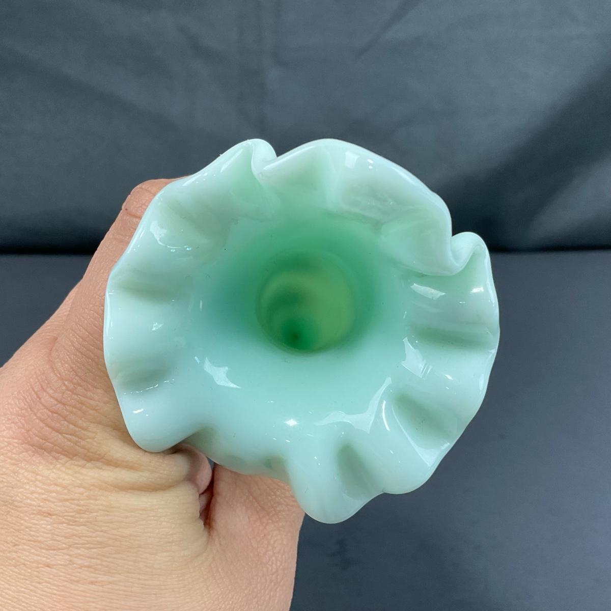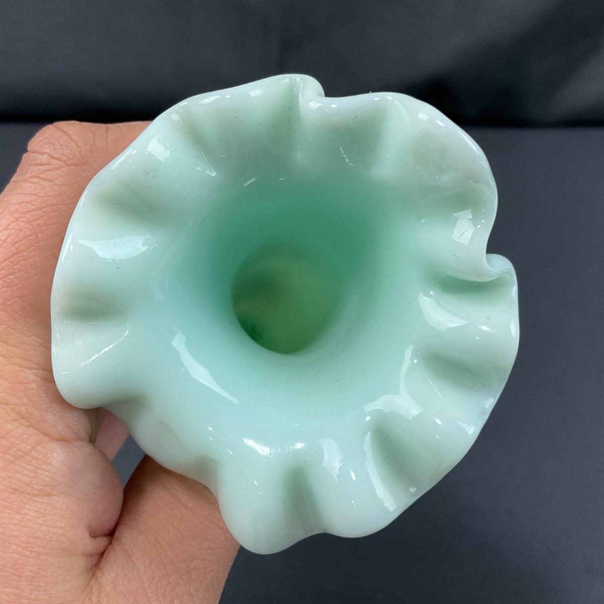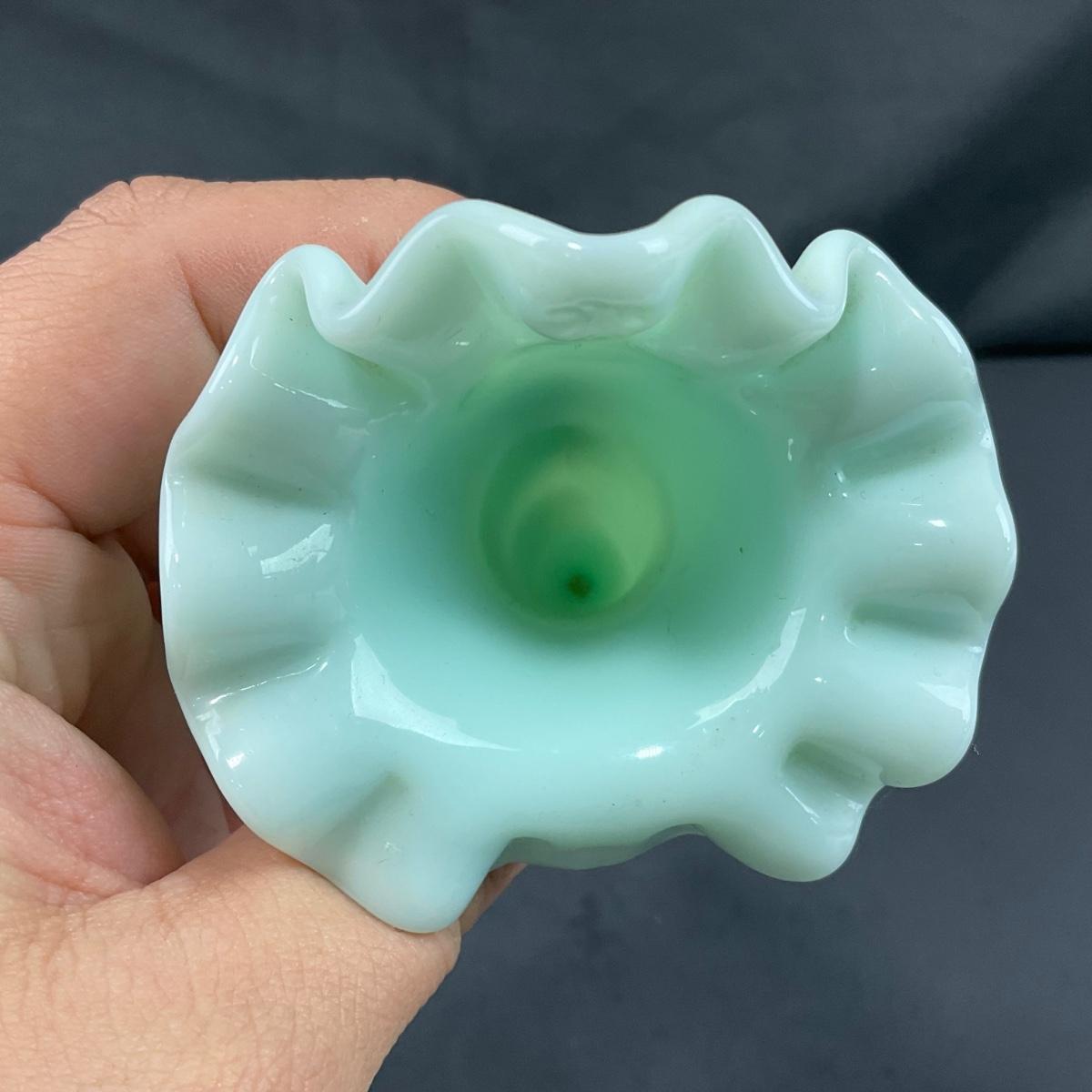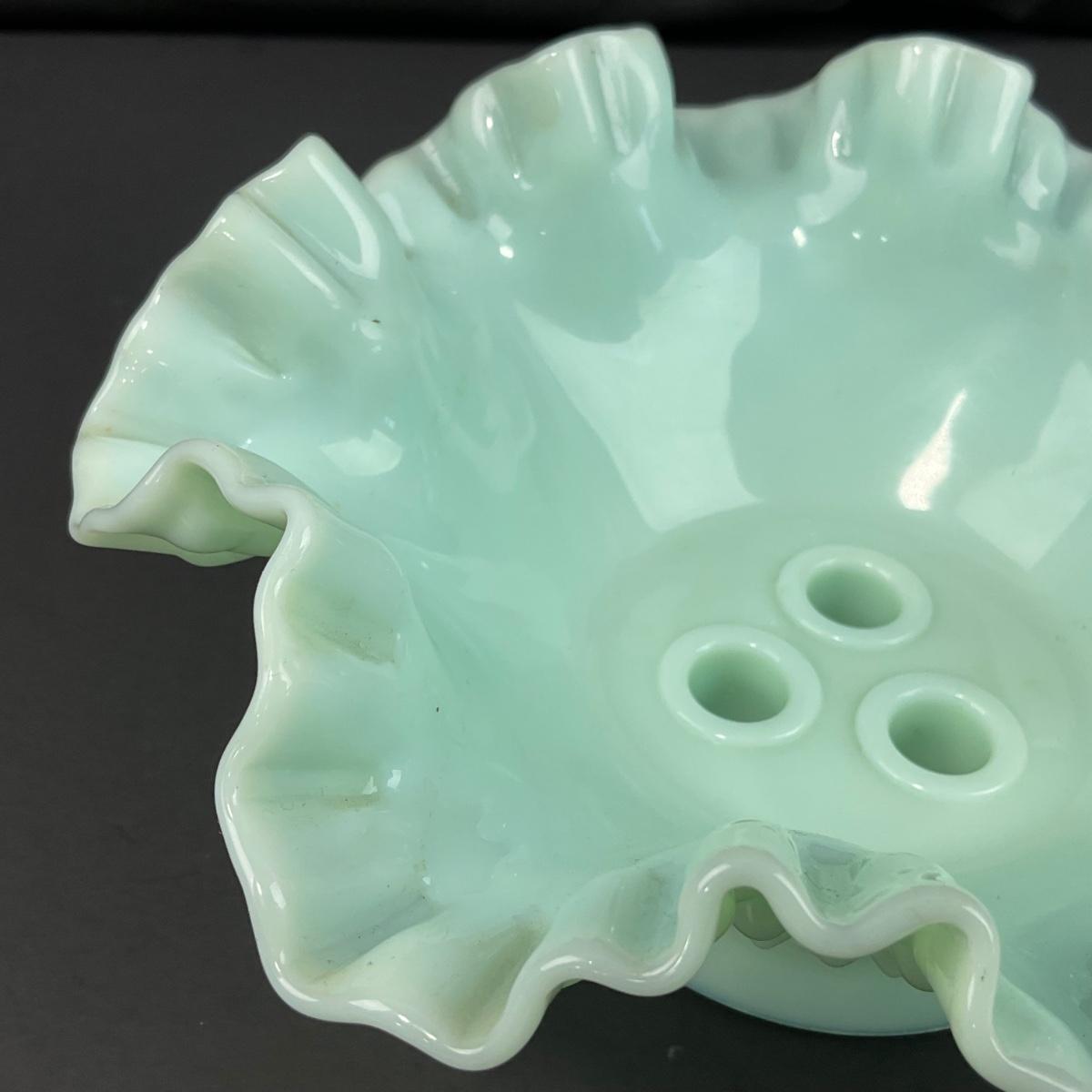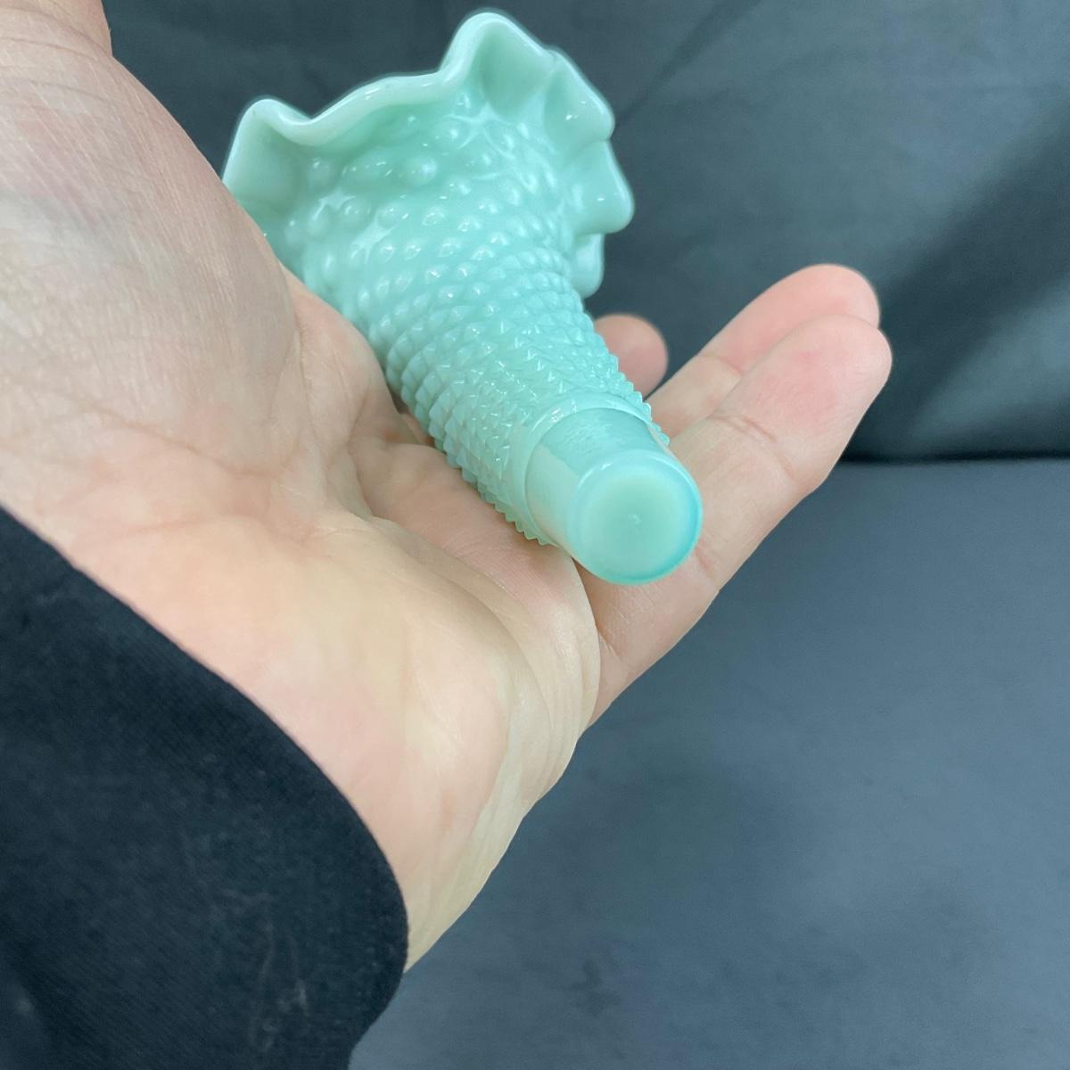 One vintage Fenton green pastel milk glass hobnail three horn Epergne. This piece does have some scuffs, scratches, marks, or slight damage, but otherwise appears to be in great shape. Please see photos for details and condition. Any condition statement is given as a courtesy to a client, is an opinion, and should not be treated as a statement of fact. Reference to condition written, oral or within a condition report shall not be regarded as a full account of condition and may not include all defects, alterations, or restorations. Absence of a condition report does not imply a lot is flawless or lacking imperfections or damage. Katherine’s Auction & Appraisal Service shall have no responsibility for any error or omission. Returns shall not be accepted on the basis of condition. ::: Shipping is available on this lot. If you require shipping you must let us know at the close of the auction. We will coordinate with you after the item has been won. Shipping fees will include insurance up to or exceeding the value of all items being mailed. If you have any questions regarding this lot please contact the auctioneer either via this website, by direct email or by phone. PICK UP TIMES and other important information can be found in the TERMS and DESCRIPTION of the auction. Please take a look for pertinent information. Thanks!