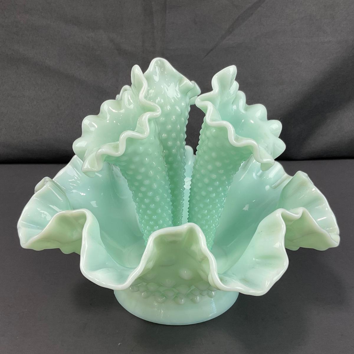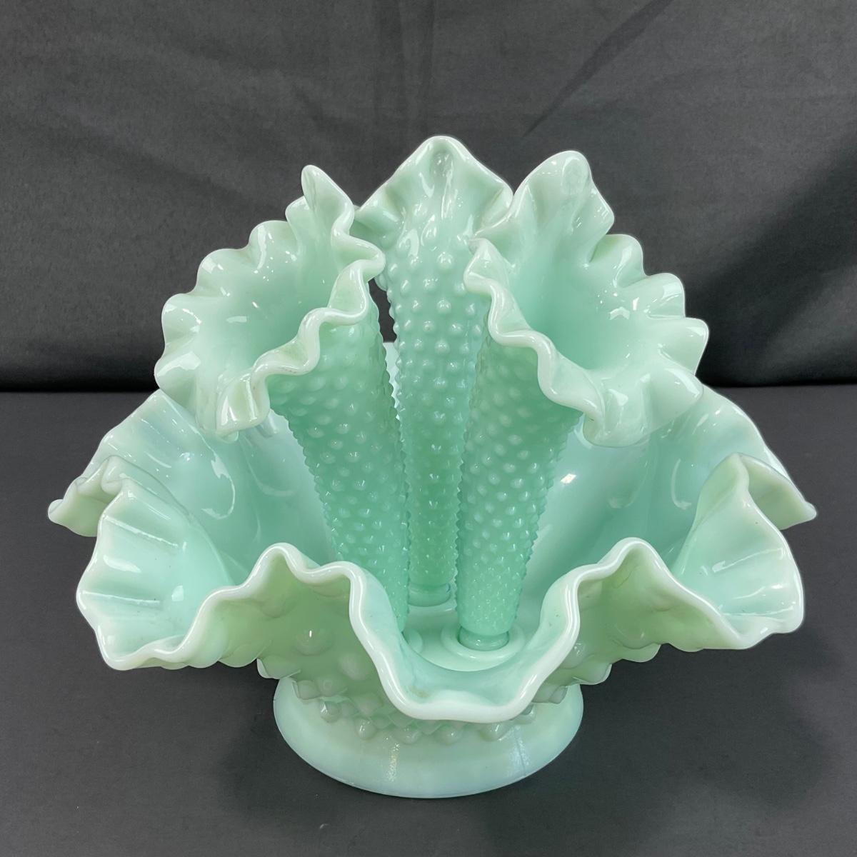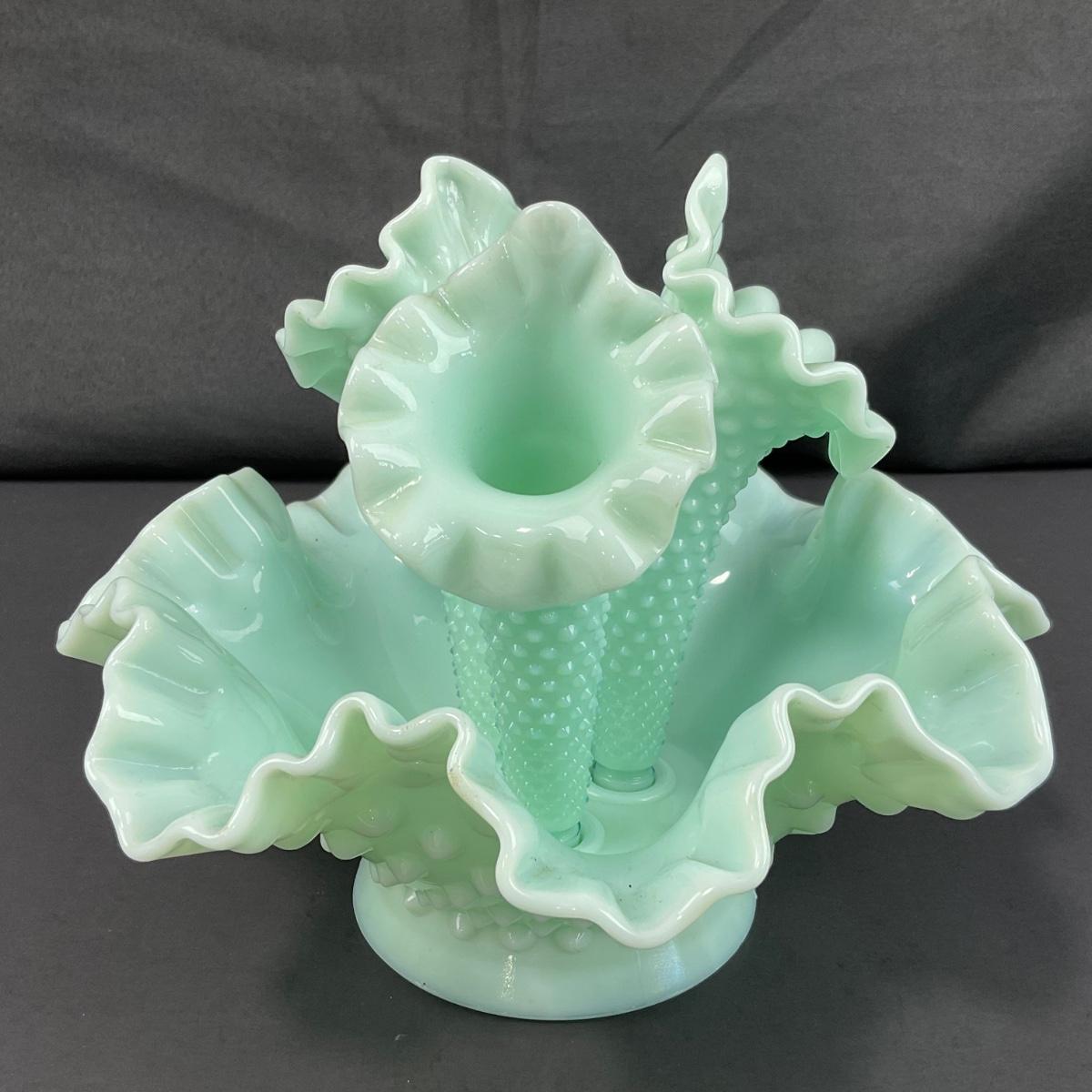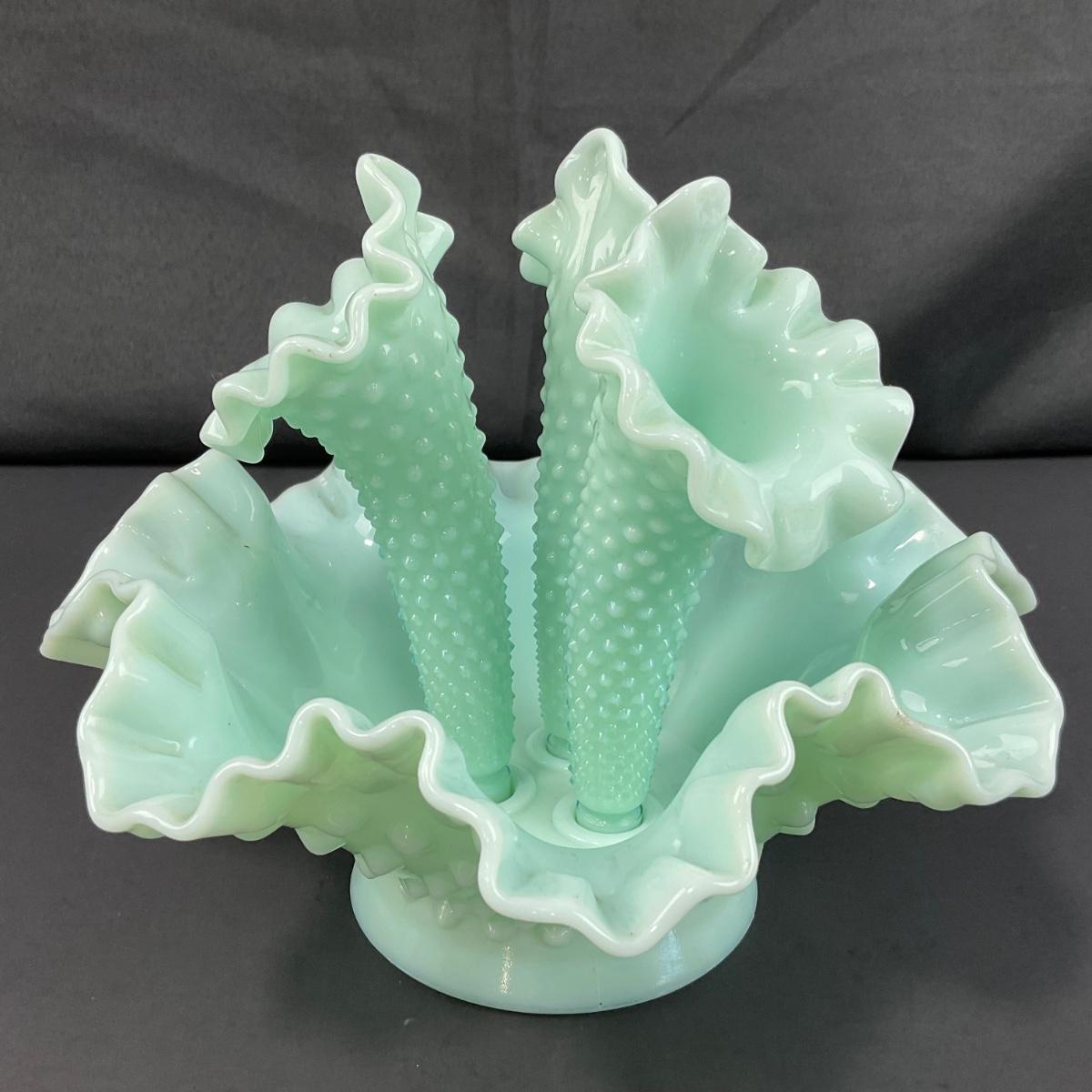 -128- FENTON | Green Pastel Milk Glass Hobnail Three Horn Epergne