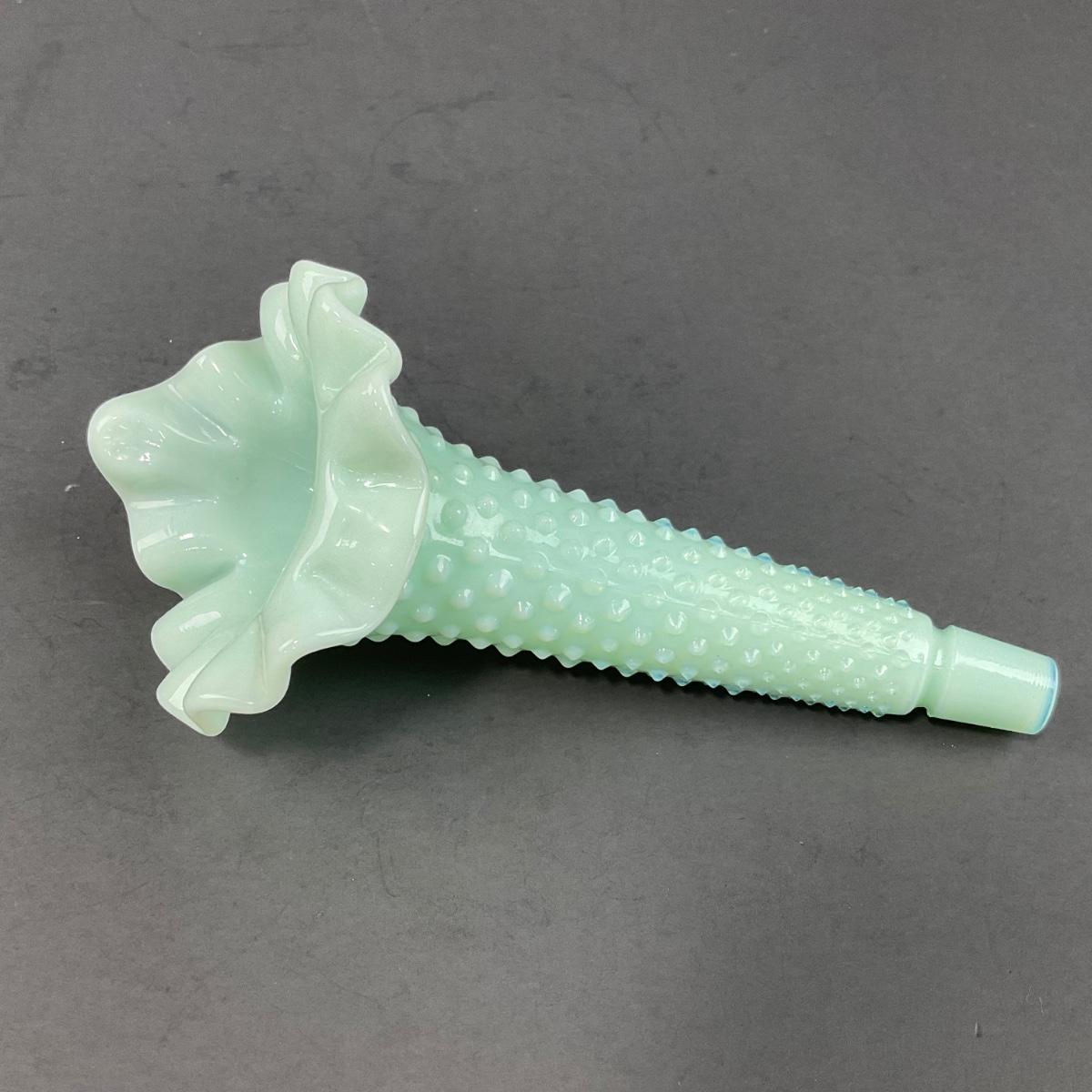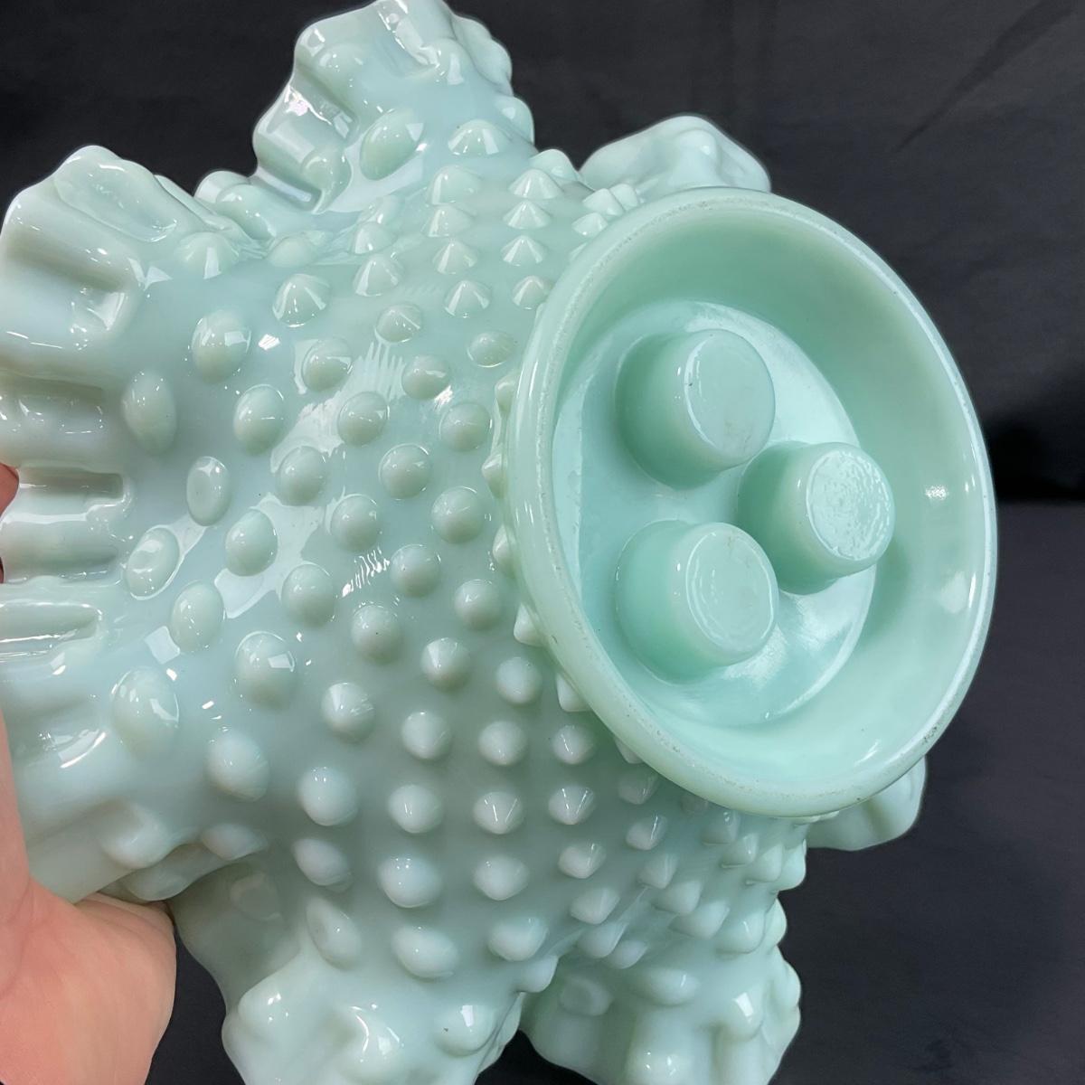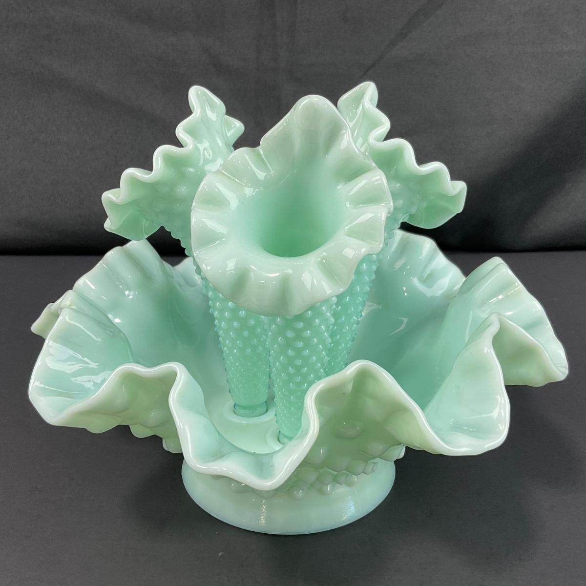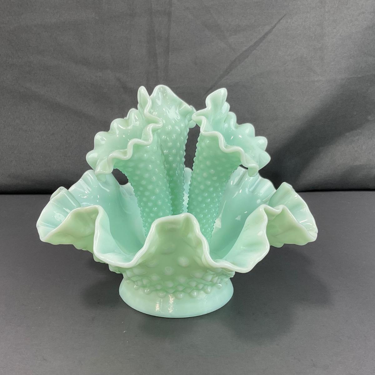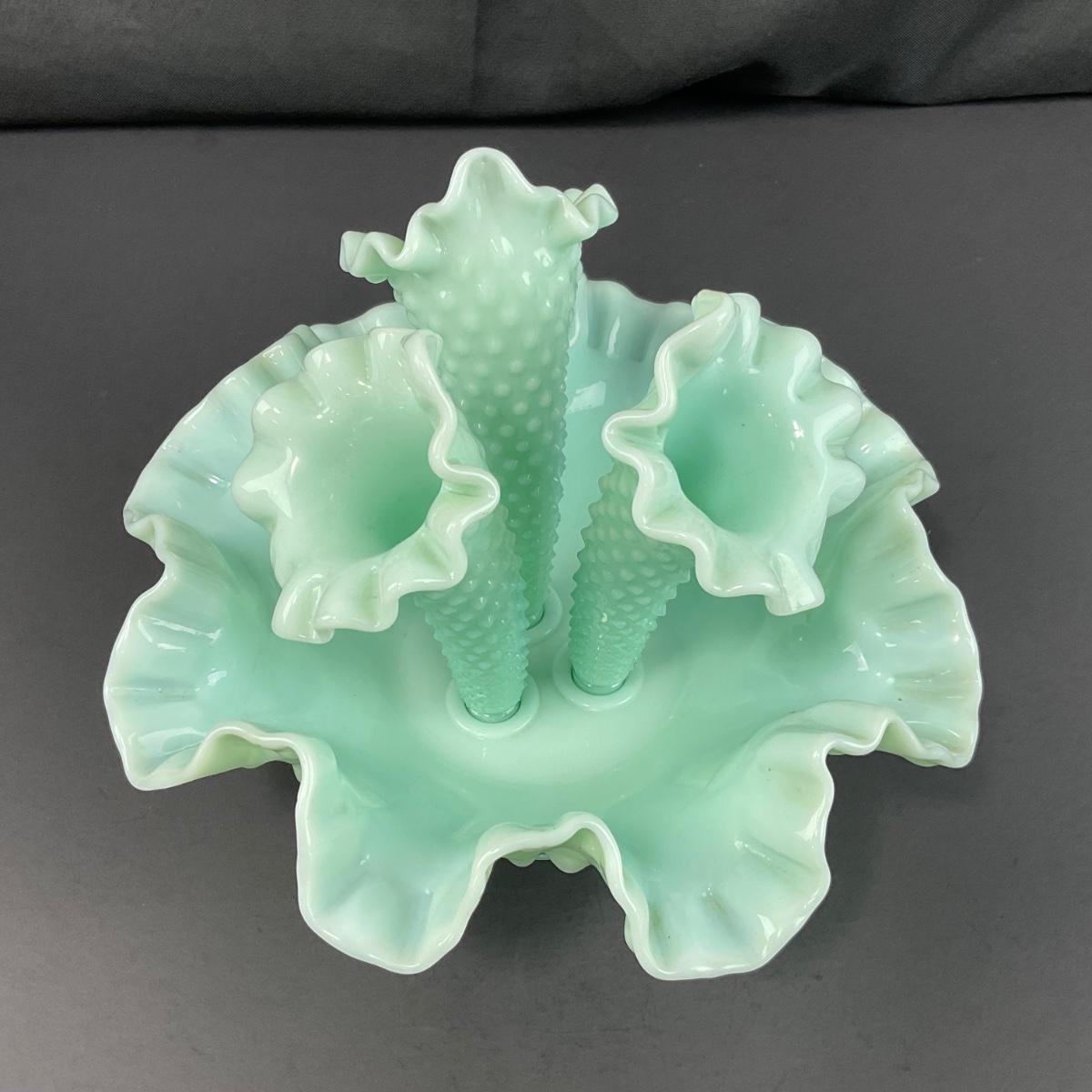 -128- FENTON | Green Pastel Milk Glass Hobnail Three Horn Epergne