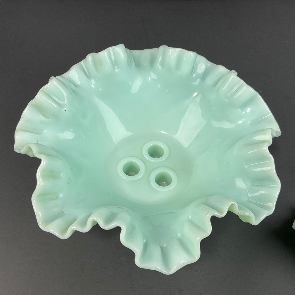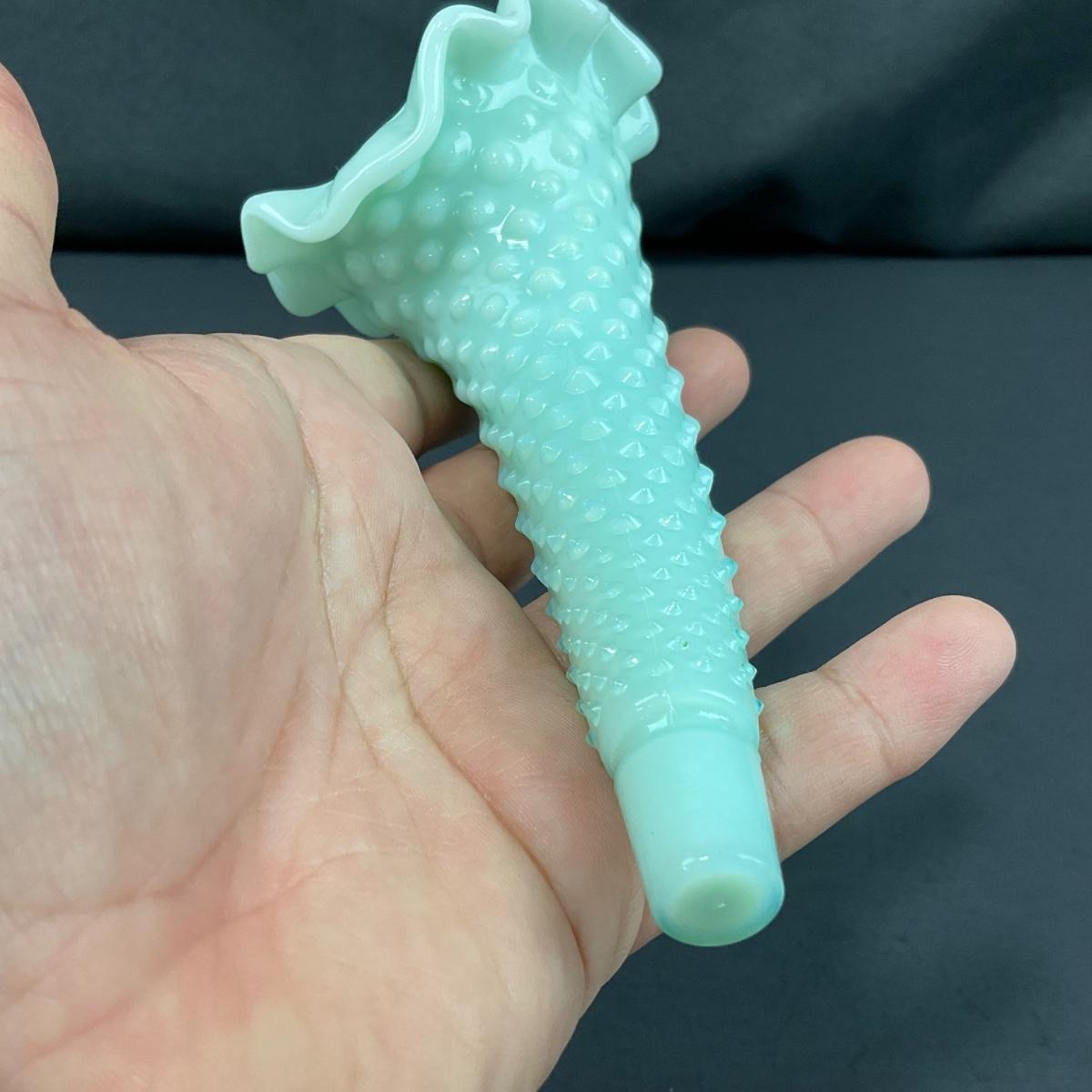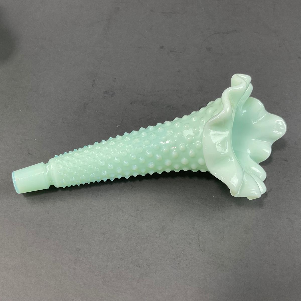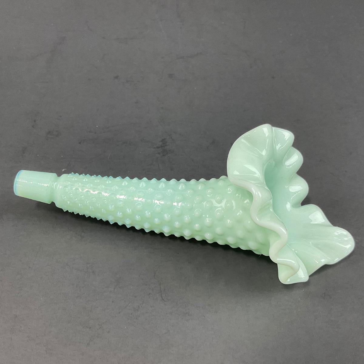 -128- FENTON | Green Pastel Milk Glass Hobnail Three Horn Epergne