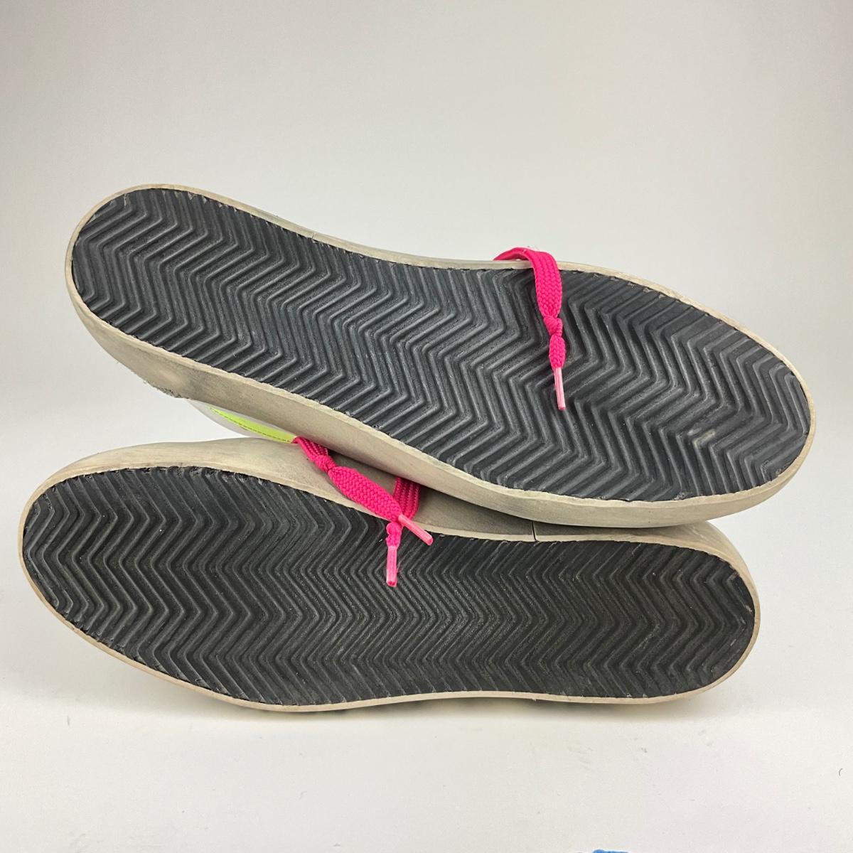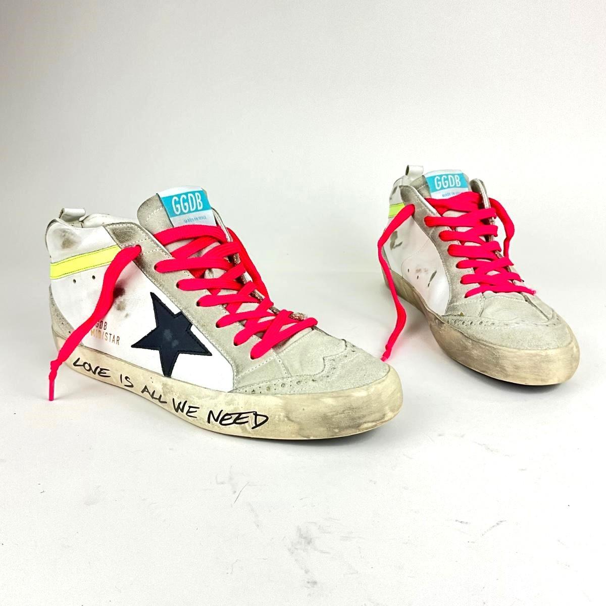 Worn Golden Goose Midstar neon multicolor accent sneakers with "Love is all we need" in both outside soles, Made in Venice, Italy.