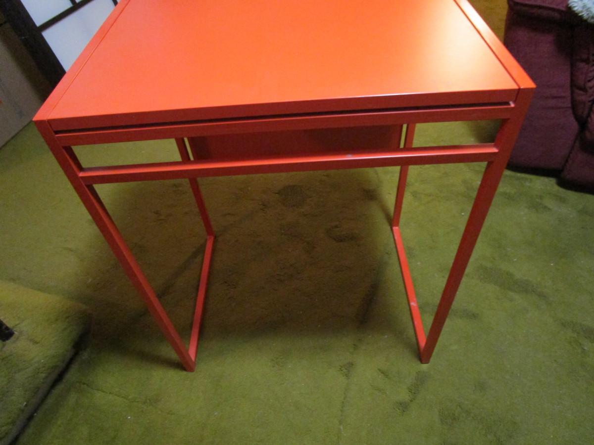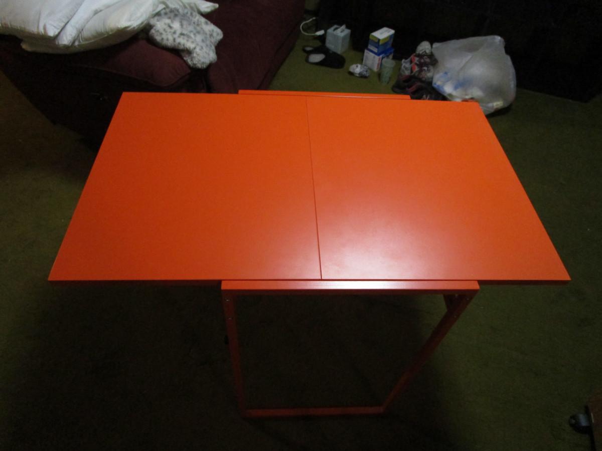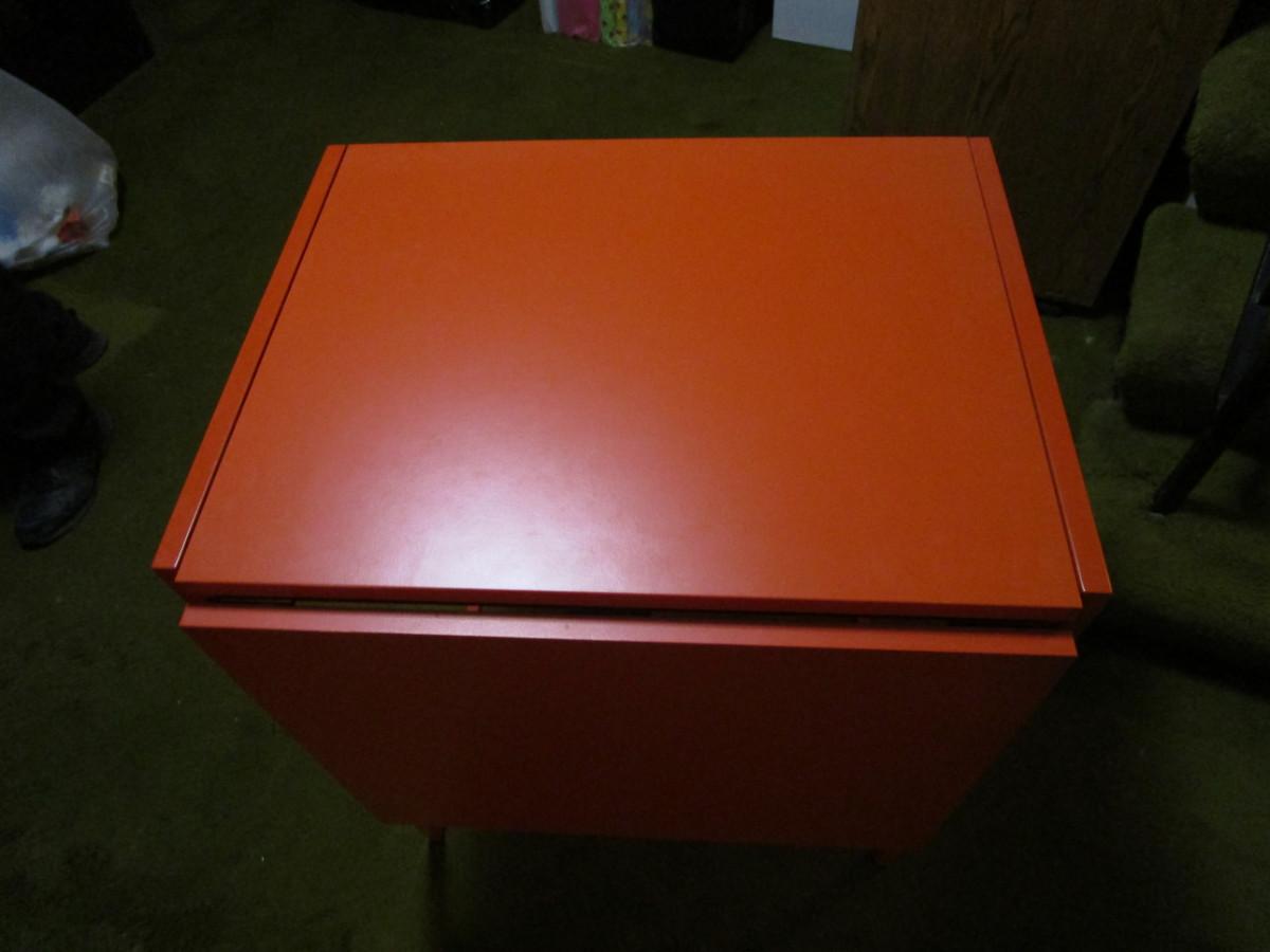 #128 Like New Great Orange Table, with a sliding expansion top 19 w x 23 1/2" across and 29" high expanses out to a total of 36 1/4" Like new