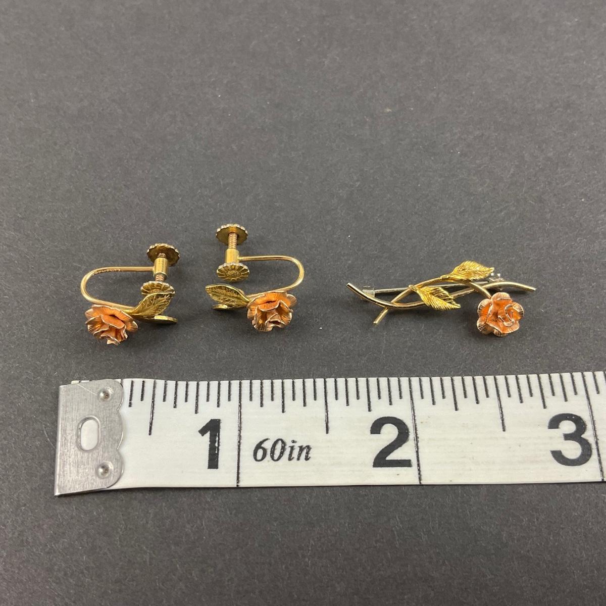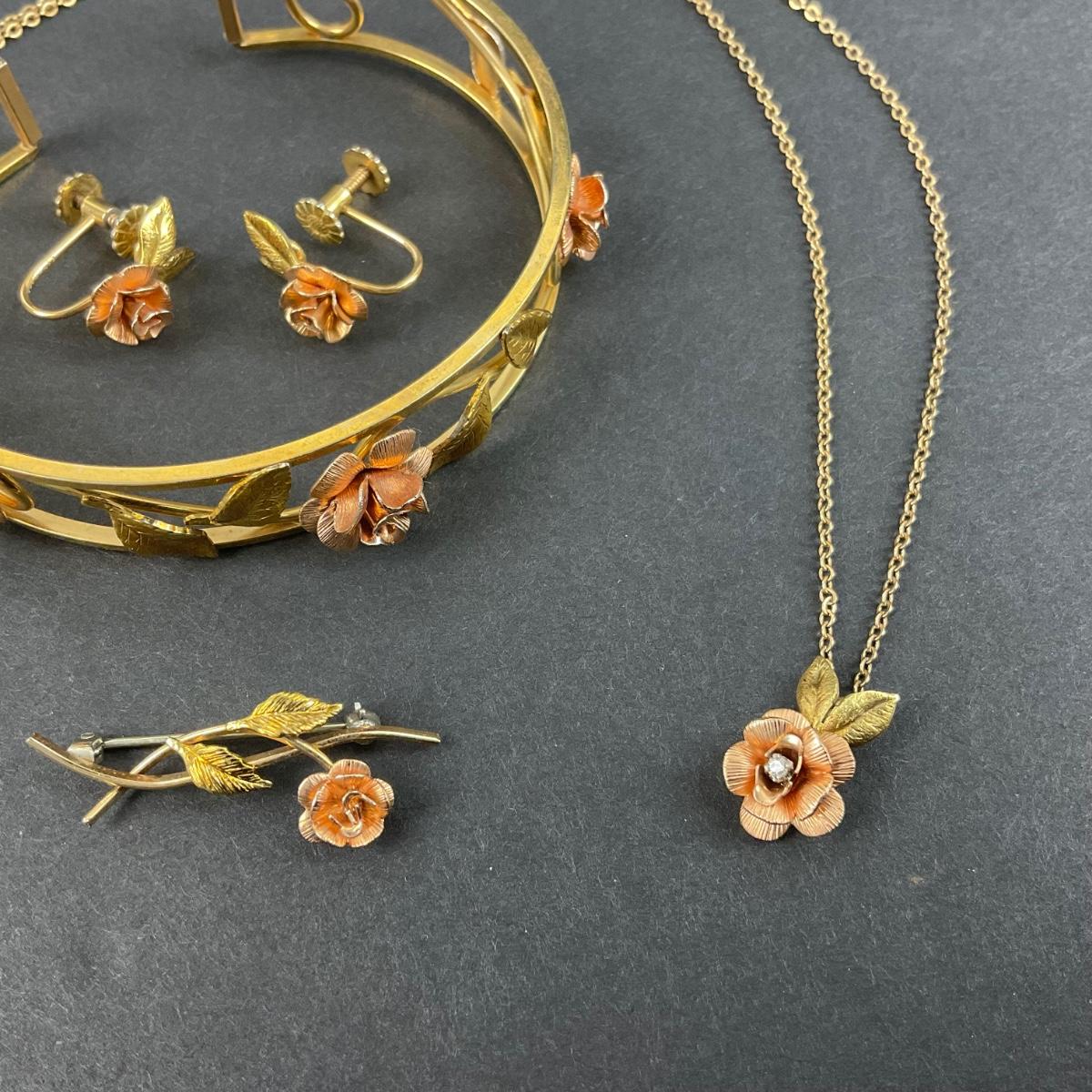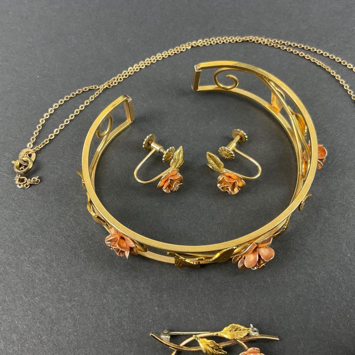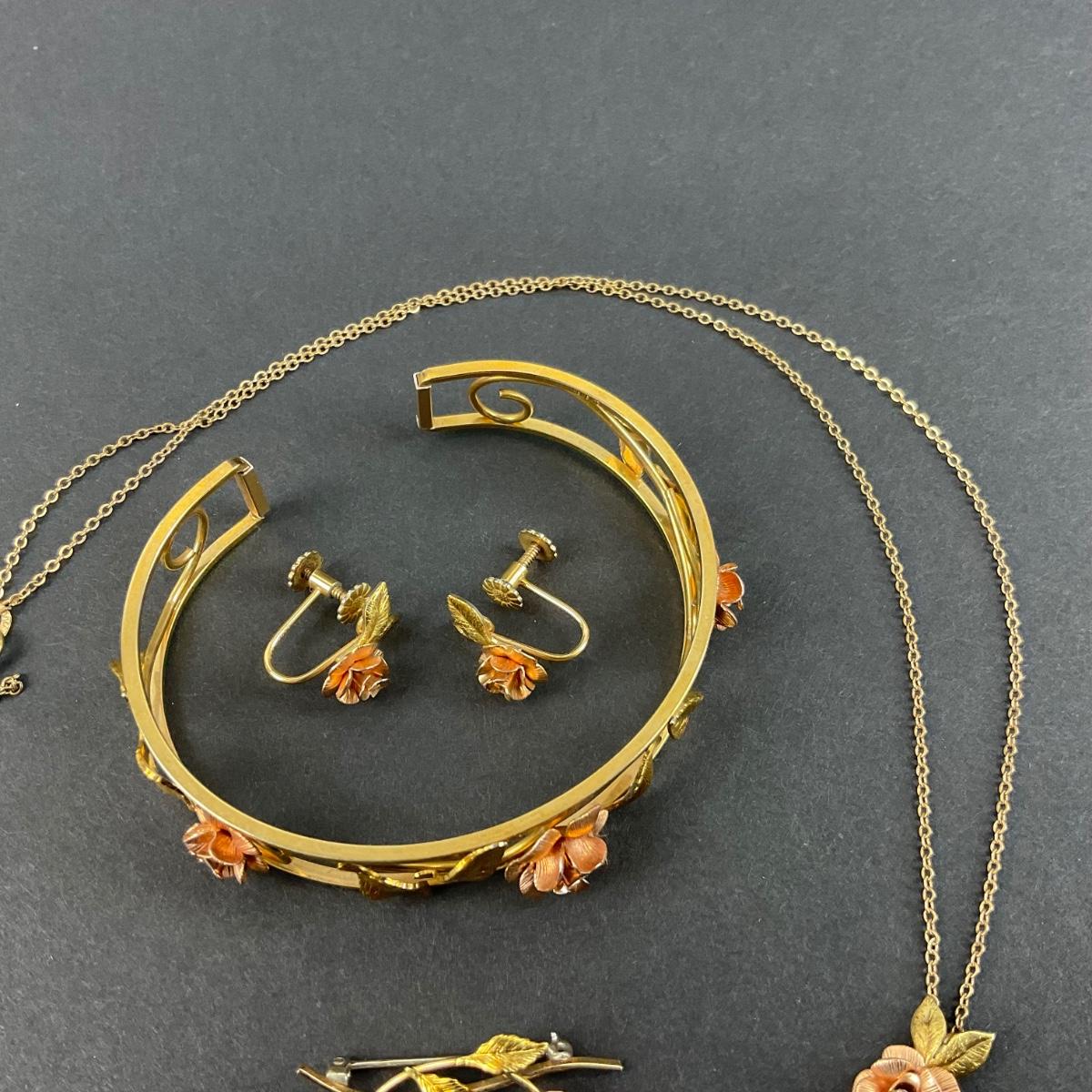 One vintage Krementz rose gold tone bracelet, earrings, pin, and necklace set. The Necklace is a 1/32 carat Diamond (Tested). Please see photos for details and condition. Any condition statement is given as a courtesy to a client, is an opinion, and should not be treated as a statement of fact. Reference to condition written, oral or within a condition report shall not be regarded as a full account of condition and may not include all defects, alterations, or restorations. Absence of a condition report does not imply a lot is flawless or lacking imperfections or damage. Katherine’s Auction & Appraisal Service shall have no responsibility for any error or omission. Returns shall not be accepted on the basis of condition. ::: Shipping is available on this lot. If you require shipping you must let us know at the close of the auction. We will coordinate with you after the item has been won. Shipping fees will include insurance up to or exceeding the value of all items being mailed. If you have any questions regarding this lot please contact the auctioneer either via this website, by direct email or by phone. PICK UP TIMES and other important information can be found in the TERMS and DESCRIPTION of the auction. Please take a look for pertinent information. Thanks!