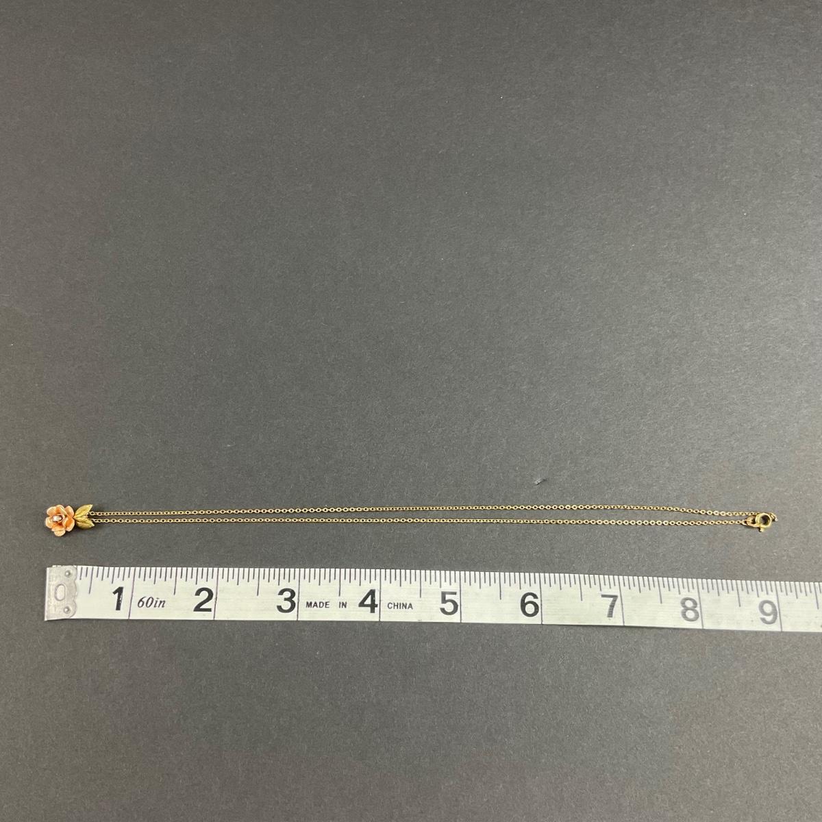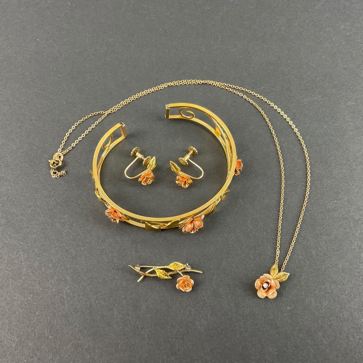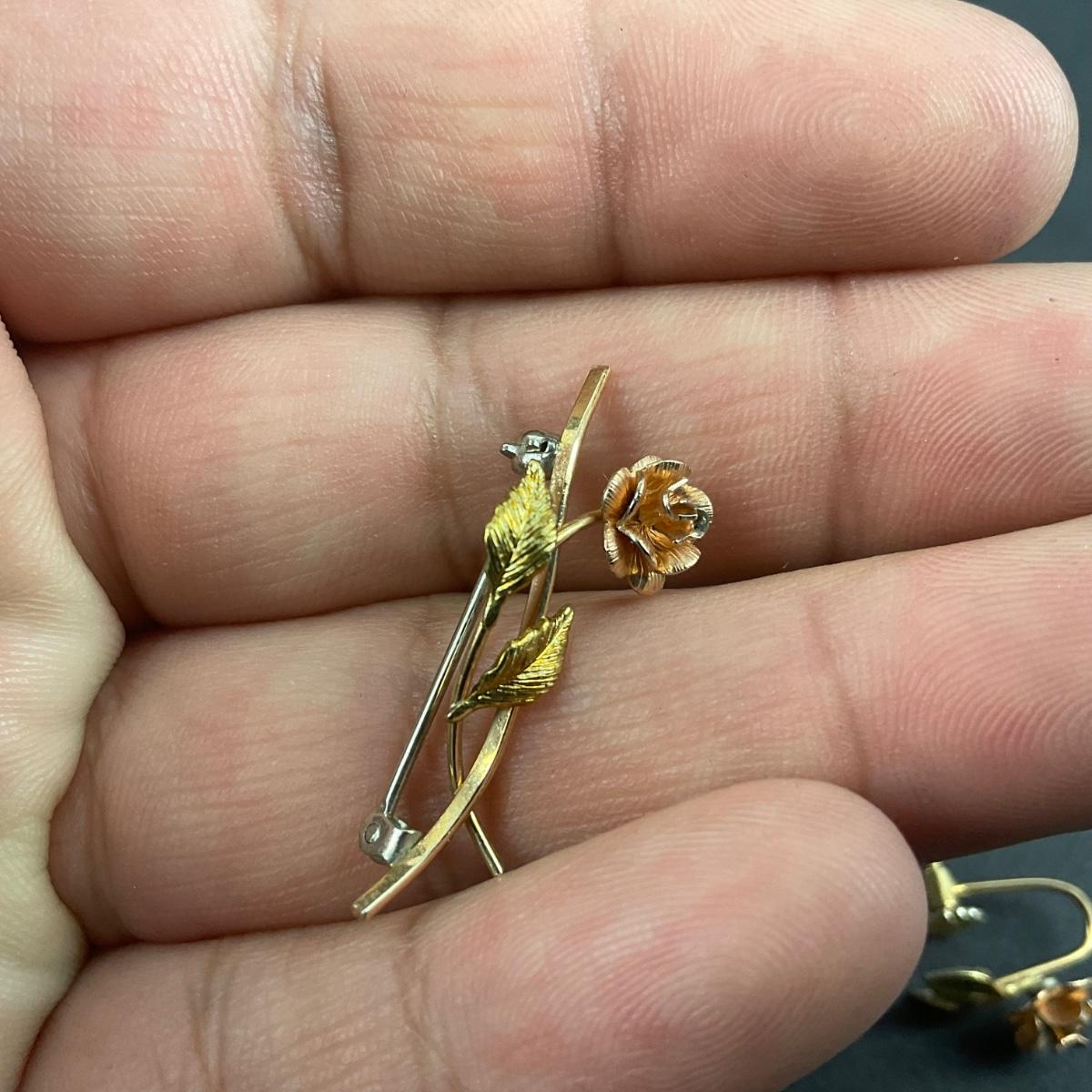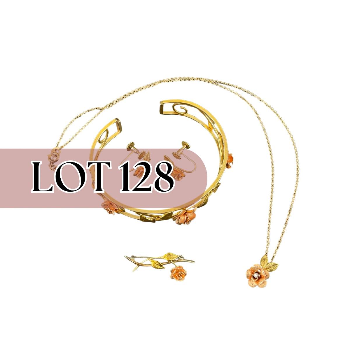 One vintage Krementz rose gold tone bracelet, earrings, pin, and necklace set. The Necklace is a 1/32 carat Diamond (Tested). Please see photos for details and condition. Any condition statement is given as a courtesy to a client, is an opinion, and should not be treated as a statement of fact. Reference to condition written, oral or within a condition report shall not be regarded as a full account of condition and may not include all defects, alterations, or restorations. Absence of a condition report does not imply a lot is flawless or lacking imperfections or damage. Katherine’s Auction & Appraisal Service shall have no responsibility for any error or omission. Returns shall not be accepted on the basis of condition. ::: Shipping is available on this lot. If you require shipping you must let us know at the close of the auction. We will coordinate with you after the item has been won. Shipping fees will include insurance up to or exceeding the value of all items being mailed. If you have any questions regarding this lot please contact the auctioneer either via this website, by direct email or by phone. PICK UP TIMES and other important information can be found in the TERMS and DESCRIPTION of the auction. Please take a look for pertinent information. Thanks!