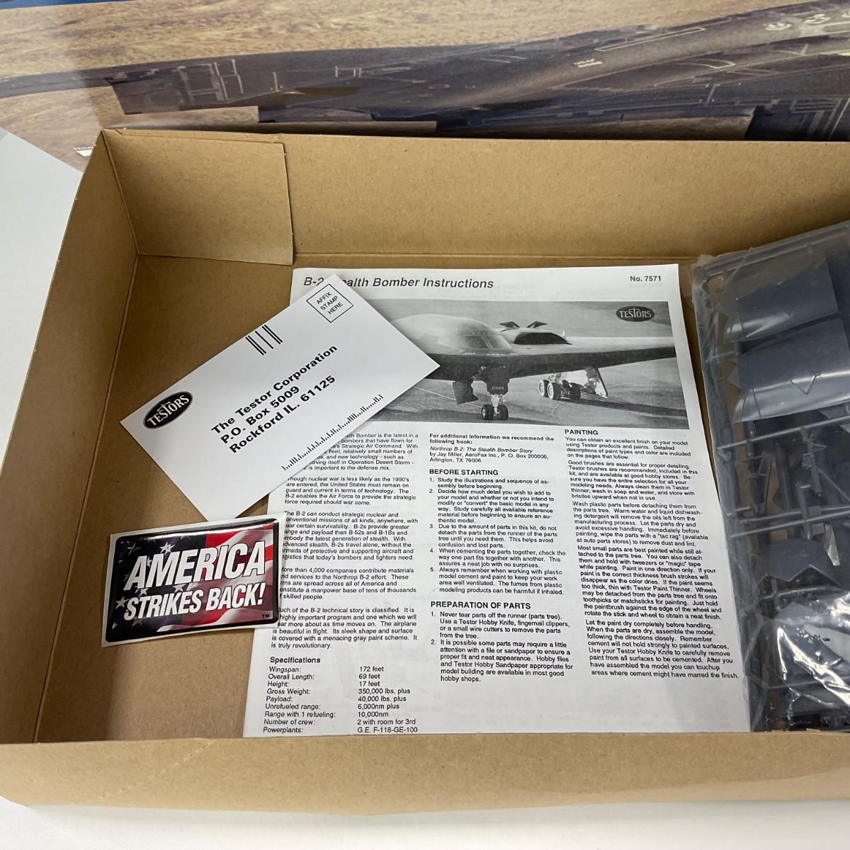 One vintage B-2 Stealth Bomber model kit 1:72 scale. Model kit is believed to be complete however not guaranteed. Box is 12 inches by 20 inches. Please see photos for details and condition. ::: Shipping is available on this lot. If you require shipping you must let us know at the close of the auction. We will coordinate with you after the item has been won. Shipping fees will include insurance up to or exceeding the value of all items being mailed. If you have any questions regarding this lot please contact the auctioneer either via this website, by direct email or by phone. PICK UP TIMES and other important information can be found in the TERMS and DESCRIPTION of the auction. Please take a look for pertinent information. Thanks!