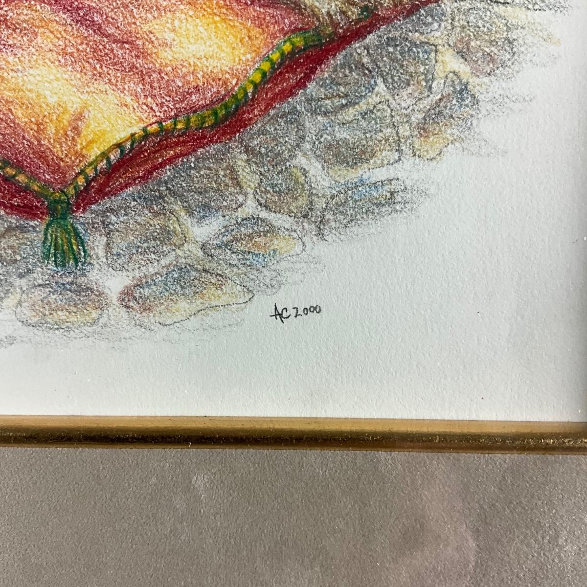Pencil signed the year 2000 initials AC. Matted and framed with a gold gilt with hints of red.