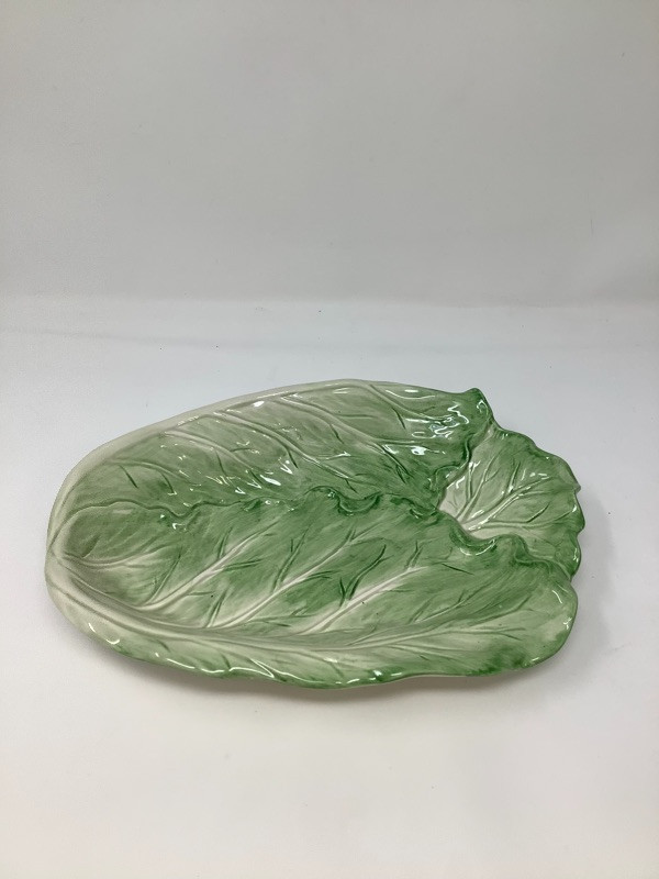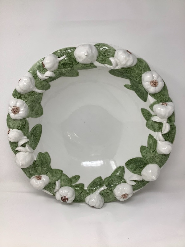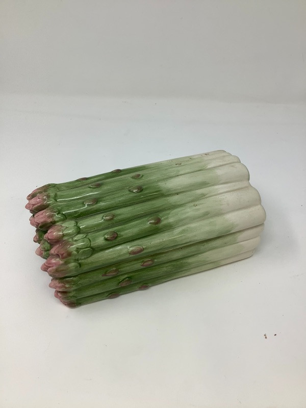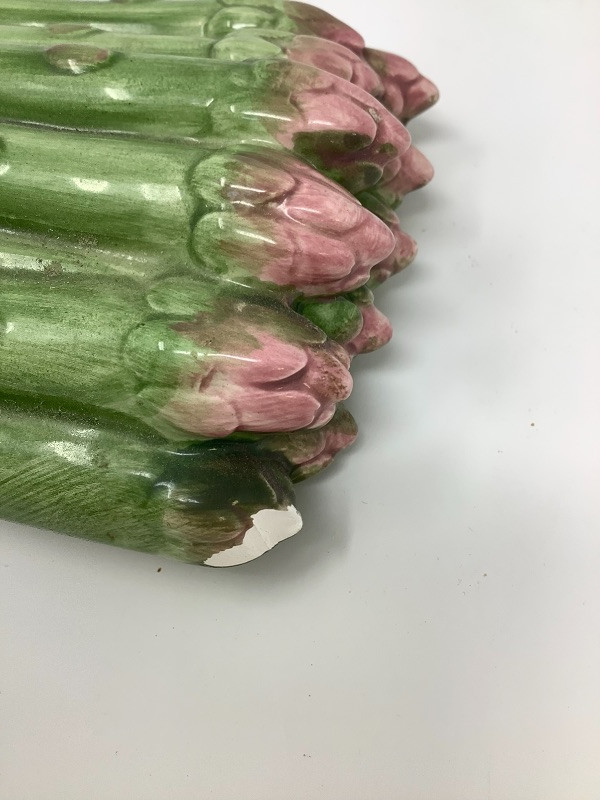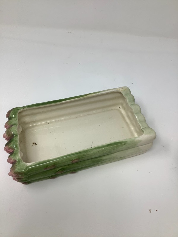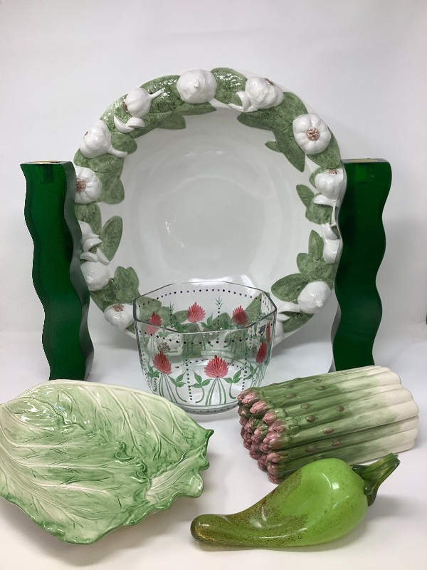 Garlic bowl made in Italy measures 17” radius Fitz and Floyd lettuce platter 11.5” long, Hand painted floral glass bowl by Orrefors Sweden and a small chili. The asparagus bowl has a small chip shown in the pictures