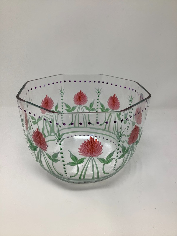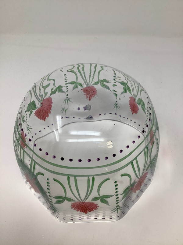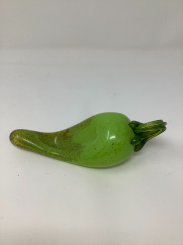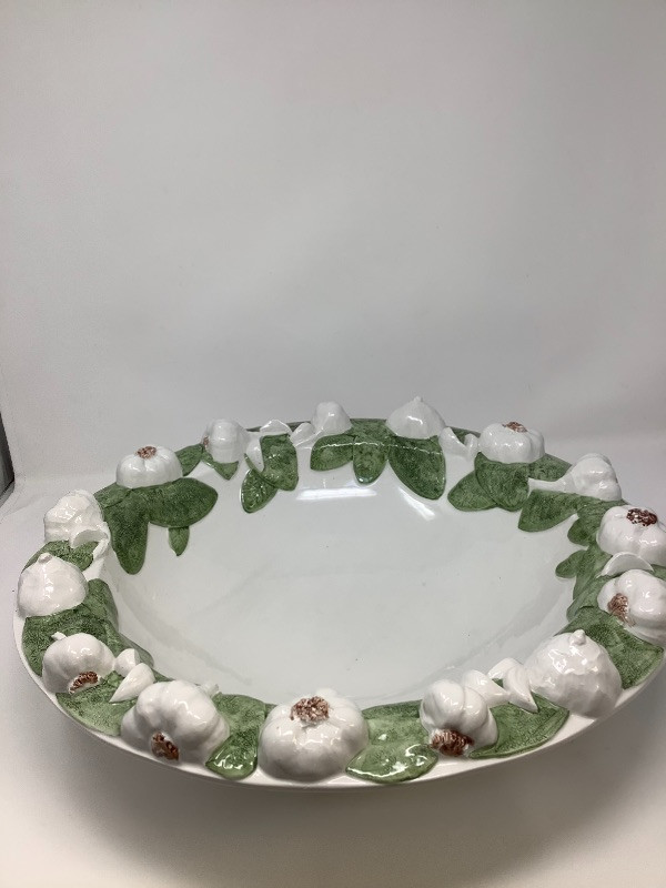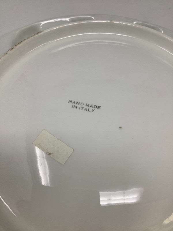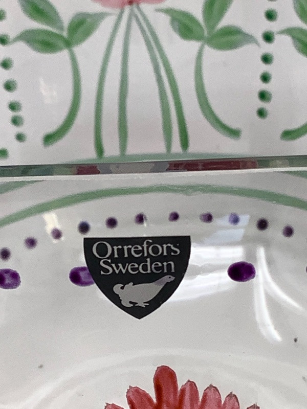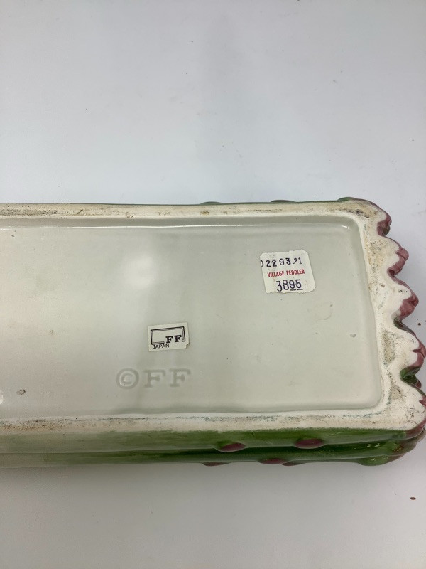 Garlic bowl made in Italy measures 17” radius Fitz and Floyd lettuce platter 11.5” long, Hand painted floral glass bowl by Orrefors Sweden and a small chili. The asparagus bowl has a small chip shown in the pictures