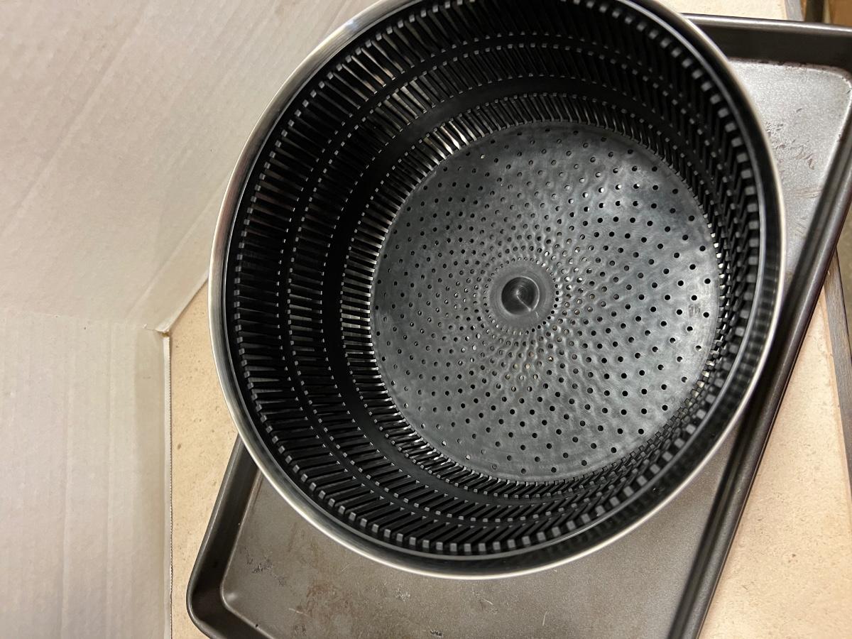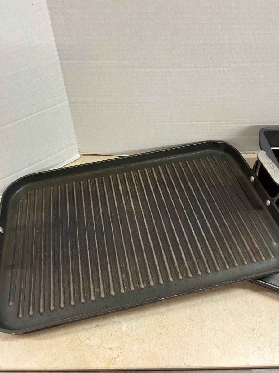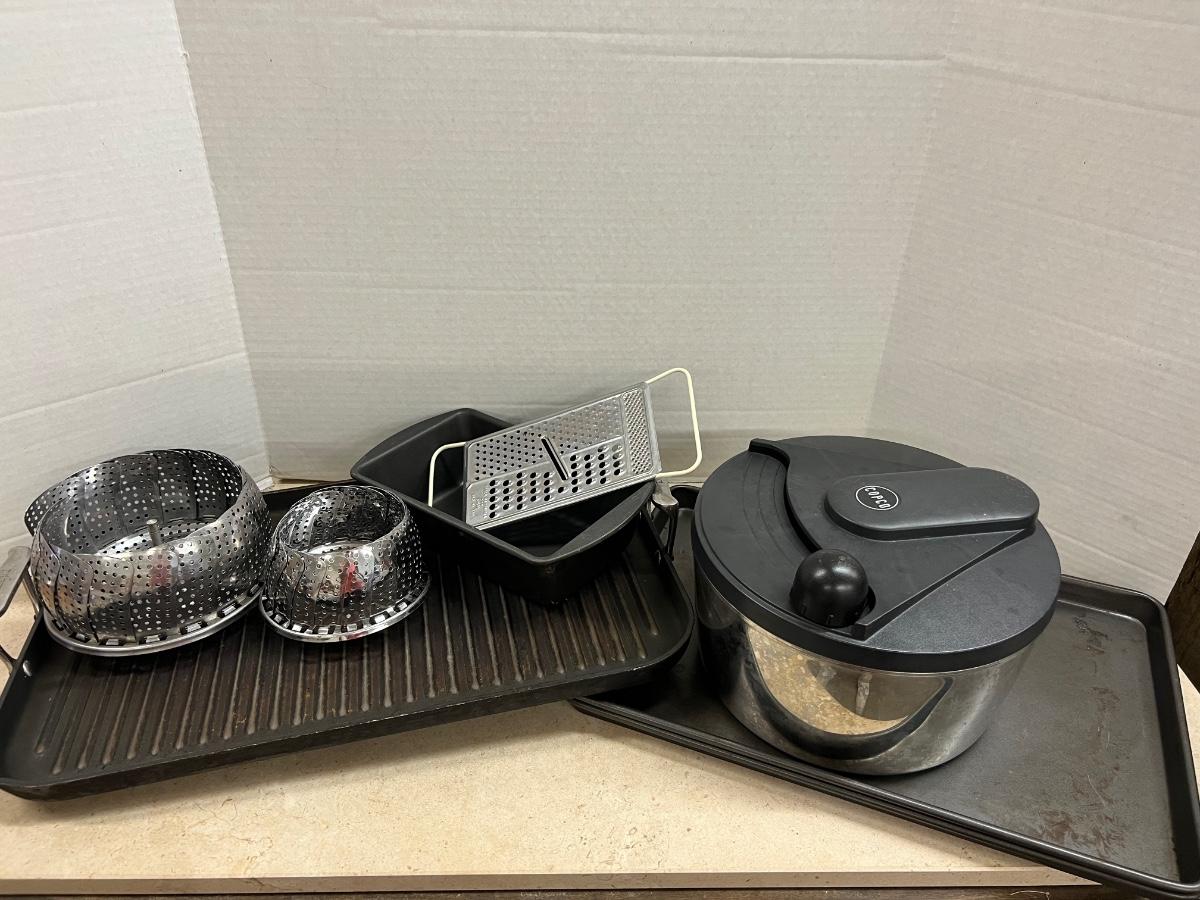 All clad bake pan with two cookie sheets, steamer inserts, copco salad spinner , loaf pan and shredder