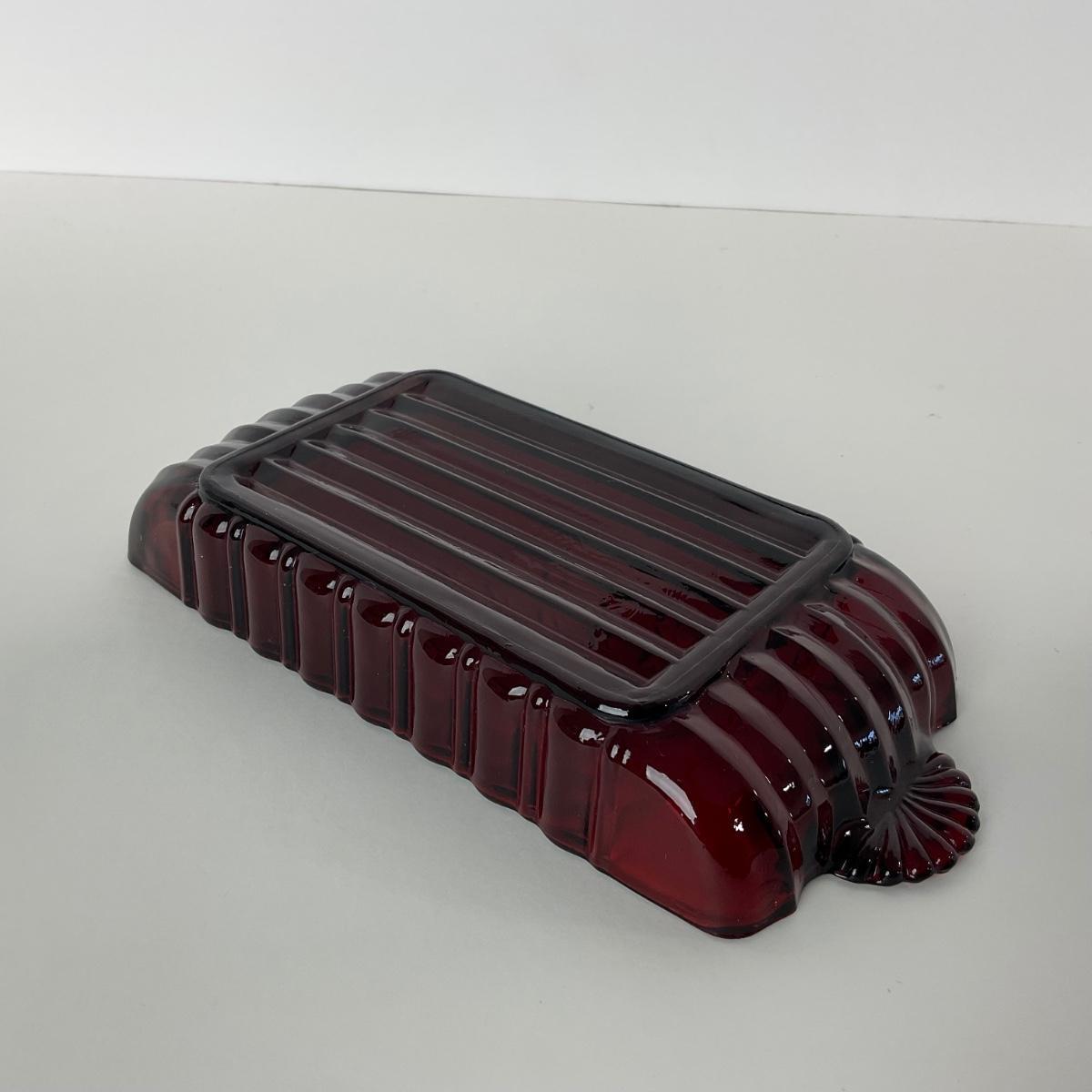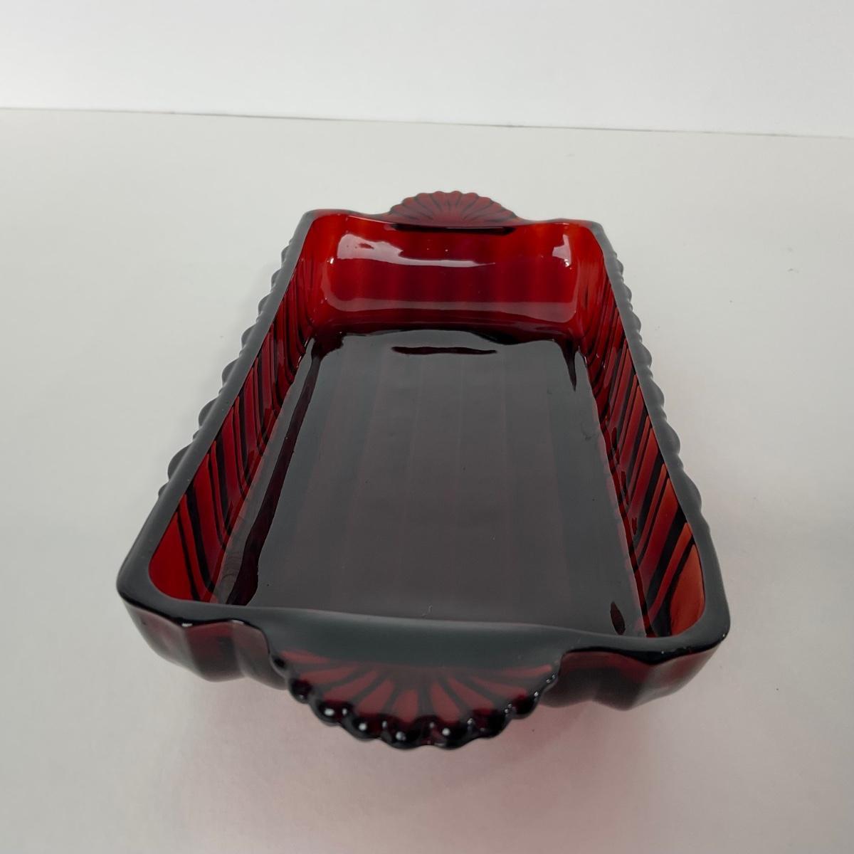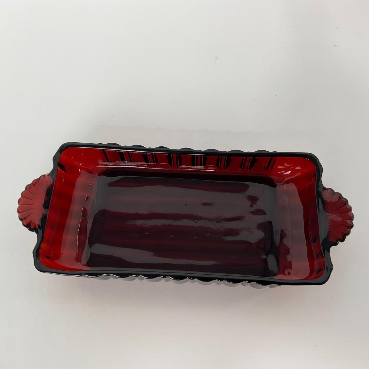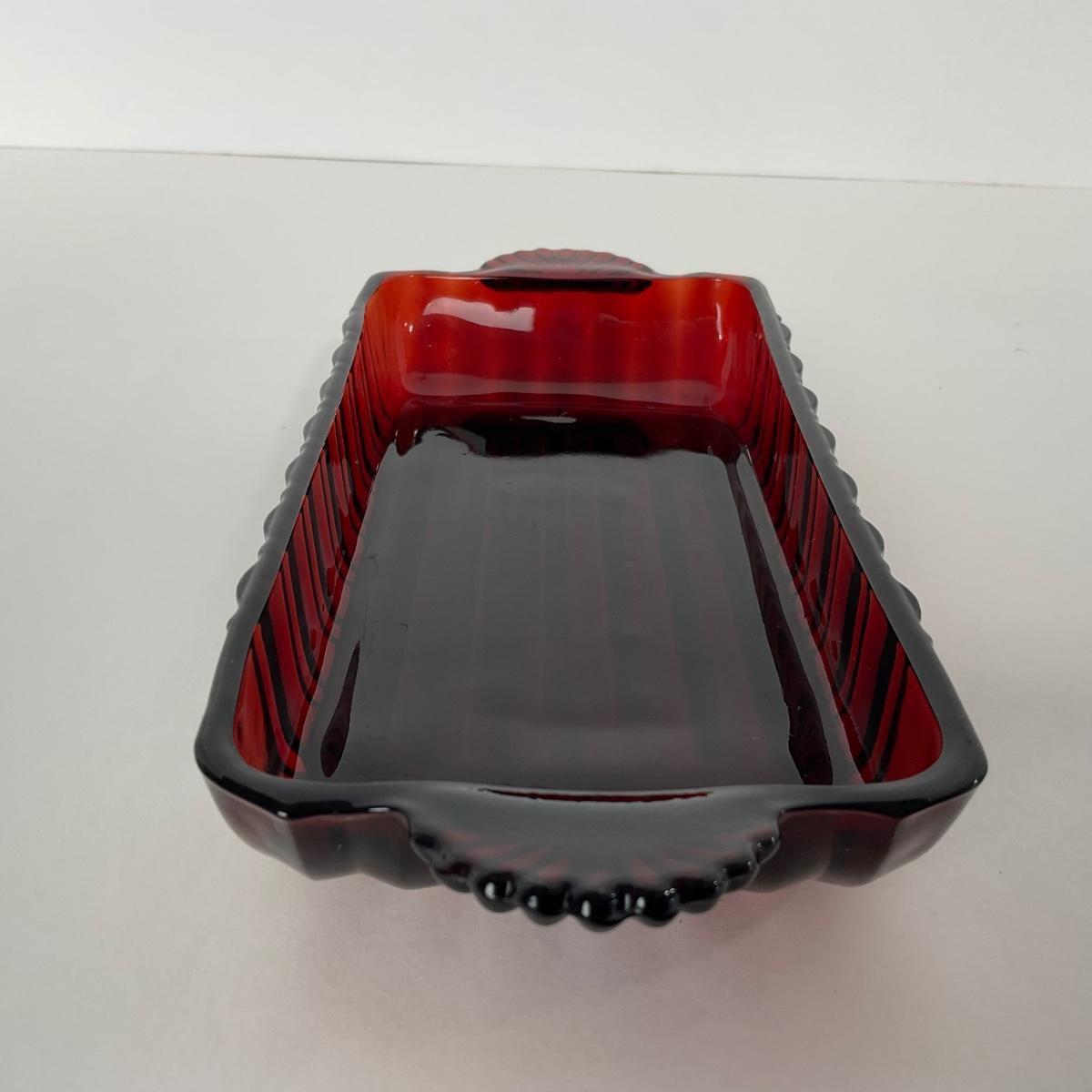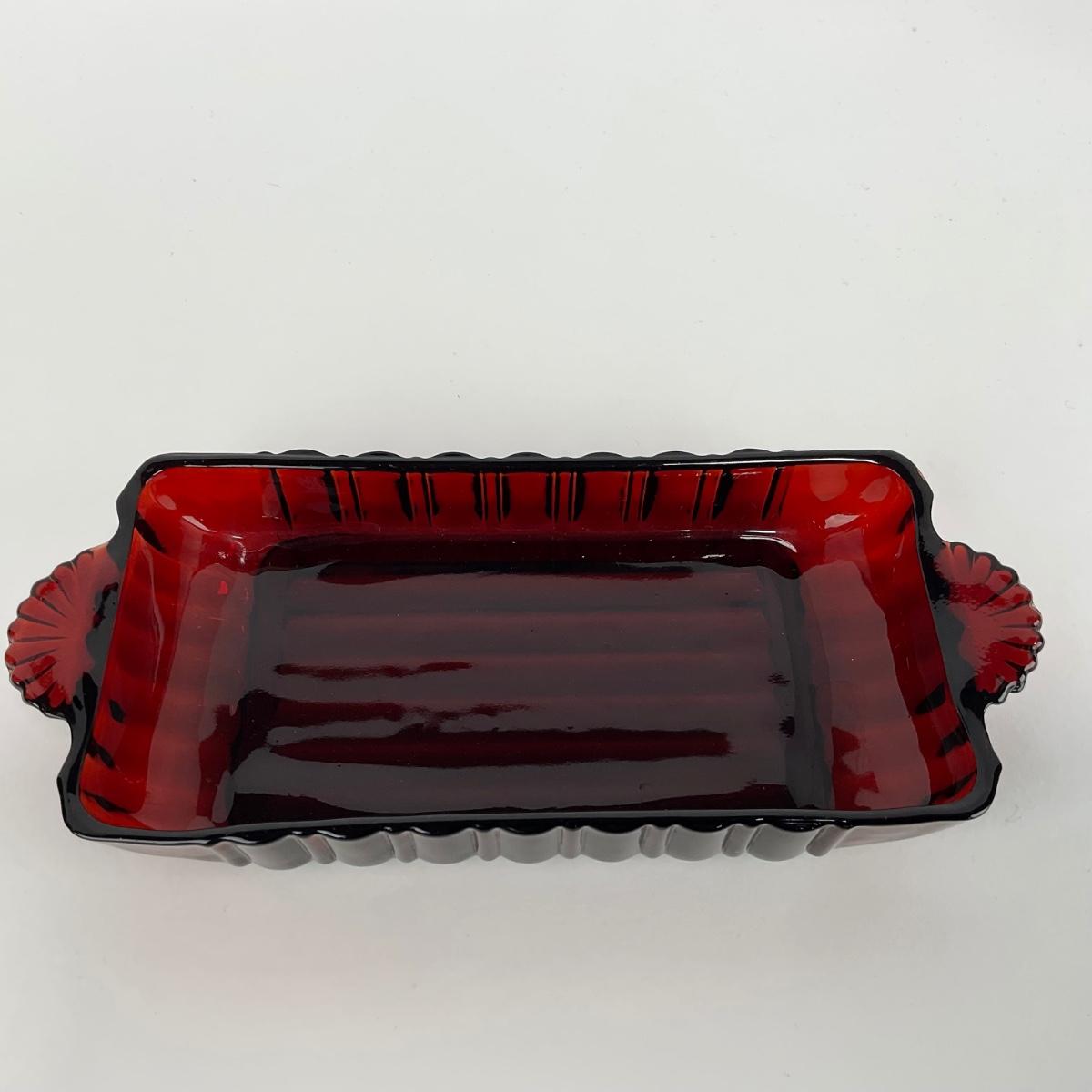 One Anchor Hocking ruby red star burst butter, cheese, or relish dish. 8 3/4 inches long by 1 1/4 inches tall and 3 1/2 inches wide. This piece has no damage, and appears to be in great shape with no visable chips, cracks, or broken pieces. Please see photos for details and condition. Any condition statement is given as a courtesy to a client, is an opinion, and should not be treated as a statement of fact. Reference to condition written, oral or within a condition report shall not be regarded as a full account of condition and may not include all defects, alterations, or restorations. Absence of a condition report does not imply a lot is flawless or lacking imperfections or damage. Katherine’s Auction & Appraisal Service shall have no responsibility for any error or omission. Returns shall not be accepted on the basis of condition. ::: Shipping is available on this lot. If you require shipping you must let us know at the close of the auction. We will coordinate with you after the item has been won. Shipping fees will include insurance up to or exceeding the value of all items being mailed. If you have any questions regarding this lot please contact the auctioneer either via this website, by direct email or by phone. PICK UP TIMES and other important information can be found in the TERMS and DESCRIPTION of the auction. Please take a look for pertinent information. Thanks!