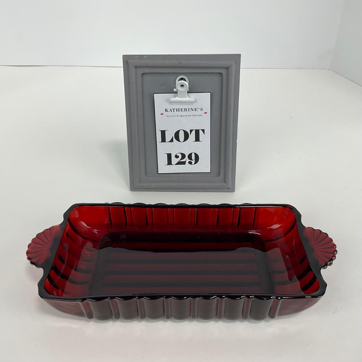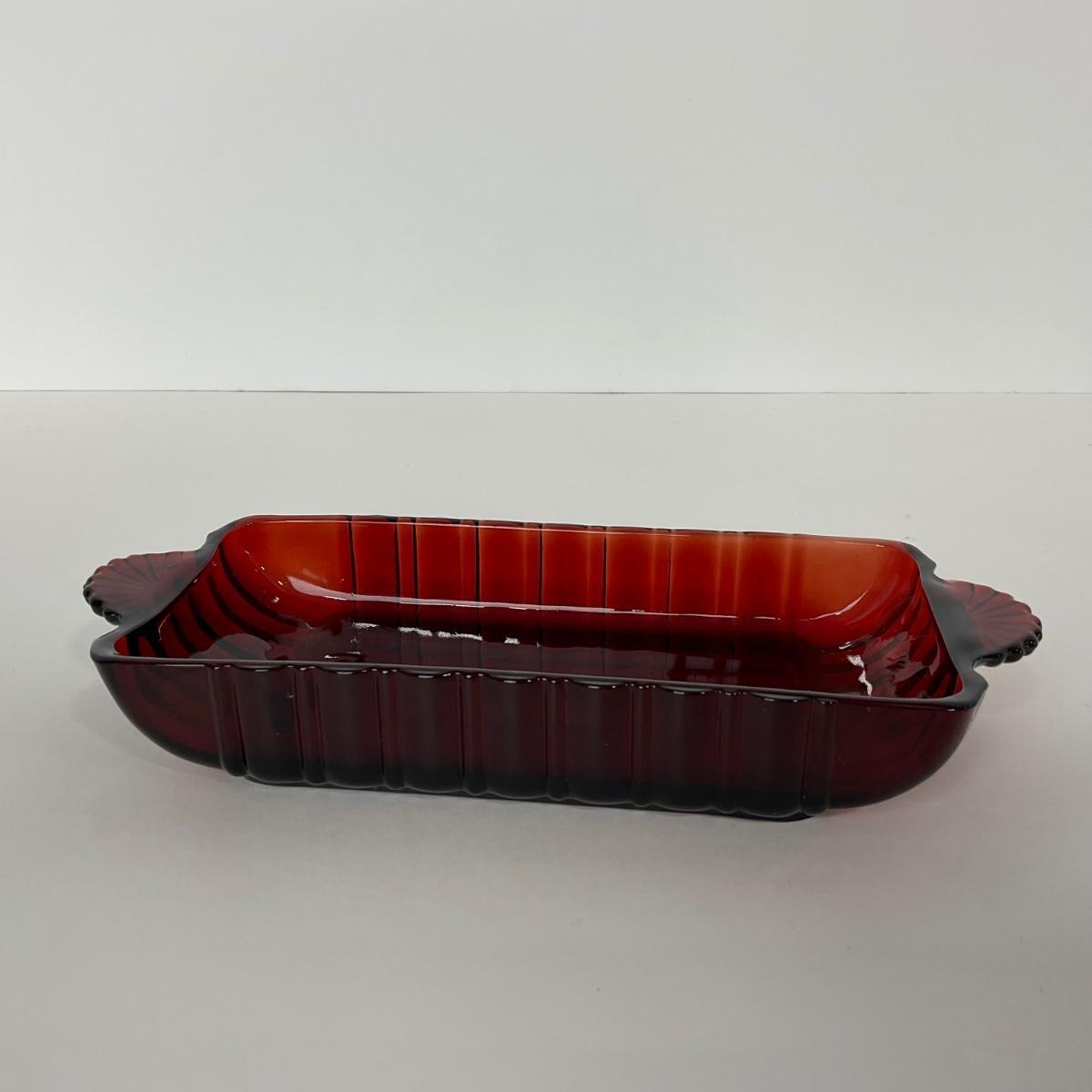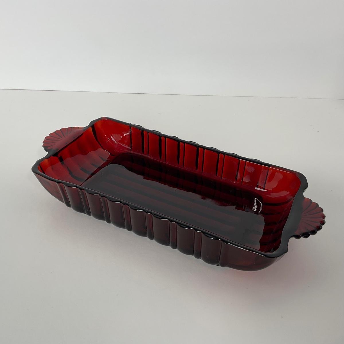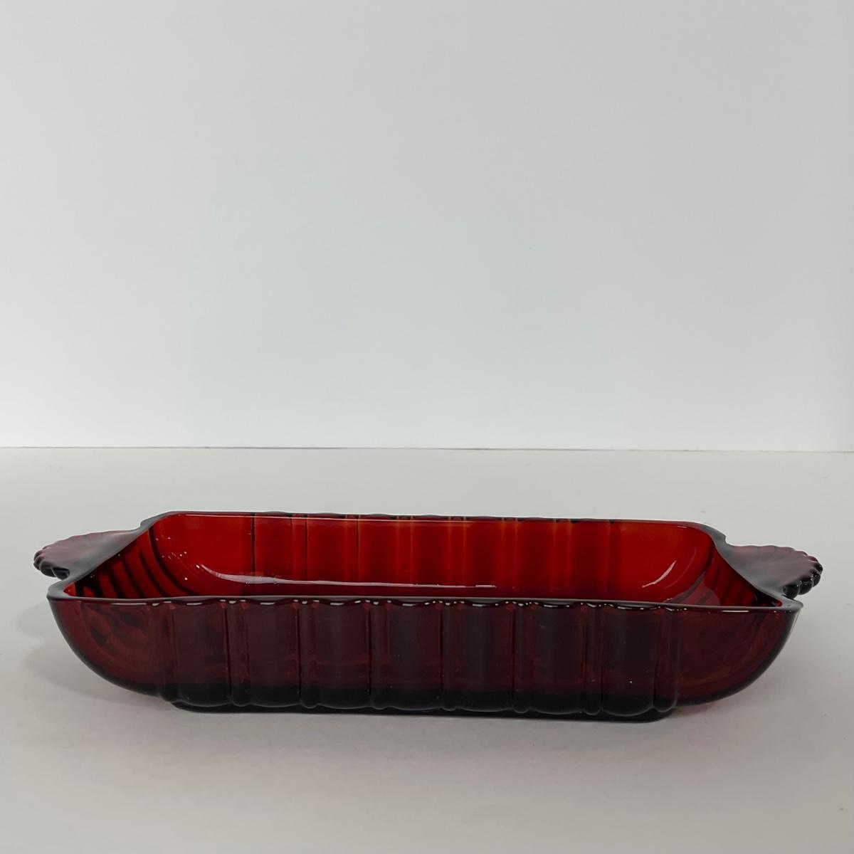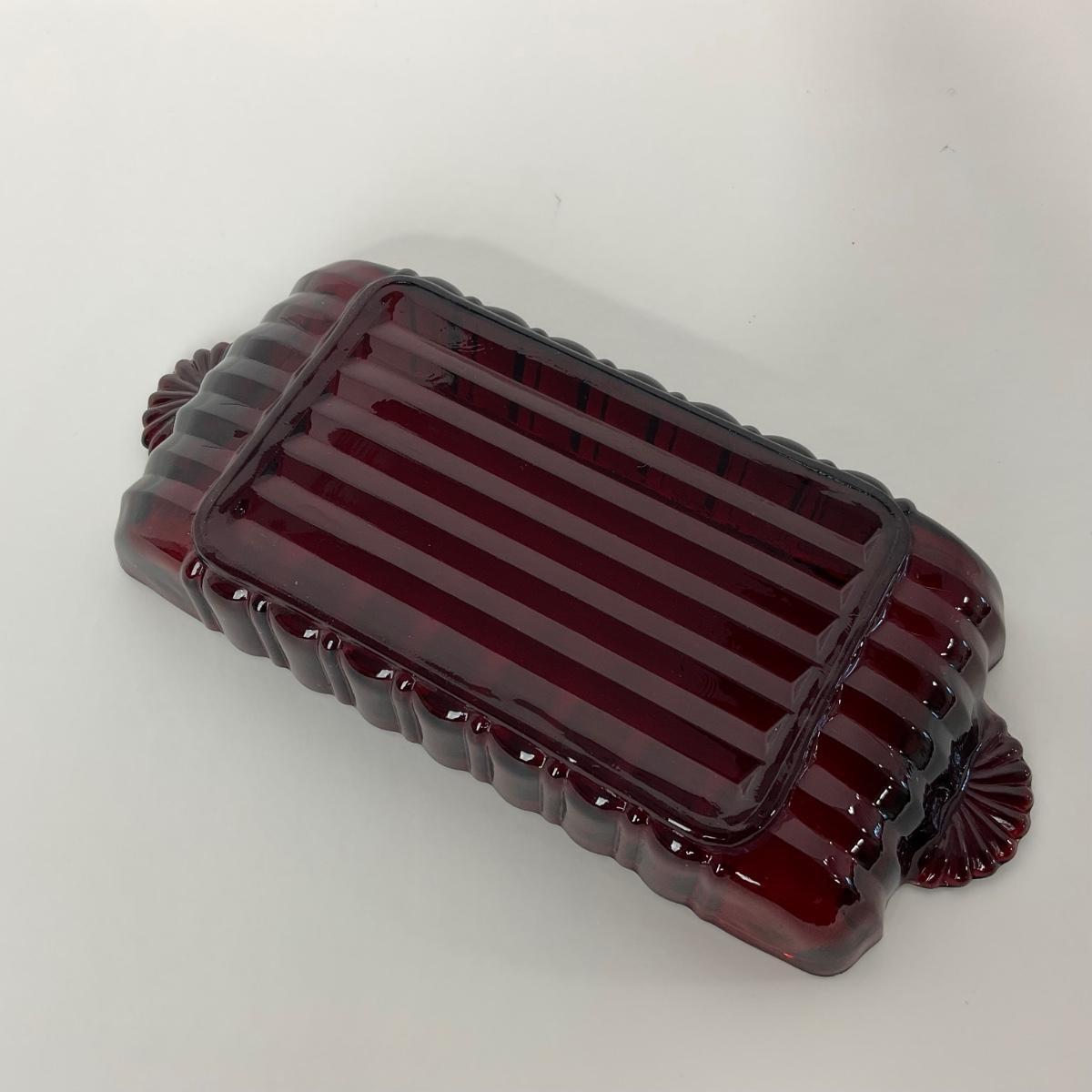 One Anchor Hocking ruby red star burst butter, cheese, or relish dish. 8 3/4 inches long by 1 1/4 inches tall and 3 1/2 inches wide. This piece has no damage, and appears to be in great shape with no visable chips, cracks, or broken pieces. Please see photos for details and condition. Any condition statement is given as a courtesy to a client, is an opinion, and should not be treated as a statement of fact. Reference to condition written, oral or within a condition report shall not be regarded as a full account of condition and may not include all defects, alterations, or restorations. Absence of a condition report does not imply a lot is flawless or lacking imperfections or damage. Katherine’s Auction & Appraisal Service shall have no responsibility for any error or omission. Returns shall not be accepted on the basis of condition. ::: Shipping is available on this lot. If you require shipping you must let us know at the close of the auction. We will coordinate with you after the item has been won. Shipping fees will include insurance up to or exceeding the value of all items being mailed. If you have any questions regarding this lot please contact the auctioneer either via this website, by direct email or by phone. PICK UP TIMES and other important information can be found in the TERMS and DESCRIPTION of the auction. Please take a look for pertinent information. Thanks!