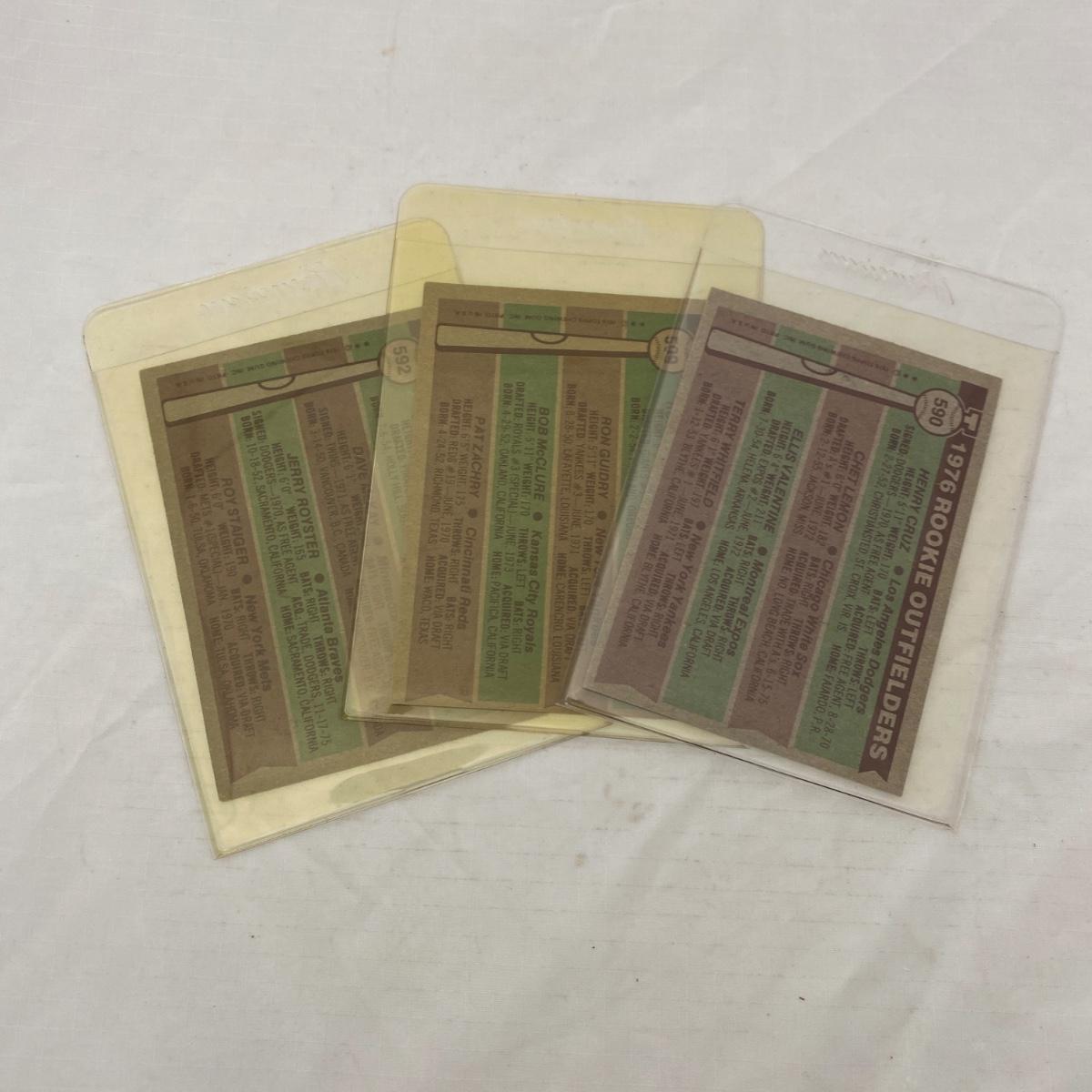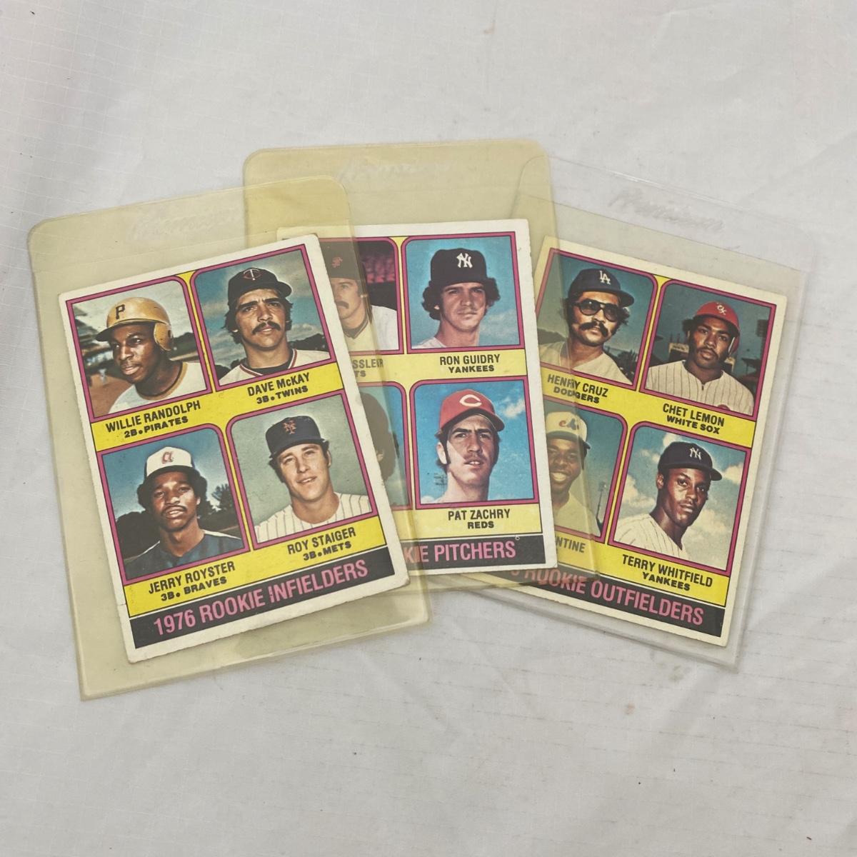Three baseball cards. 1976 Rookie outfielders, pitchers, and infielders. Please see photos for details and condition. ::: Shipping is available on this lot. If you require shipping you must let us know at the close of the auction. We will coordinate with you after the item has been won. Shipping fees will include insurance up to or exceeding the value of all items being mailed. If you have any questions regarding this lot please contact the auctioneer either via this website, by direct email or by phone. PICK UP TIMES and other important information can be found in the TERMS and DESCRIPTION of the auction. Please take a look for pertinent information. Thanks!