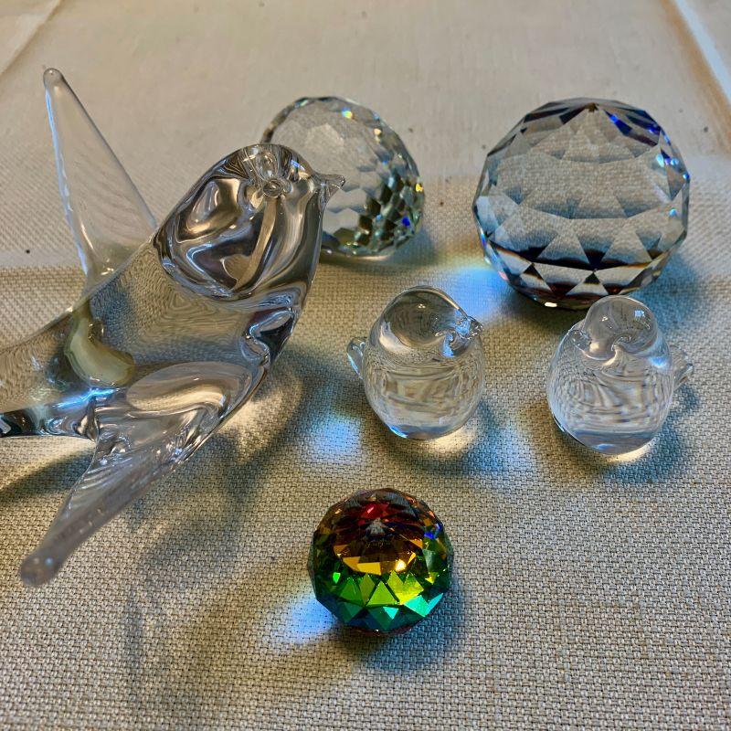 Swedish Konstglas birds & Swarovski egg & 2 prism orbs.