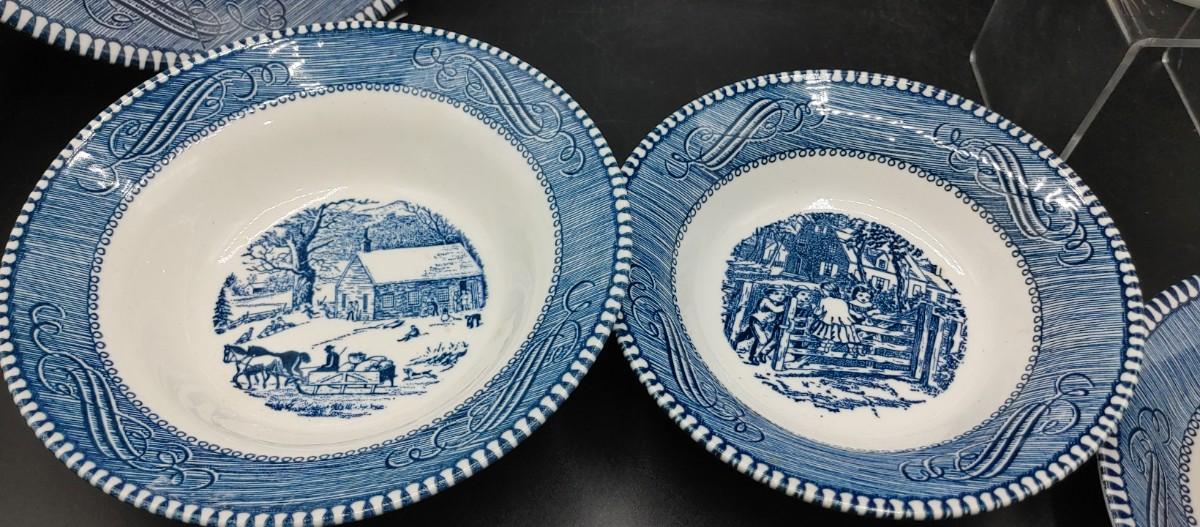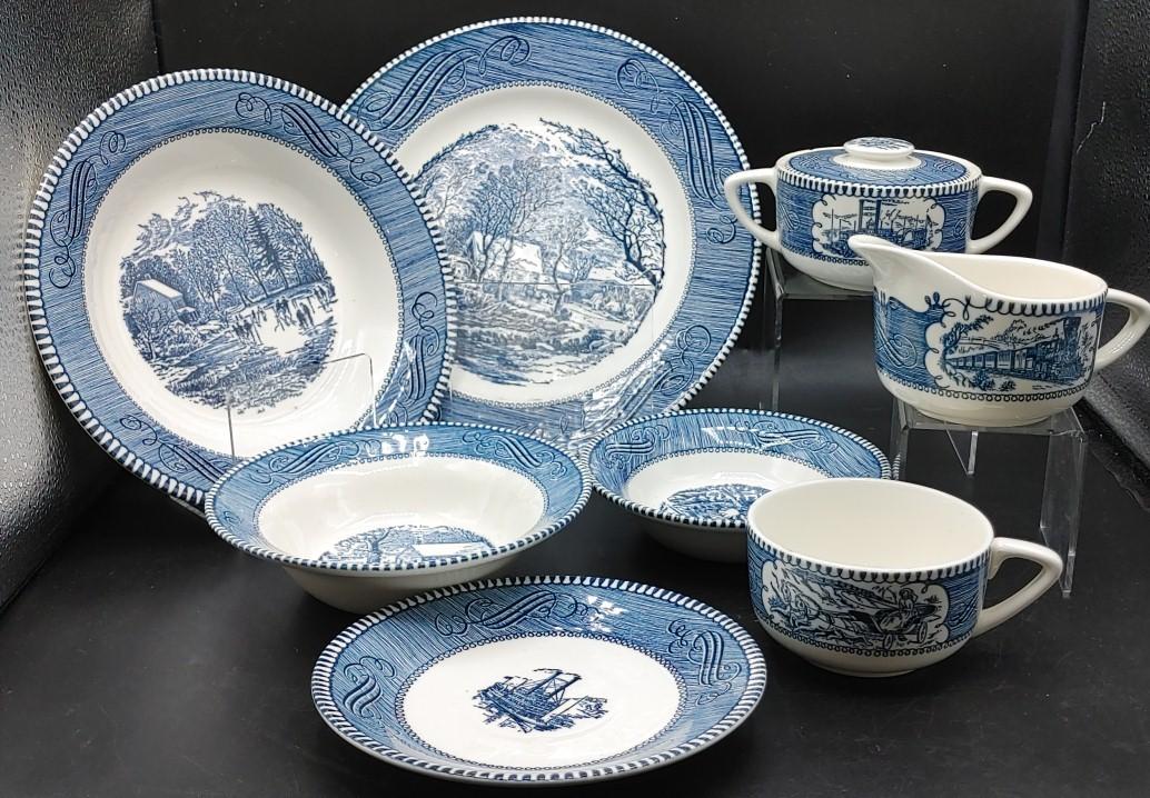 #129 Large Set Of Vintage Carrier & Ives Blue & White Dishes