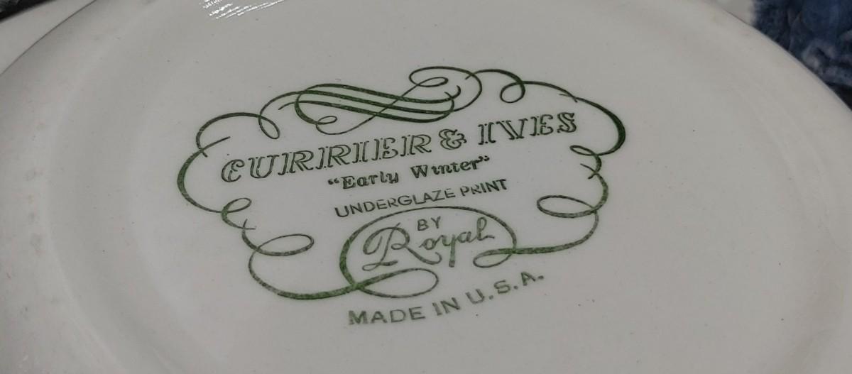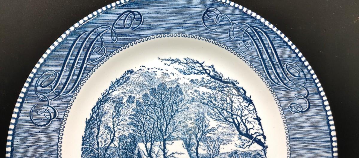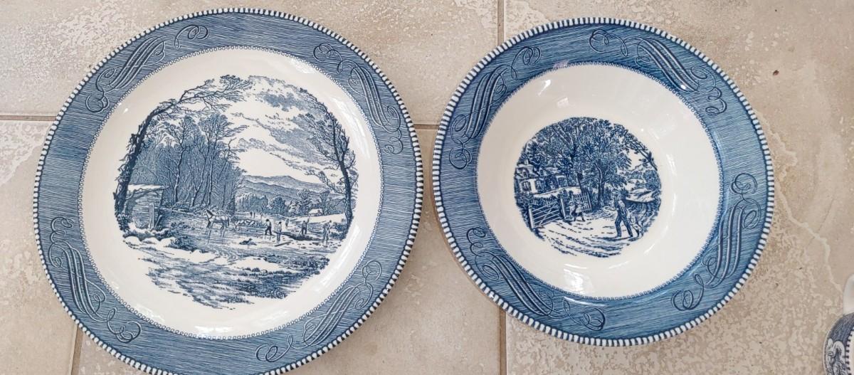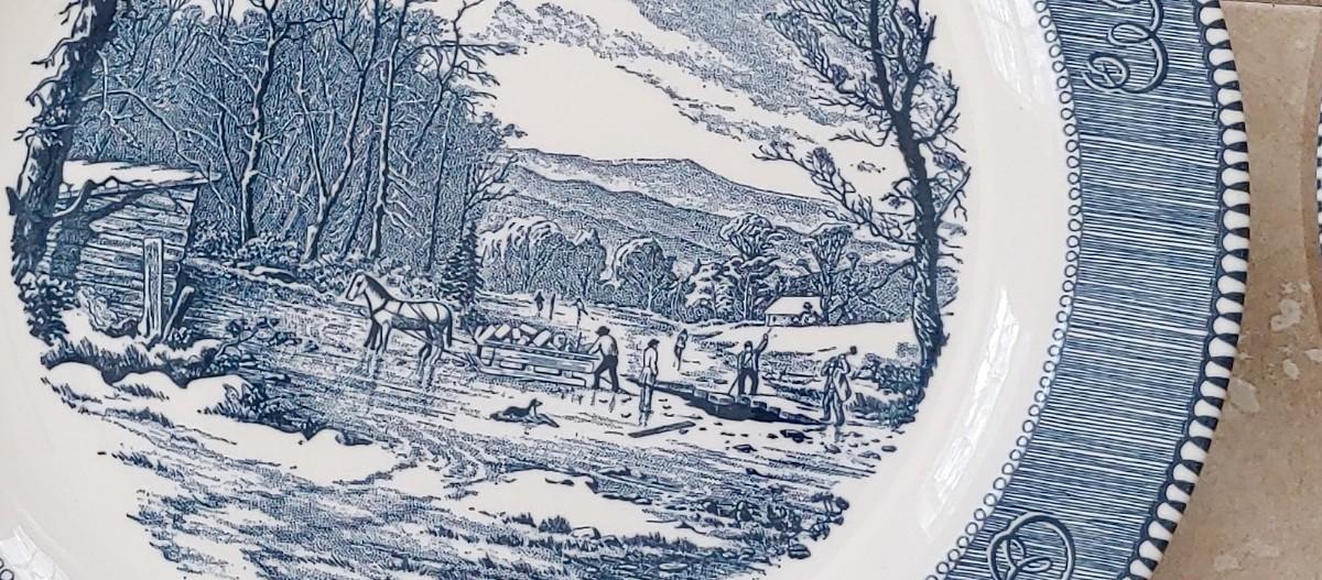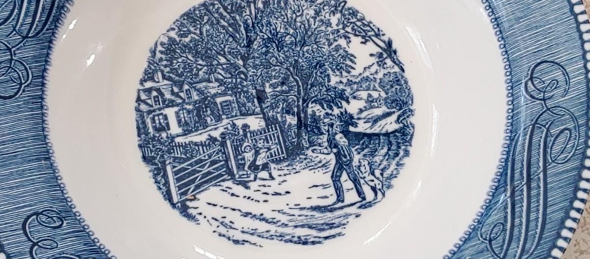 Beautiful blue and white set Currier and Ives originally came from A&P Grocery Store.