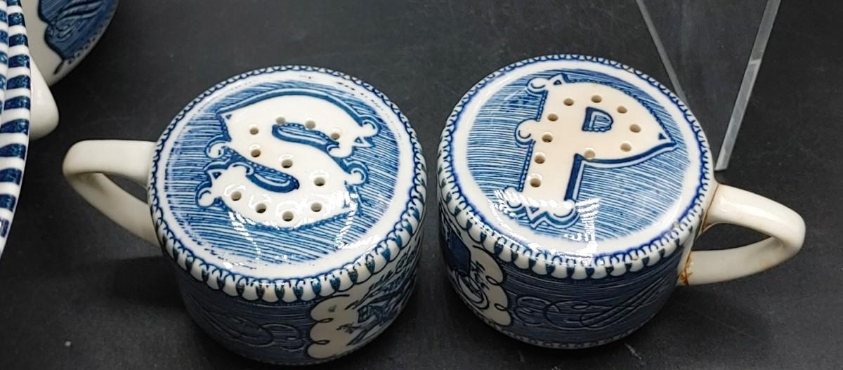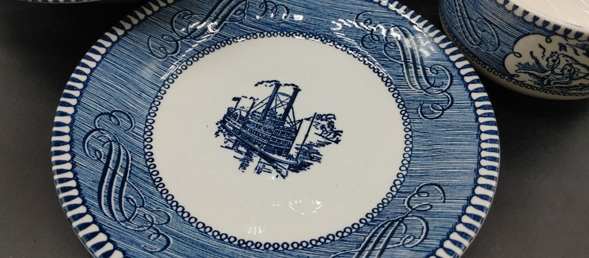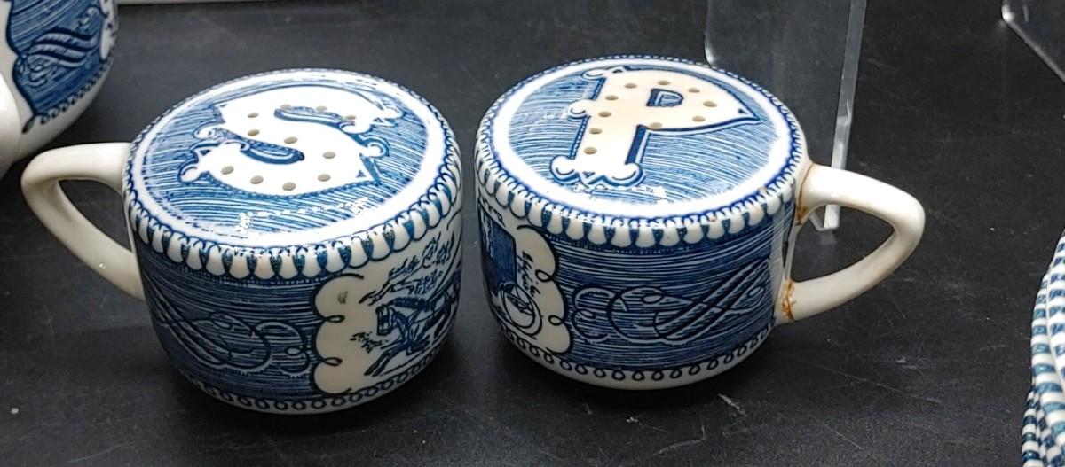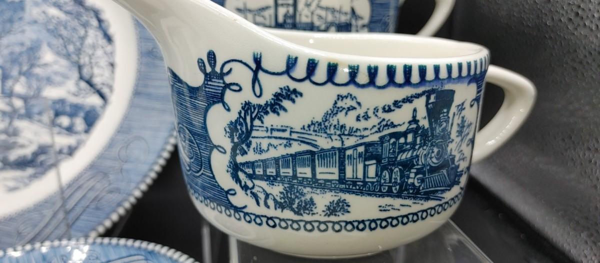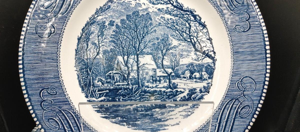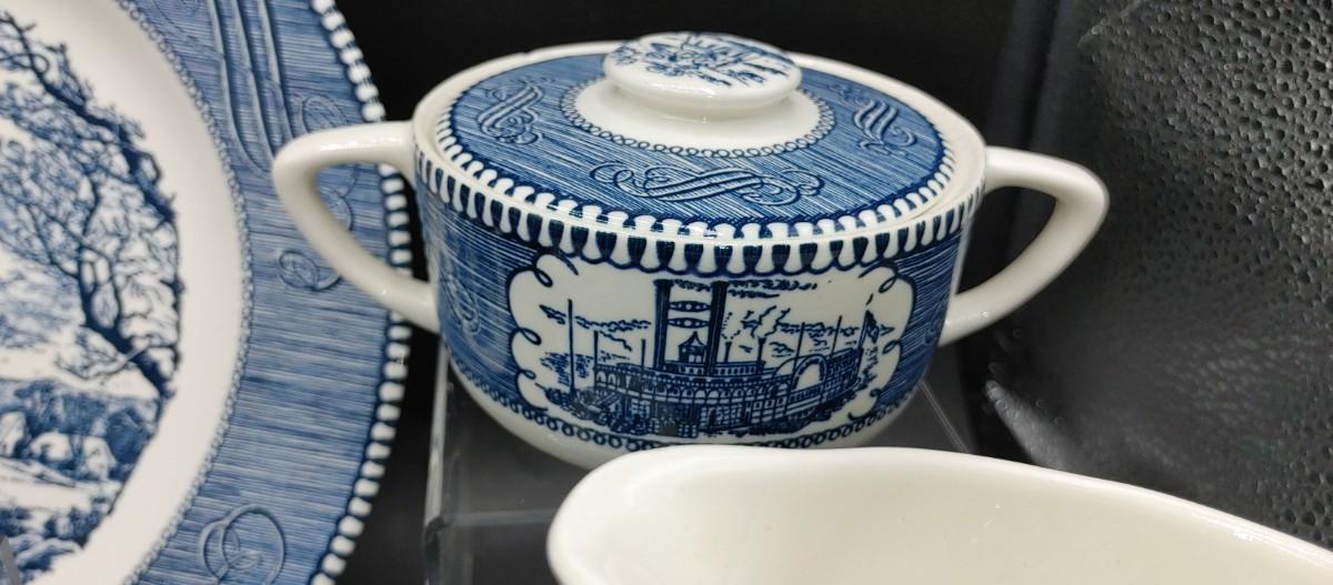 Beautiful blue and white set Currier and Ives originally came from A&P Grocery Store.