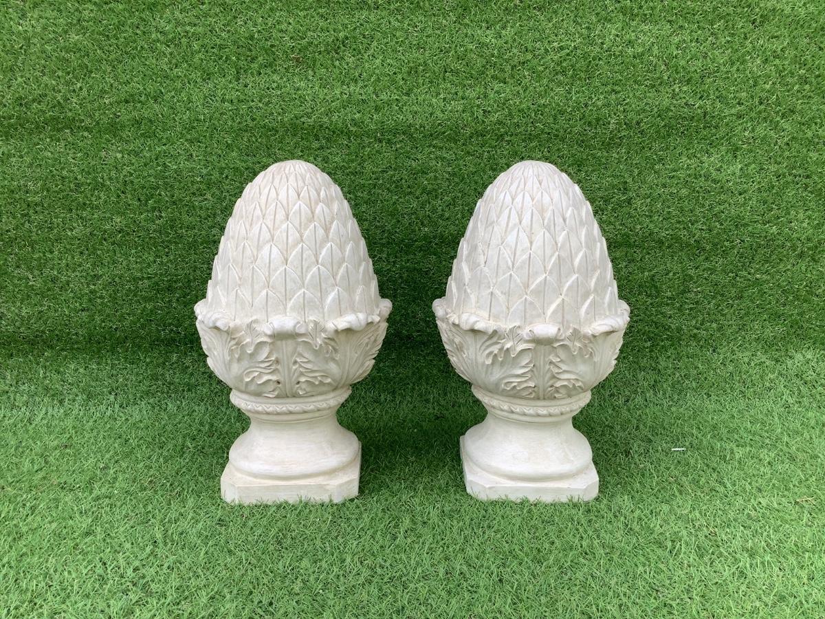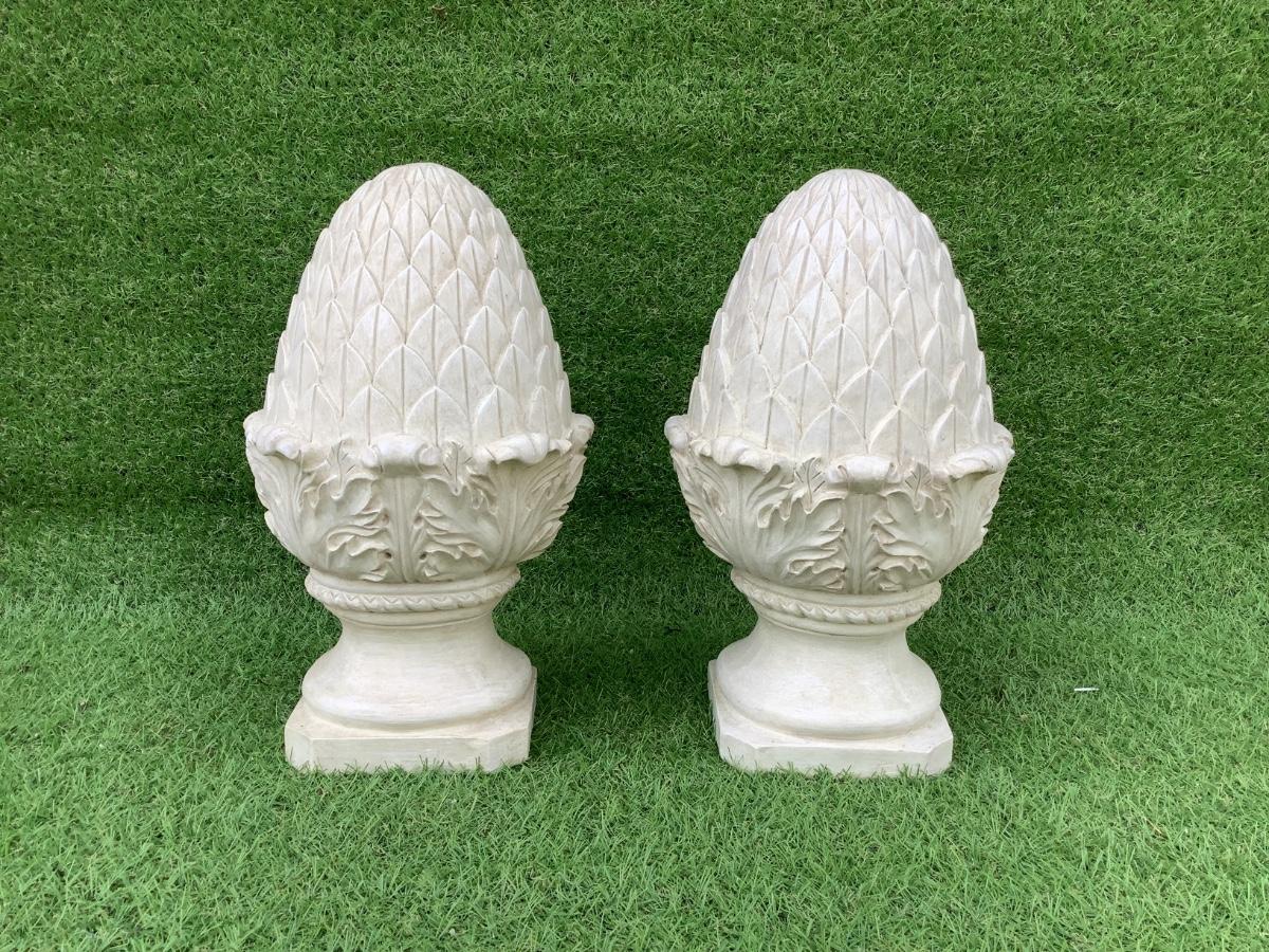 Pair of large artichoke/pinecone/pineapple garden decor composite sculptures. Measuring 15" high x 6" diameter