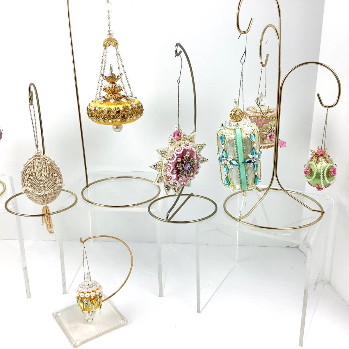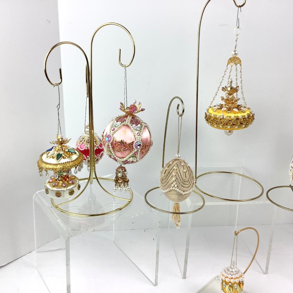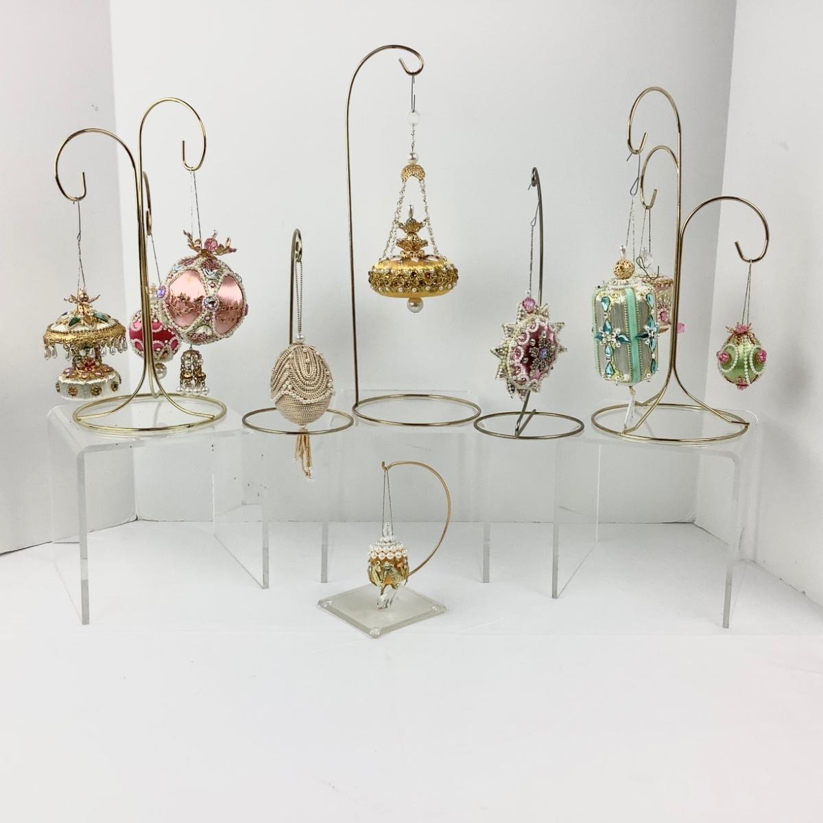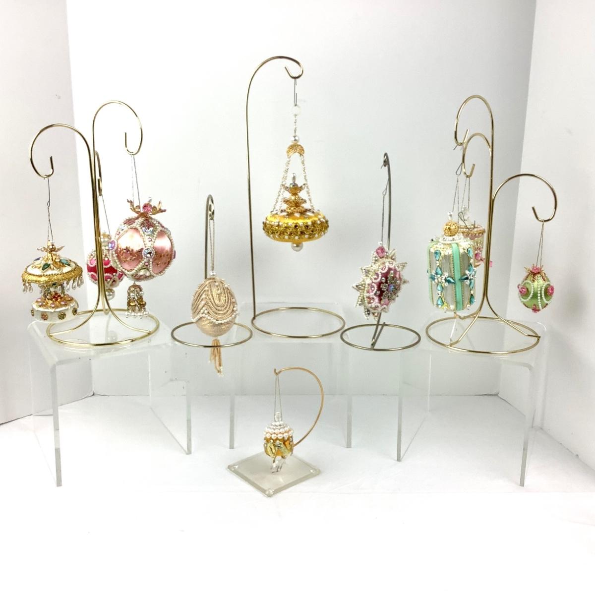 There are 10 ornaments in this lot. They are pink, green, gold and more.