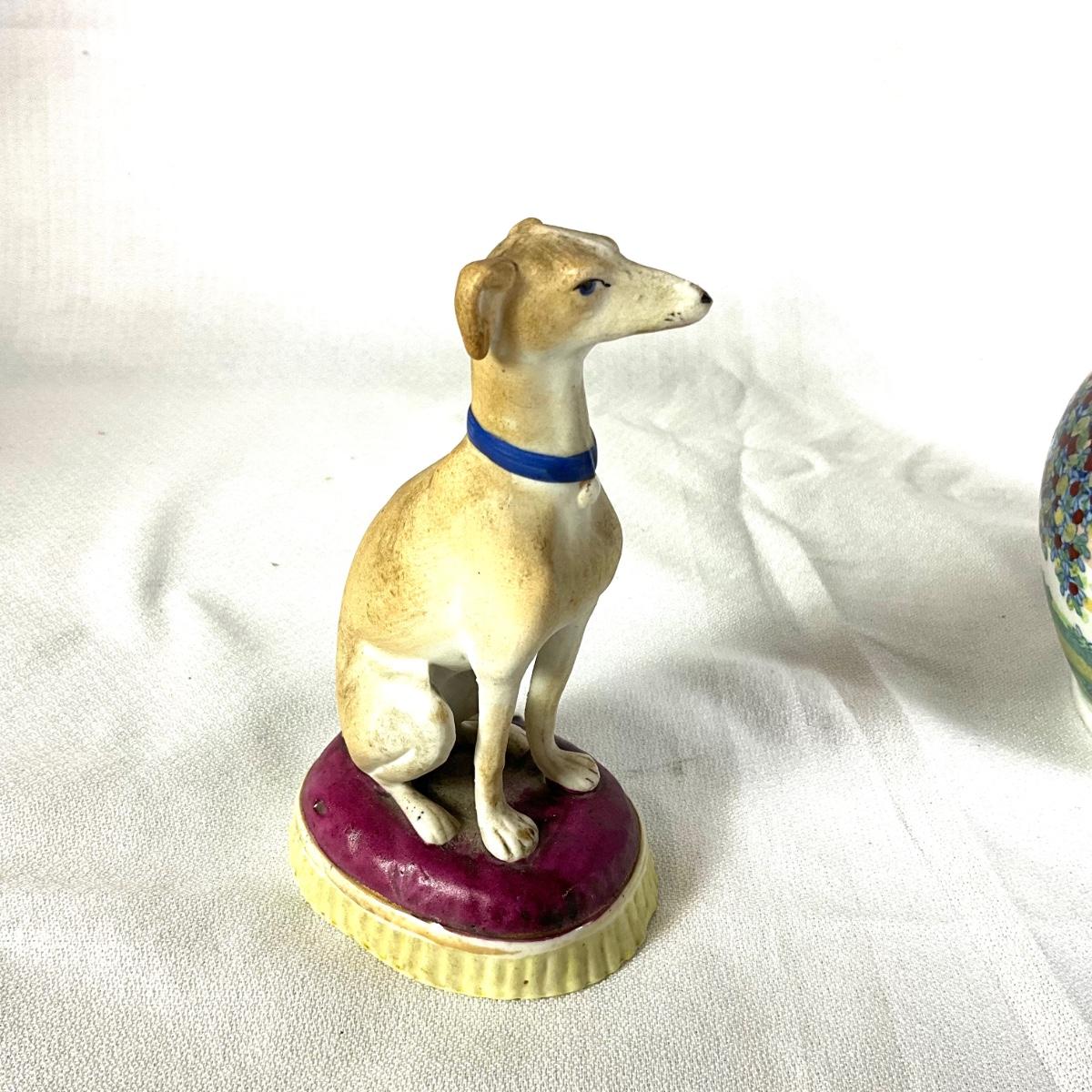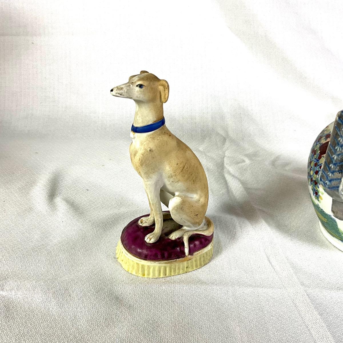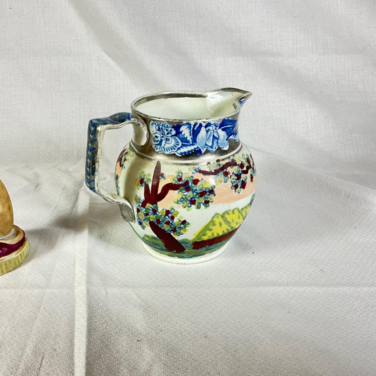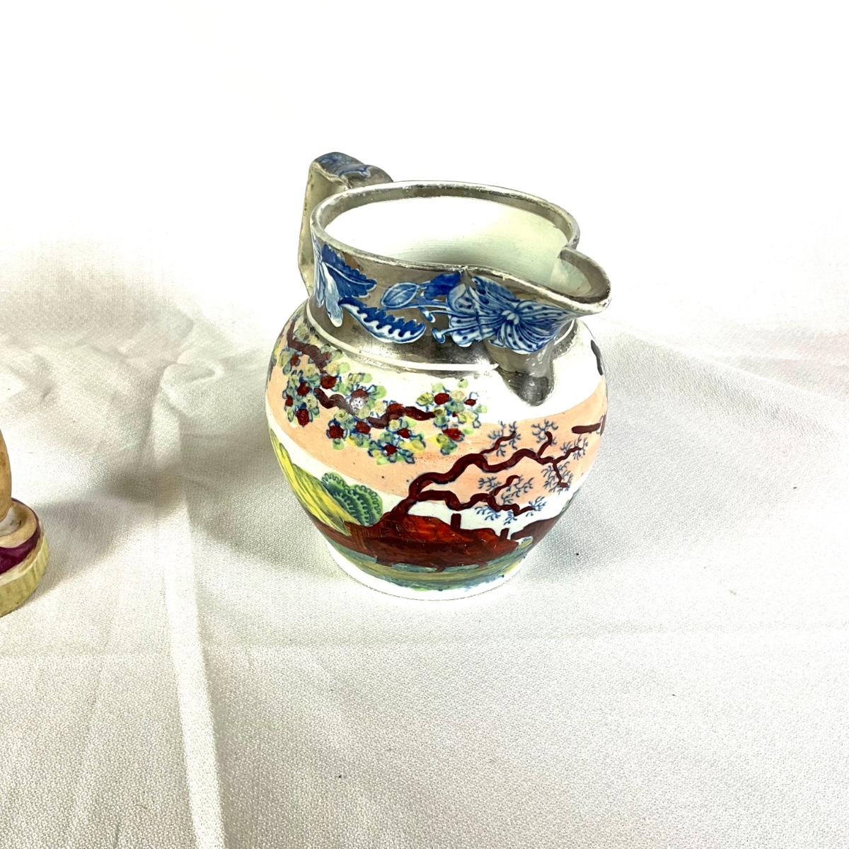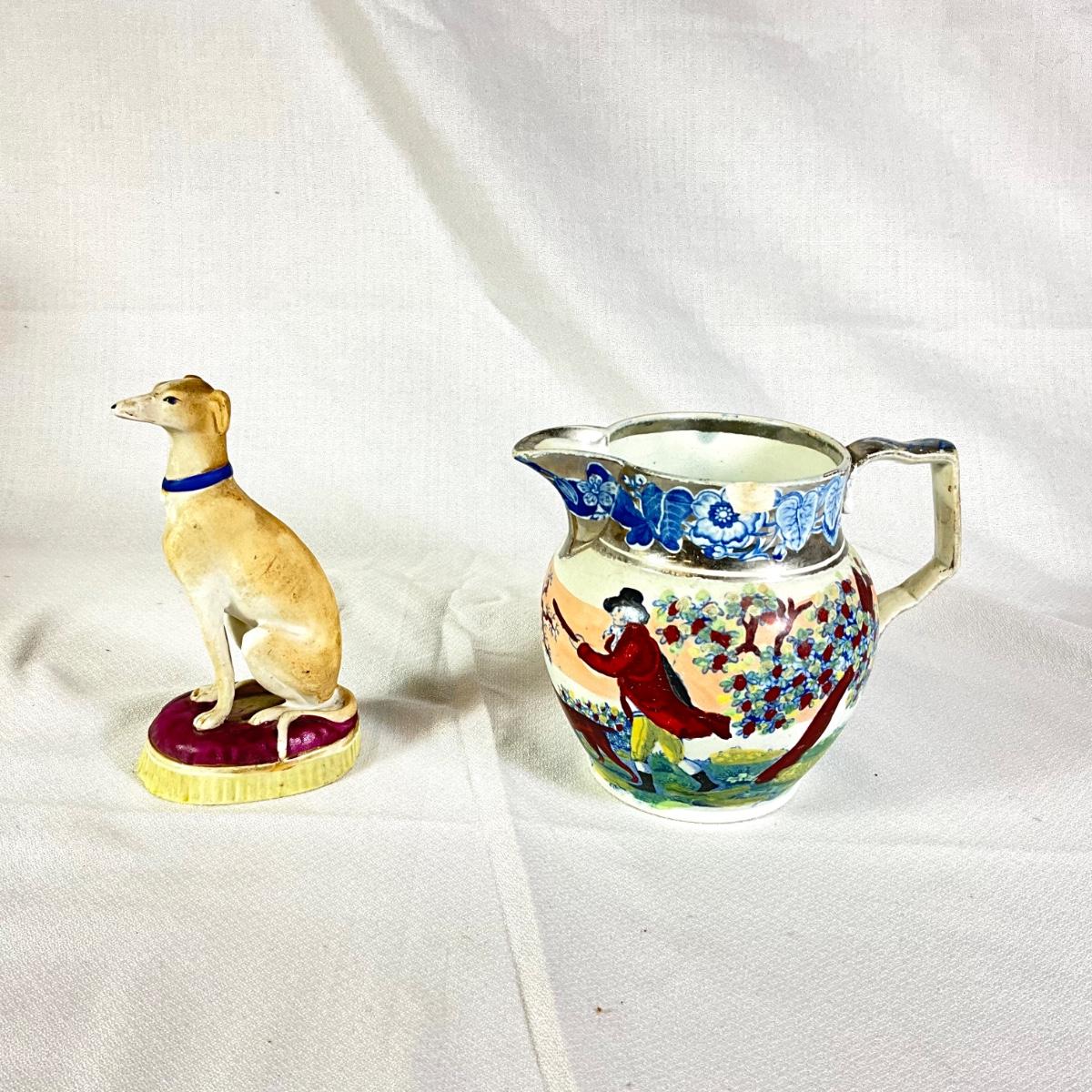 1293 Antique Chinoiserie Hunt Scene Jug with Staffordshire Bisque Dog Figurine