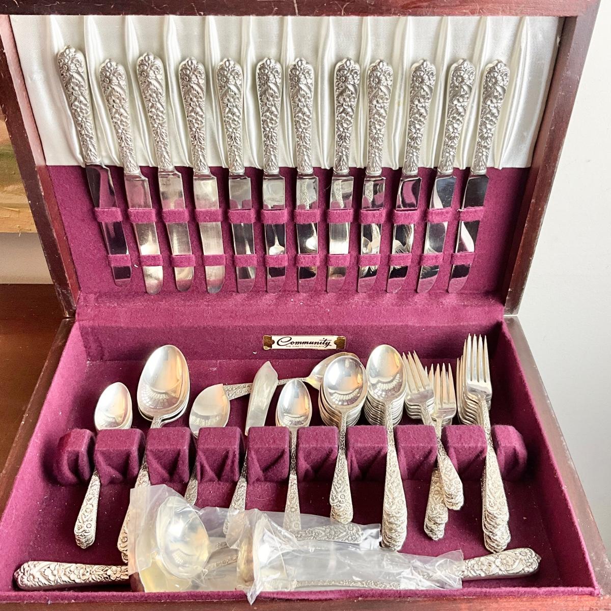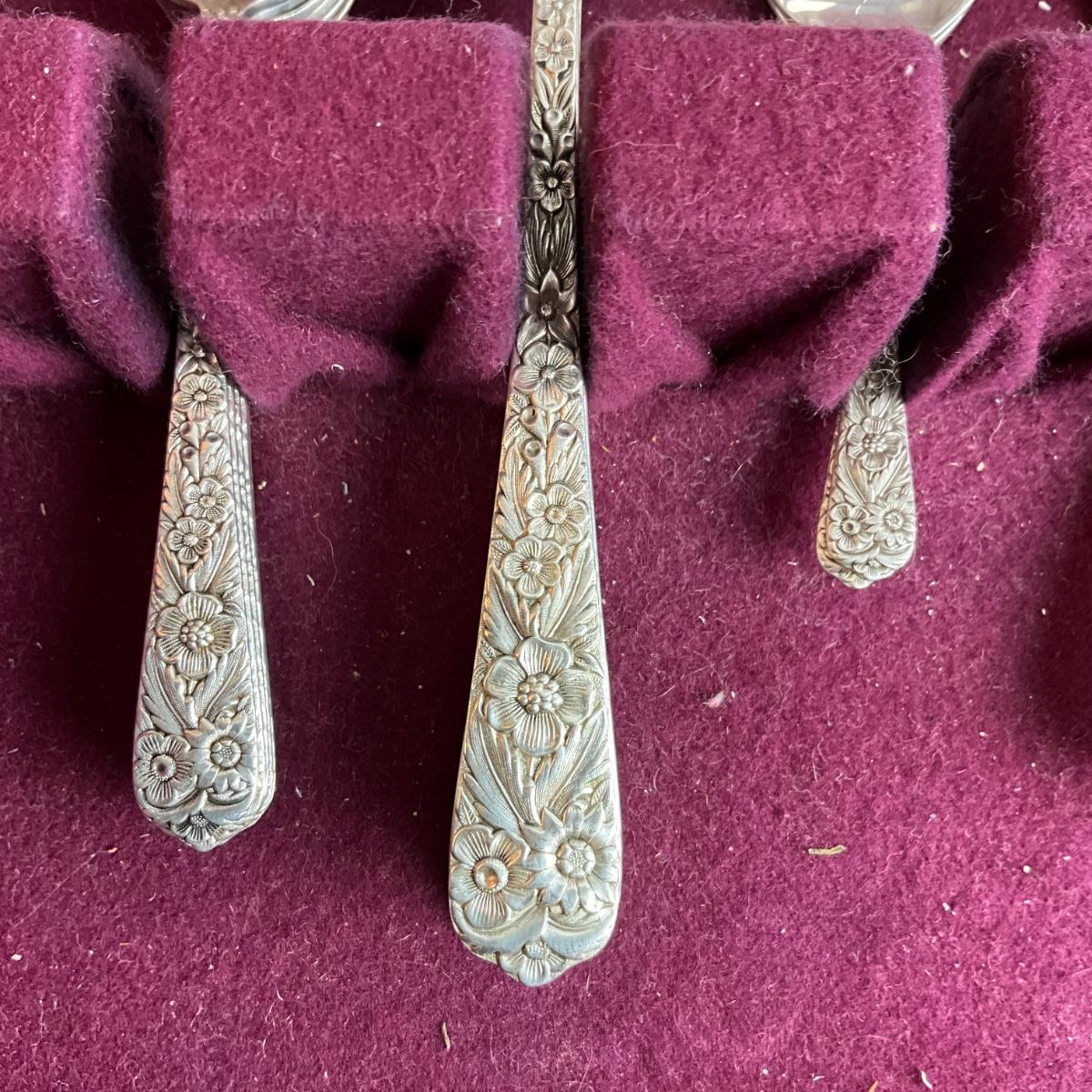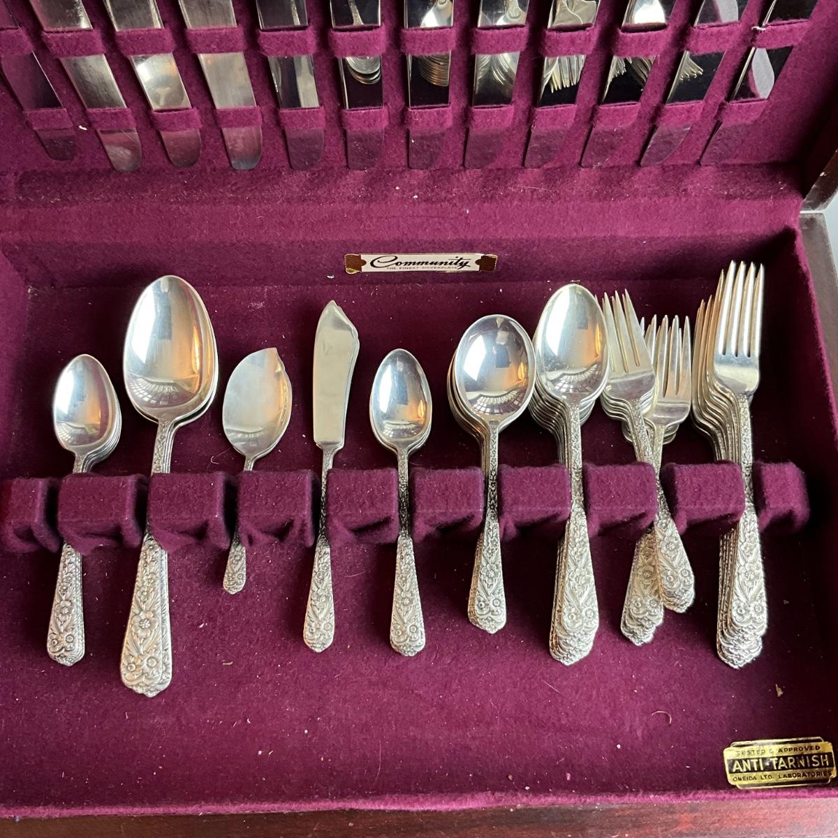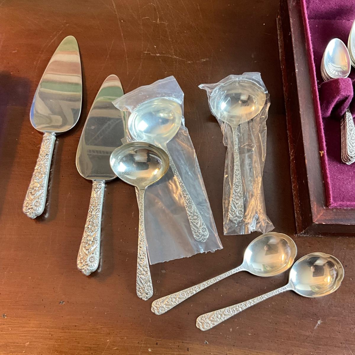 11 teaspoons, 4 serving spoons, 2 small servers, 2 butter knives, 15 soup spoons, 13 tablespoons, 12 salad forks, 12 dinner forks, 12 knives, 2 cake servers, 3 ladles, 2 sugar spoons