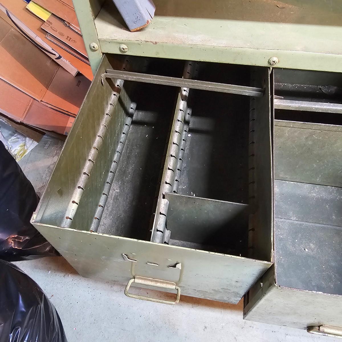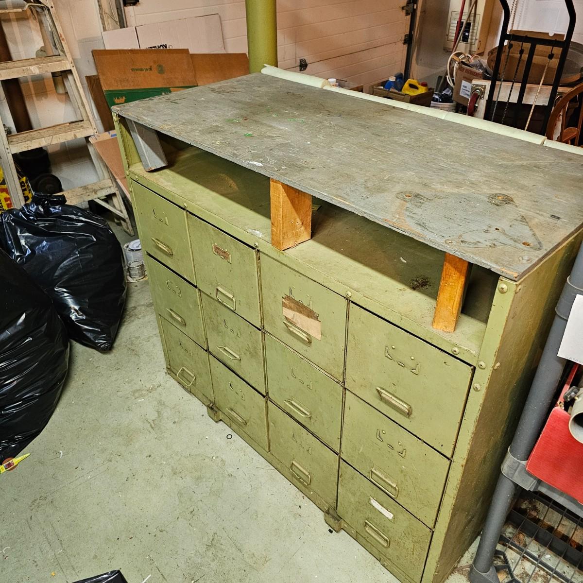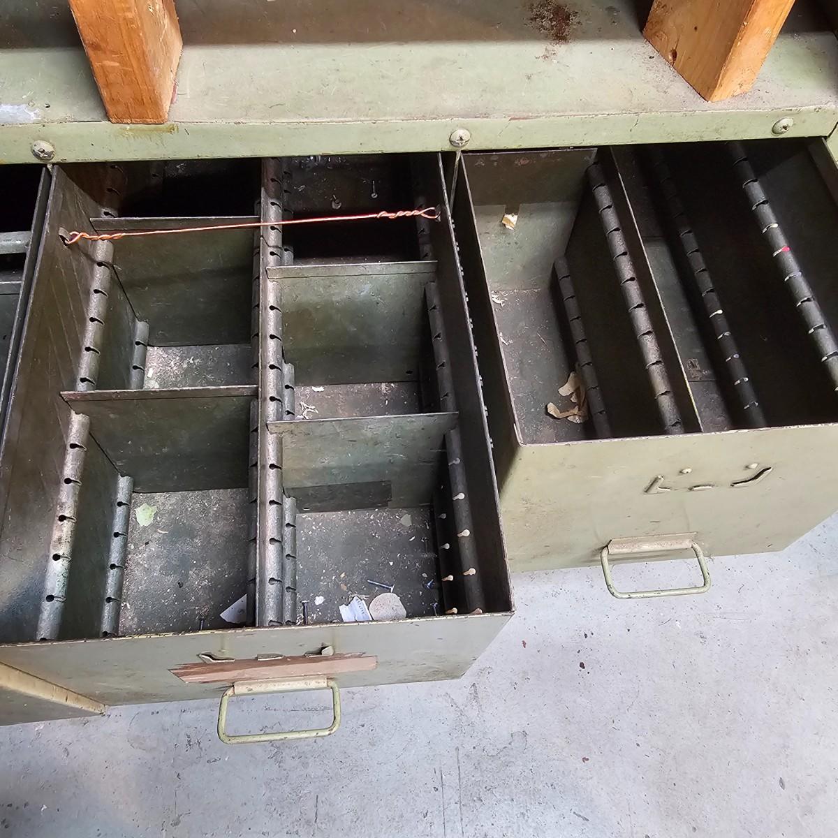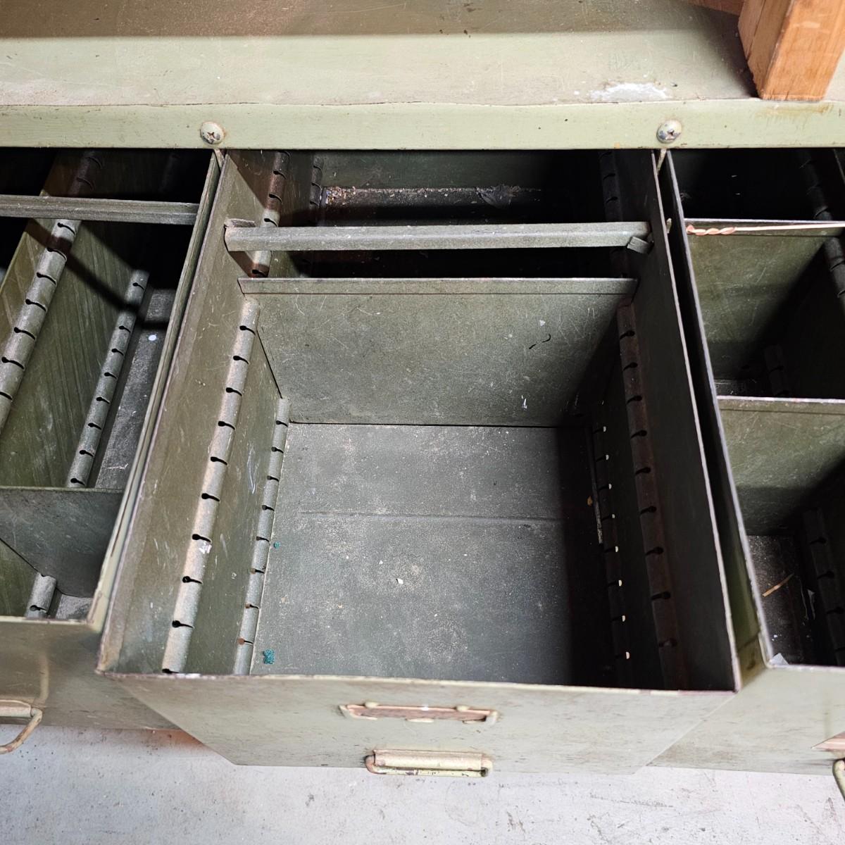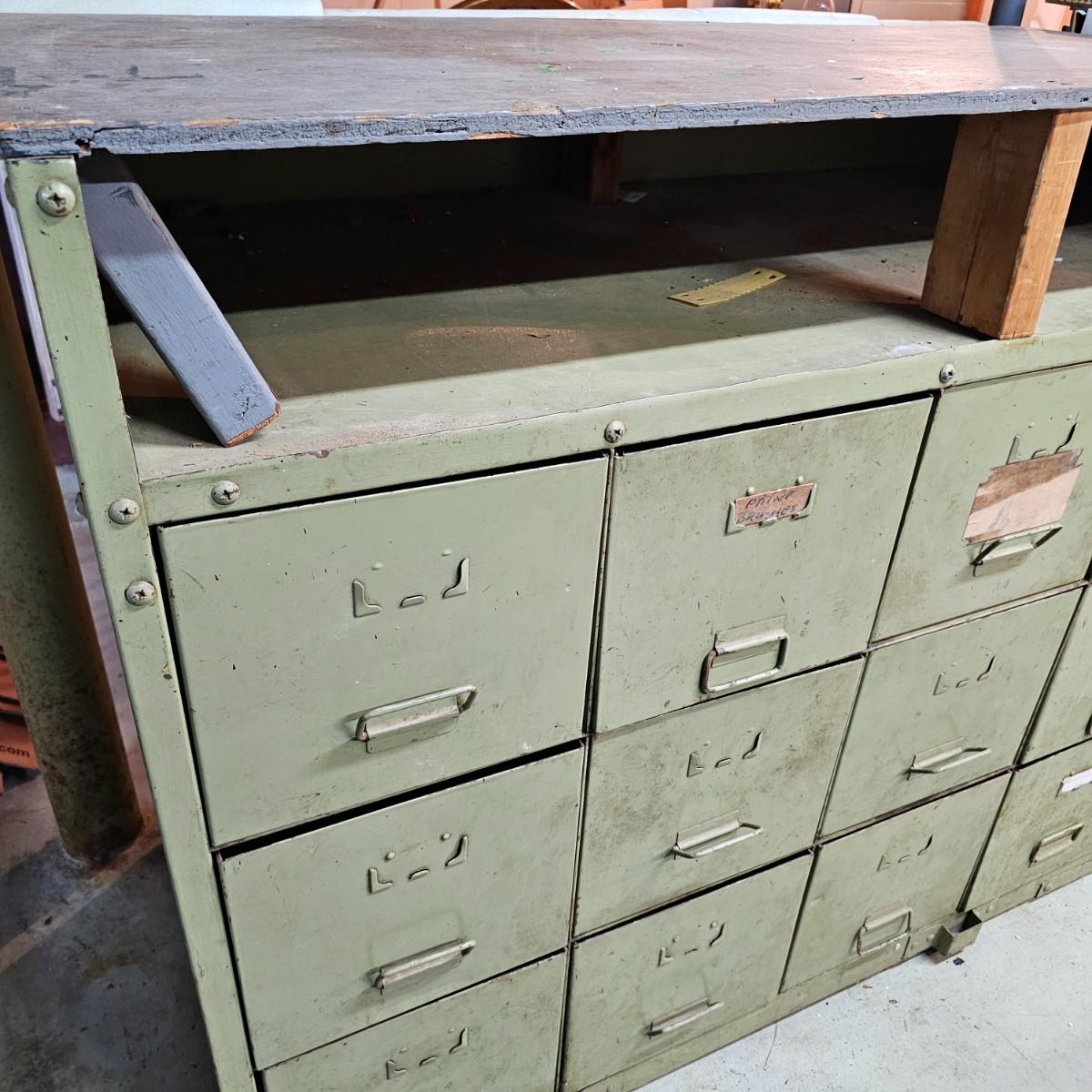Metal with wood top work bench with 12 pull out drawer below. Drawershave various divider setups inside. Handles and card holders on fronts of all drawers. Unit measures 46.5" x 23" x 40"H. See photos for details. Local pickup only. Winning bidder must bring assistance to help move and load this item due to its weight and/or size.