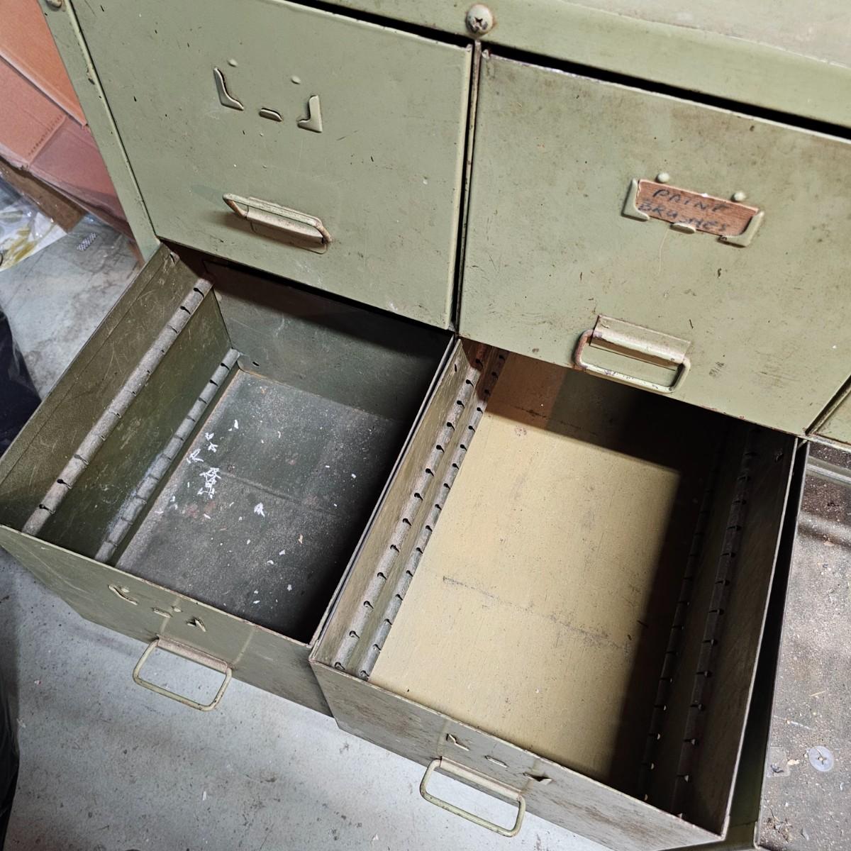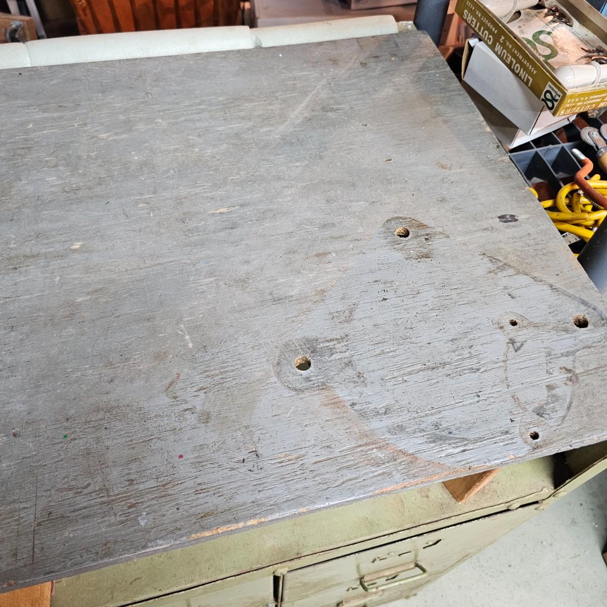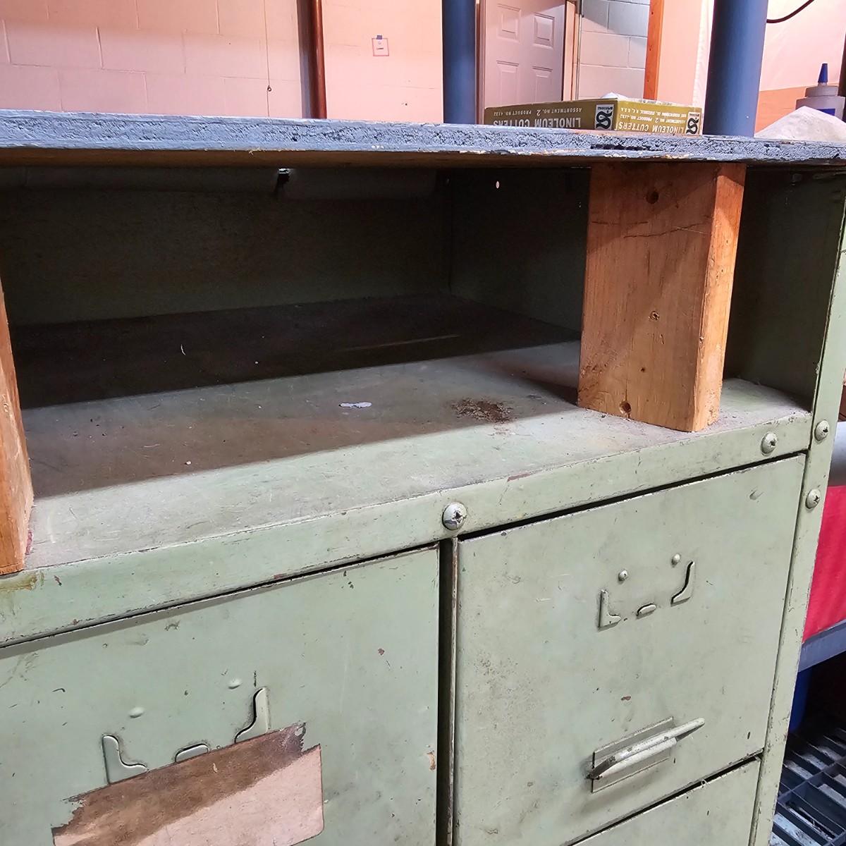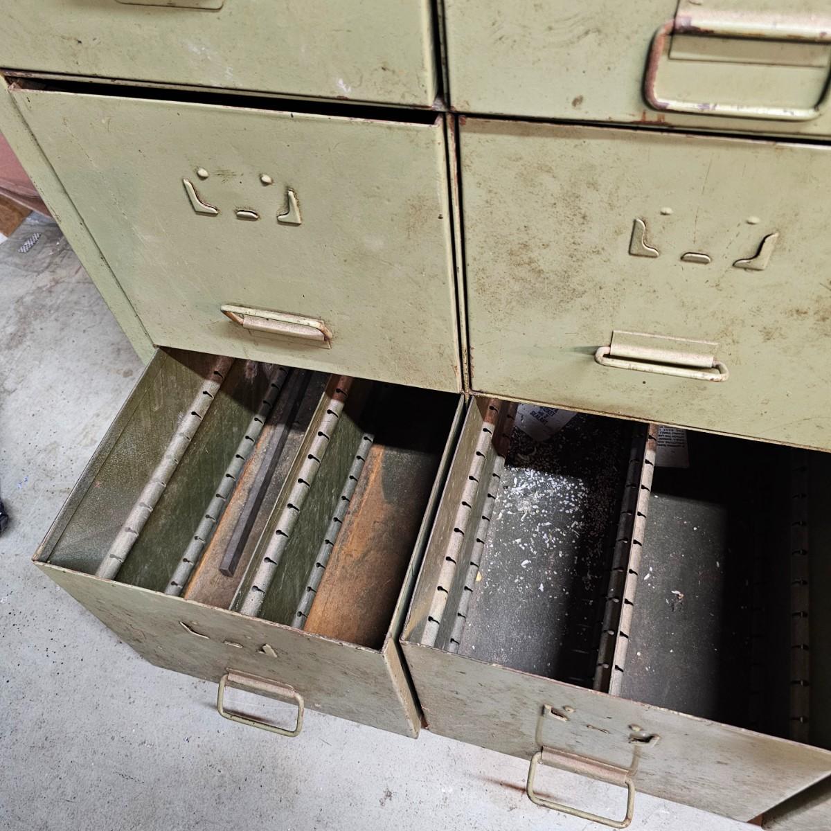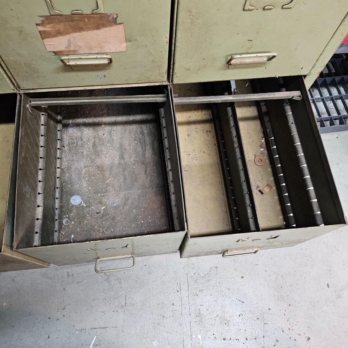 Metal with wood top work bench with 12 pull out drawer below. Drawershave various divider setups inside. Handles and card holders on fronts of all drawers. Unit measures 46.5" x 23" x 40"H. See photos for details. Local pickup only. Winning bidder must bring assistance to help move and load this item due to its weight and/or size.