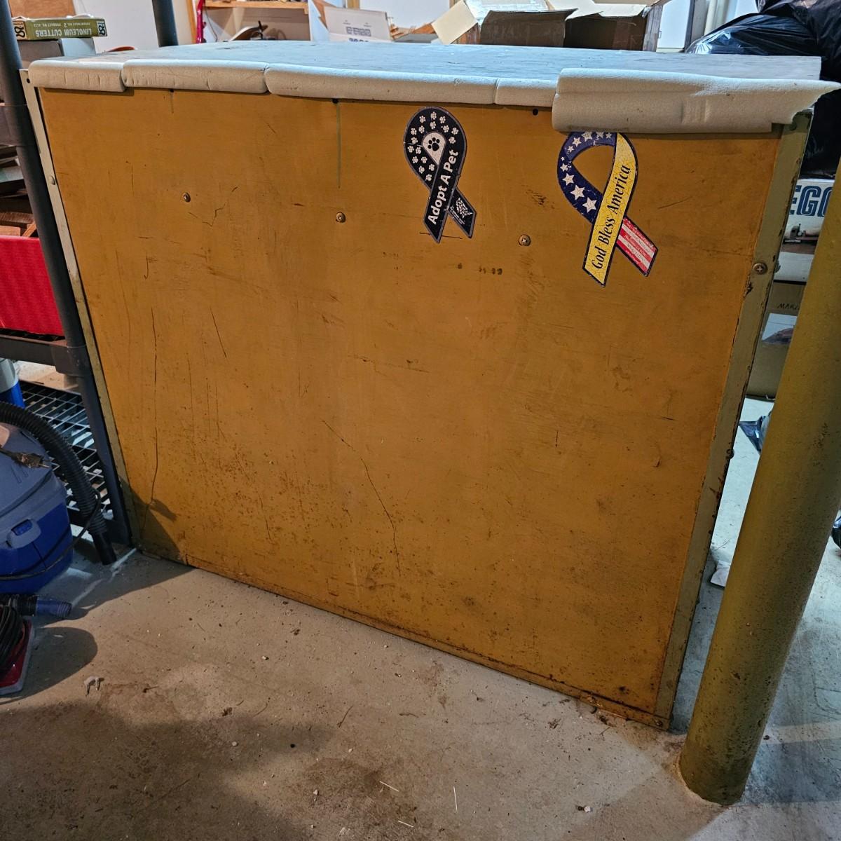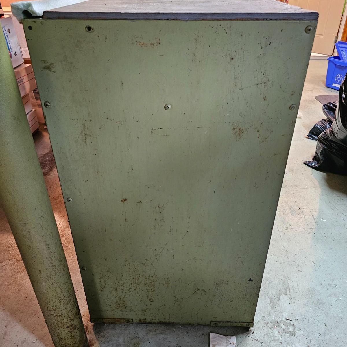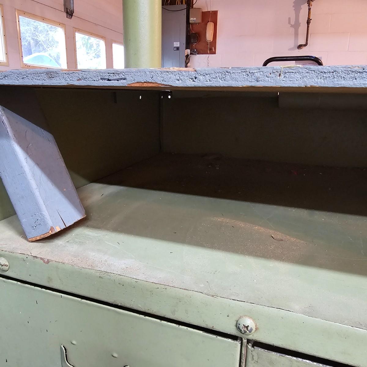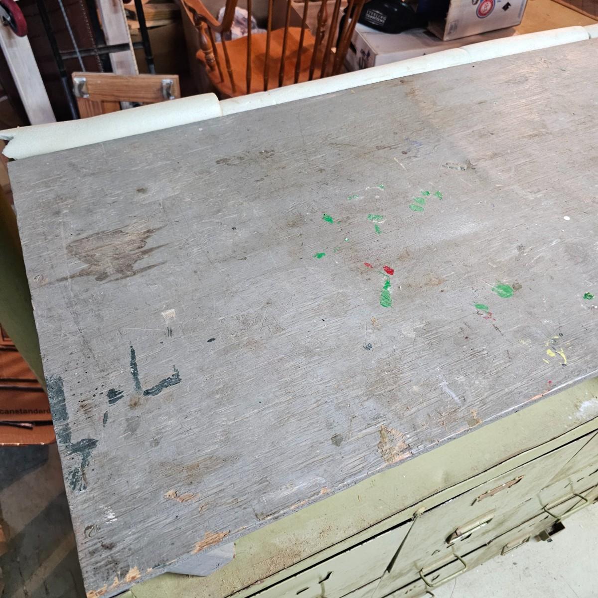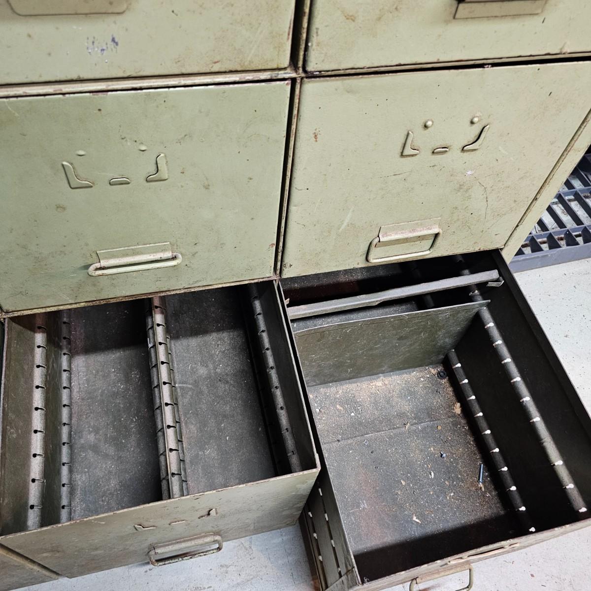 Metal with wood top work bench with 12 pull out drawer below. Drawershave various divider setups inside. Handles and card holders on fronts of all drawers. Unit measures 46.5" x 23" x 40"H. See photos for details. Local pickup only. Winning bidder must bring assistance to help move and load this item due to its weight and/or size.