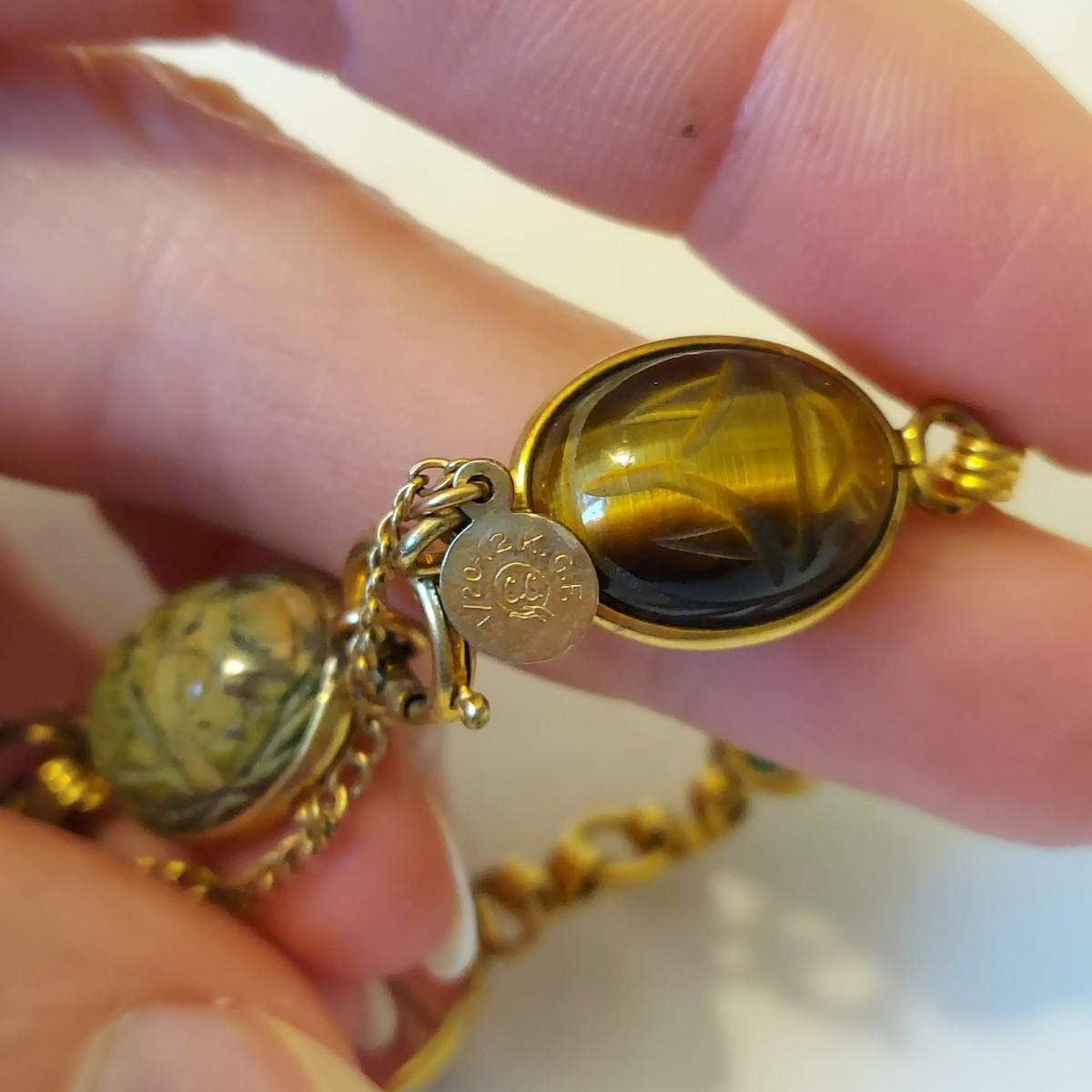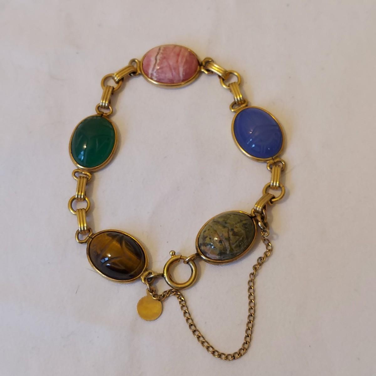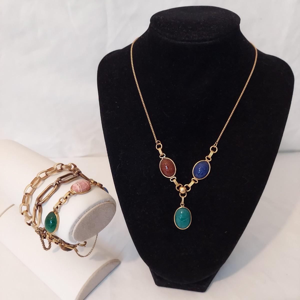 Lot includes a matching gold necklace and bracelet with mixed stones that are carved like a scarab beetle. Also includes two other chain style bracelets. Items are mostly stamped 1/20 12K GF. Necklace chain is 16” long. Please see photos for details. All sales are final. No returns or refunds. Please bid accordingly. Shipping available