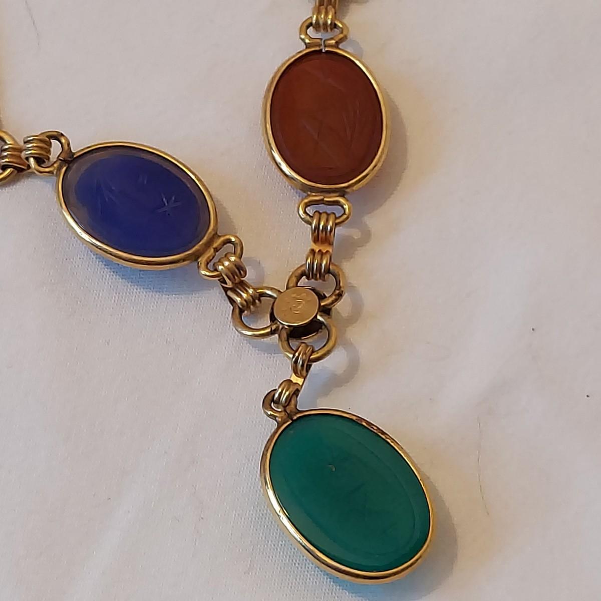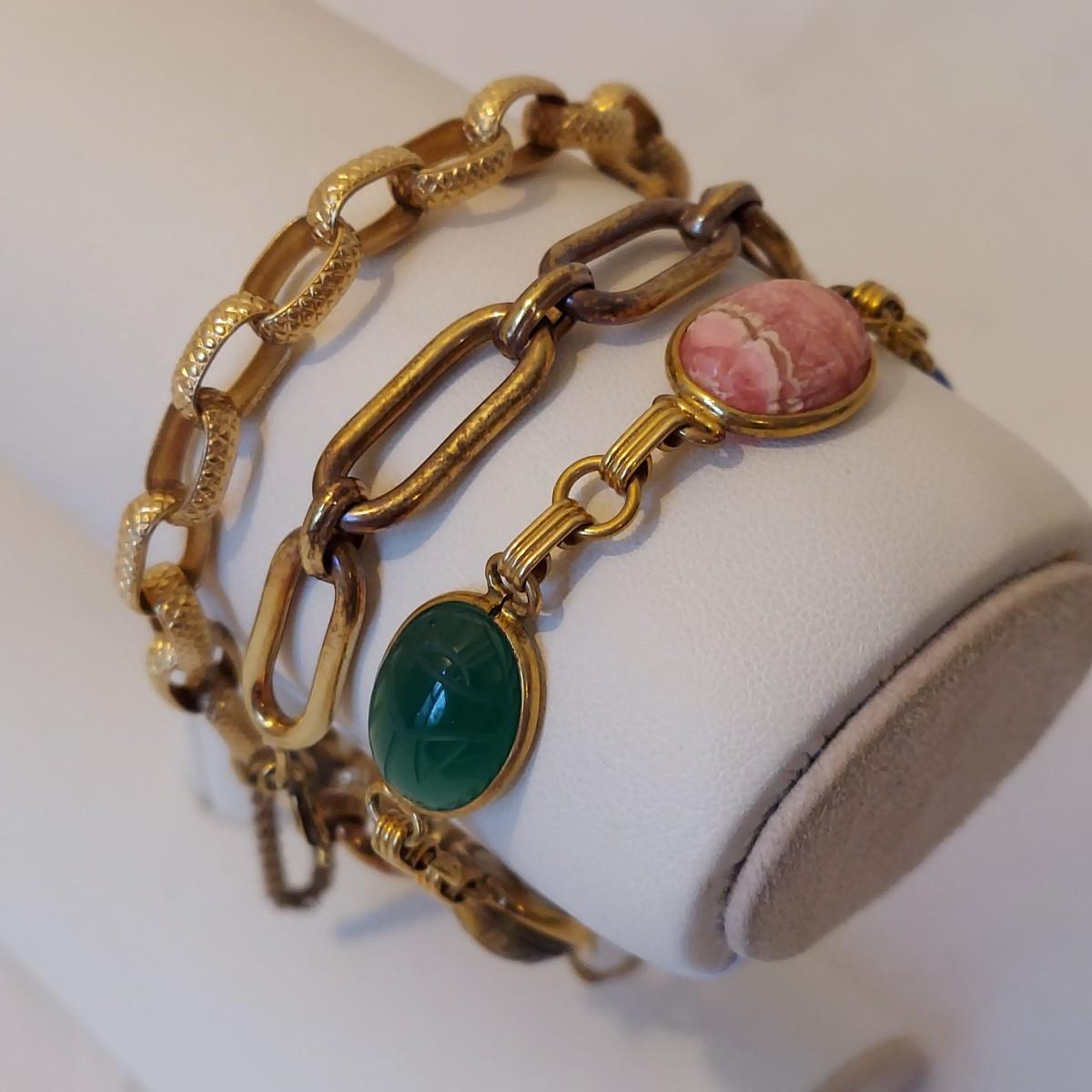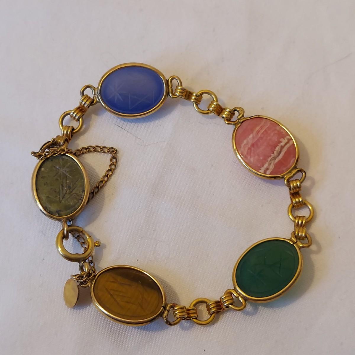 Lot includes a matching gold necklace and bracelet with mixed stones that are carved like a scarab beetle. Also includes two other chain style bracelets. Items are mostly stamped 1/20 12K GF. Necklace chain is 16” long. Please see photos for details. All sales are final. No returns or refunds. Please bid accordingly. Shipping available