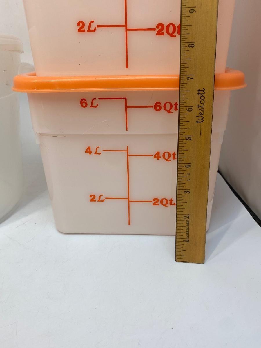12qt Round & 2- 6qt Square Food Storage Containers. Lids on the square containers fit but do not snap tight. Good condition.