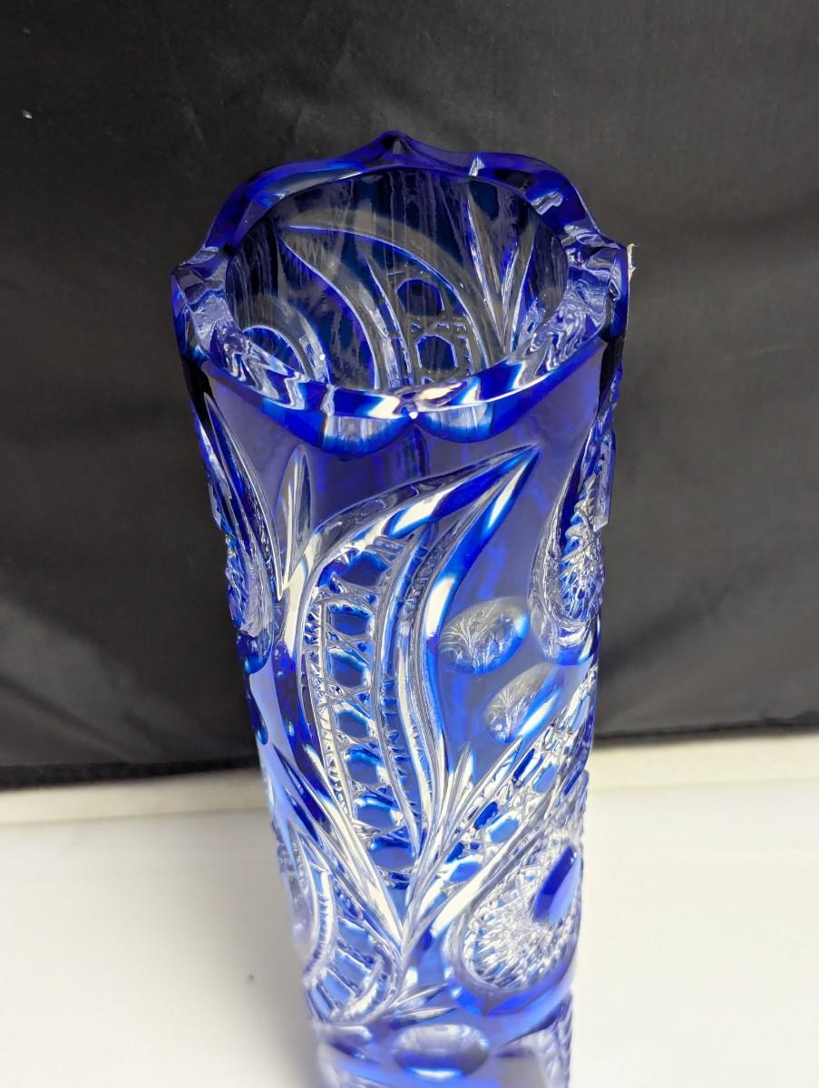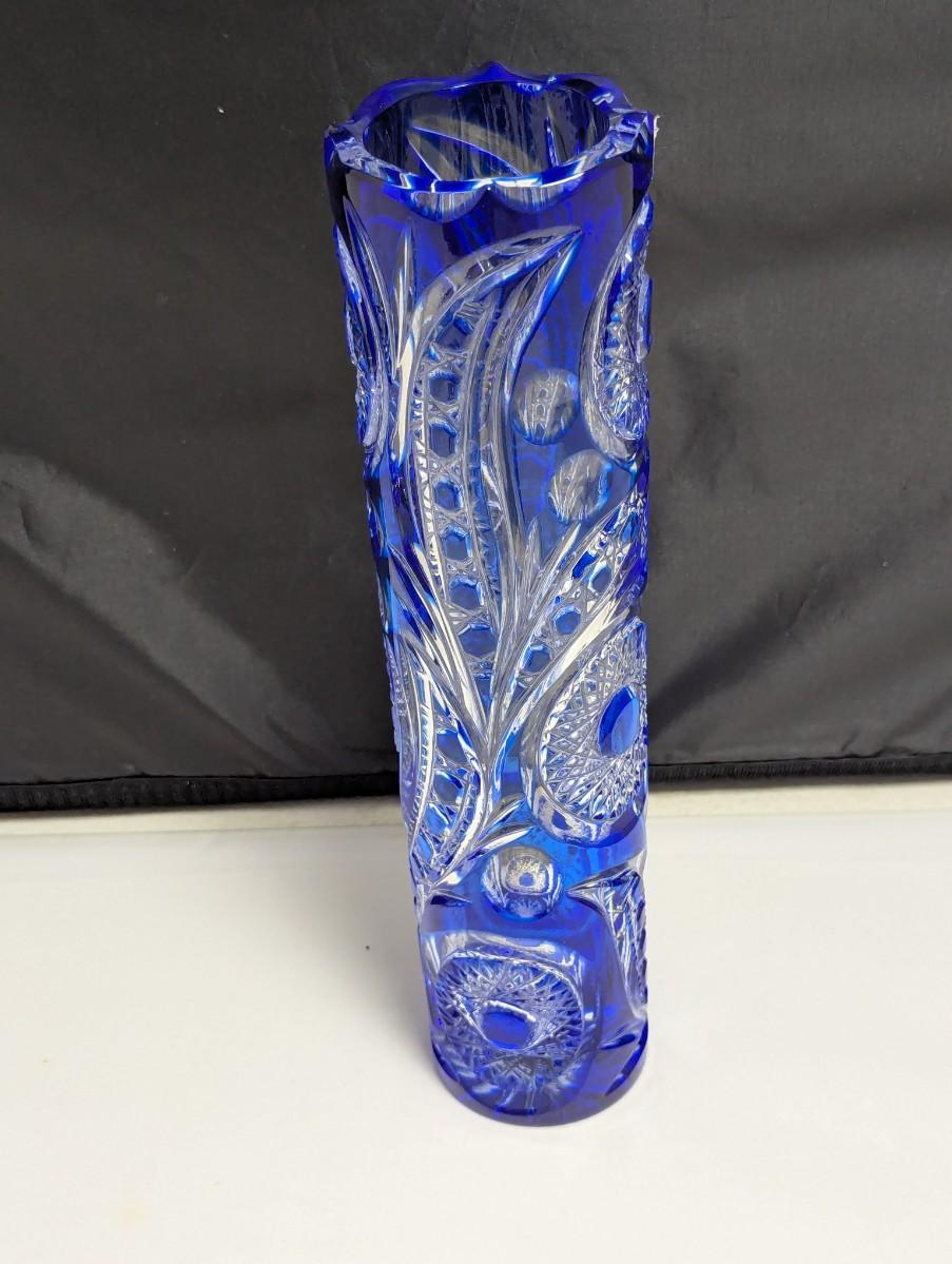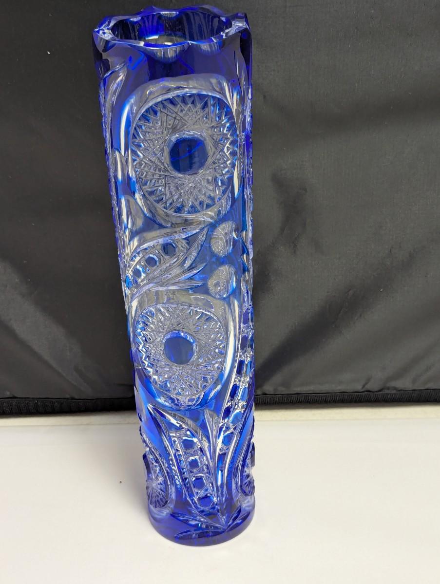 13 3/4" Tall Hand Made Cobalt Blue Cut Etched 10" Vase USSR - Russia - Sticker (DR)