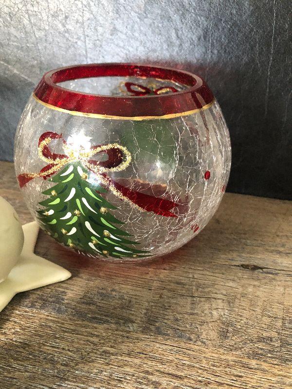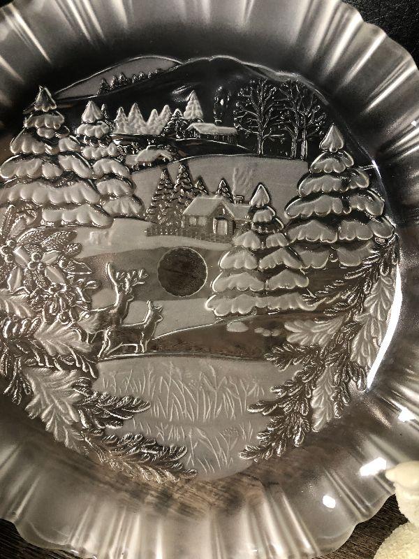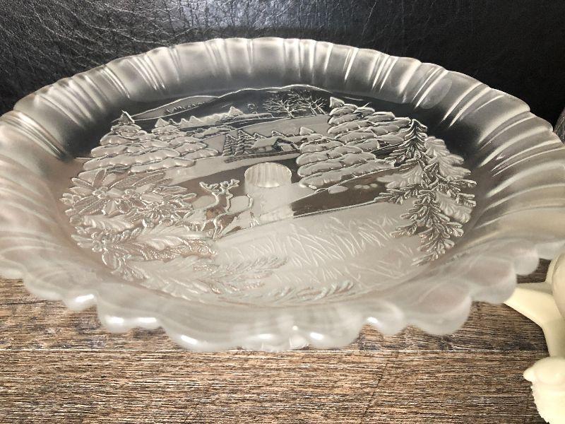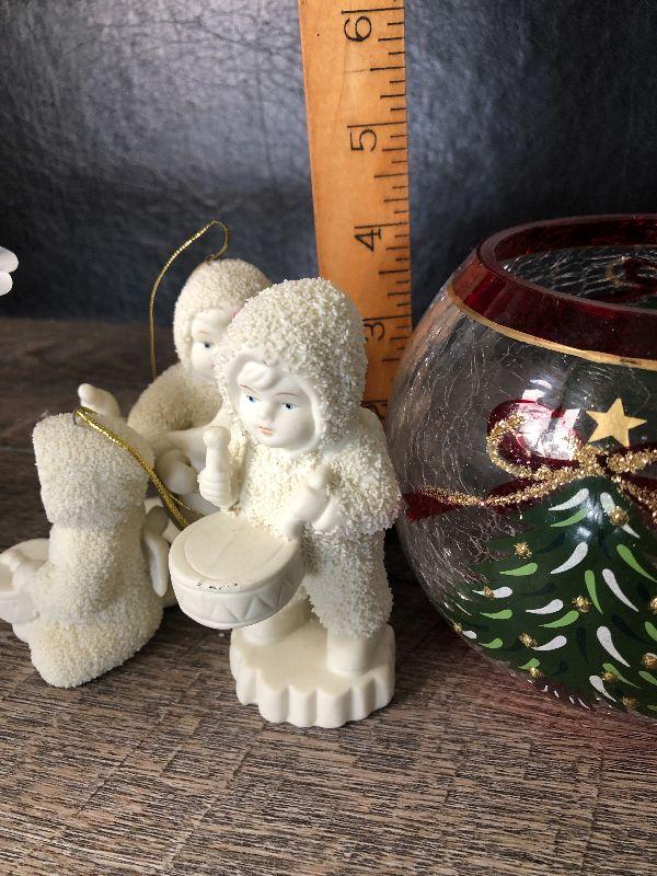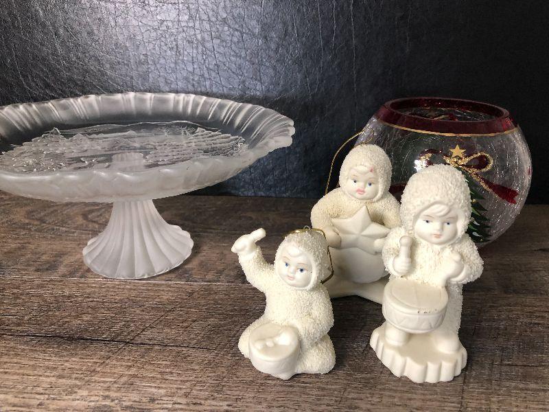 Pedistool dish, candle votive and snow babies.