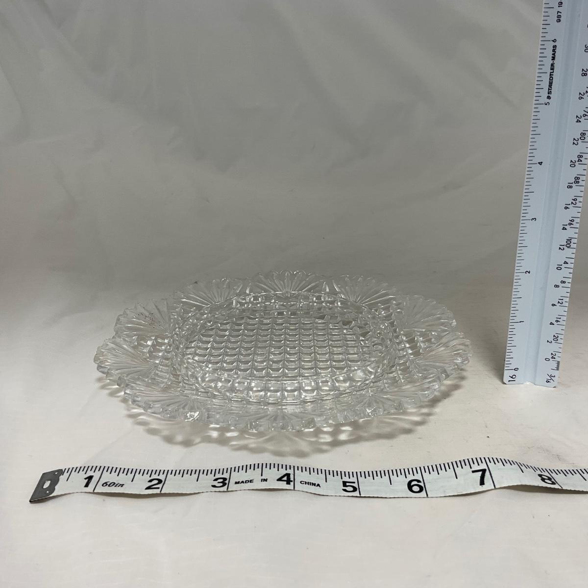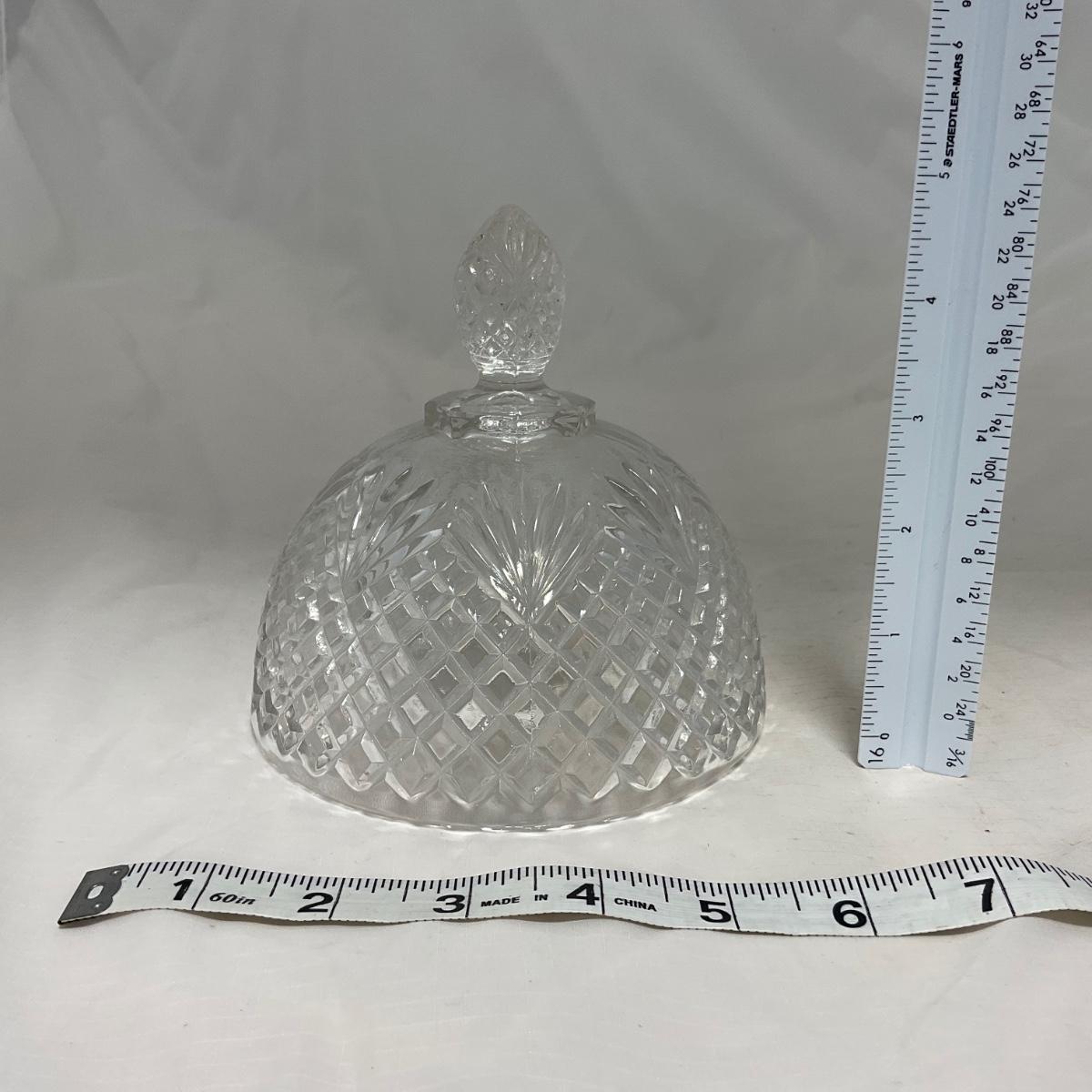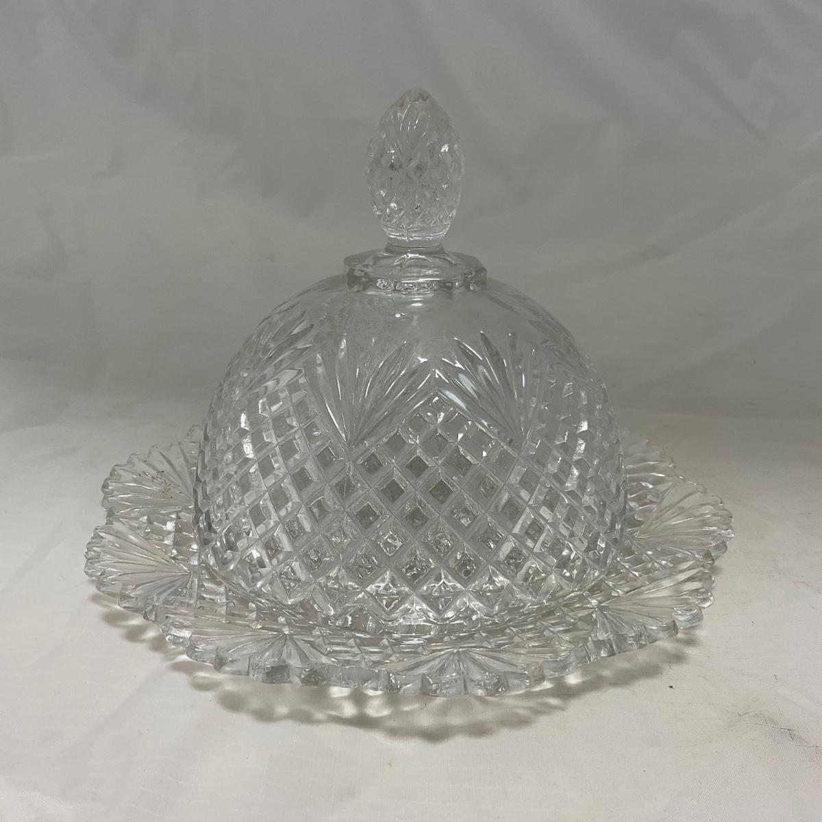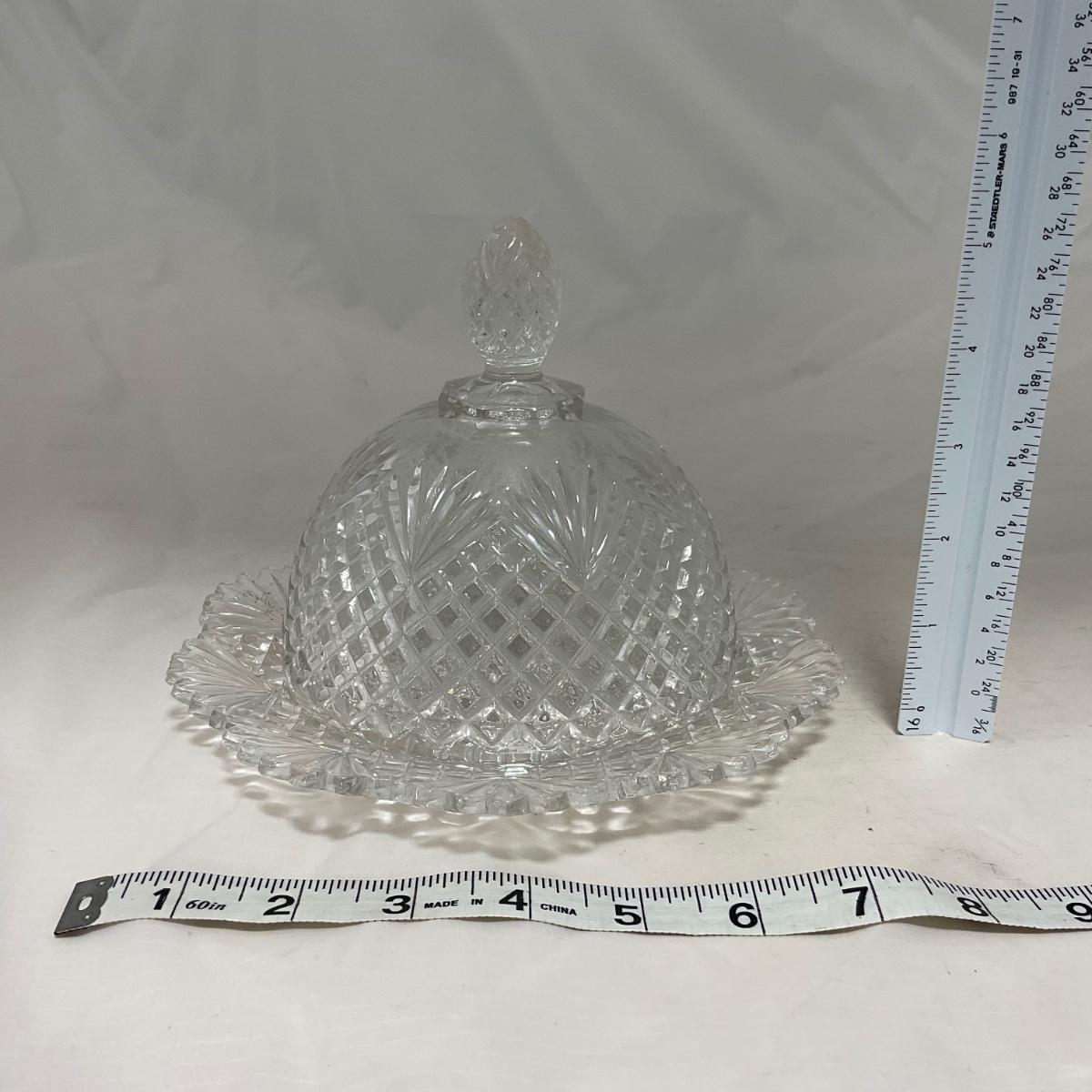 Clear pressed glass covered butter dish. Beautiful shape. Please see photos for details and condition. ::: Shipping is available on this lot. If you require shipping you must let us know at the close of the auction. We will coordinate with you after the item has been won. Shipping fees will include insurance up to or exceeding the value of all items being mailed. If you have any questions regarding this lot please contact the auctioneer either via this website, by direct email or by phone. PICK UP TIMES and other important information can be found in the TERMS and DESCRIPTION of the auction. Please take a look for pertinent information. Thanks!