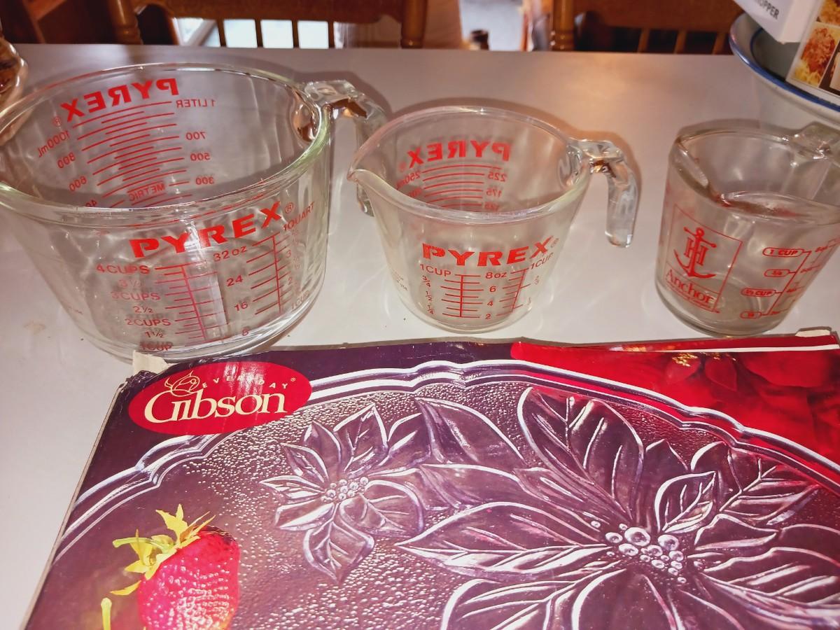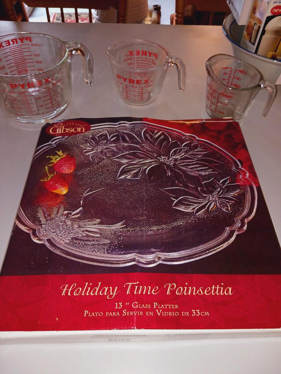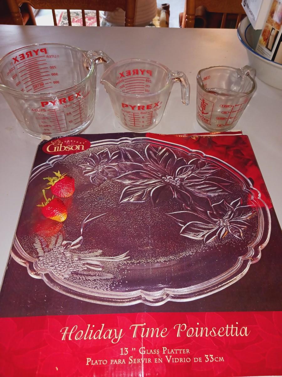 13" GLASS PLATTER AND 3 DIFFERENT SIZE GLASS MEASURING CUPS