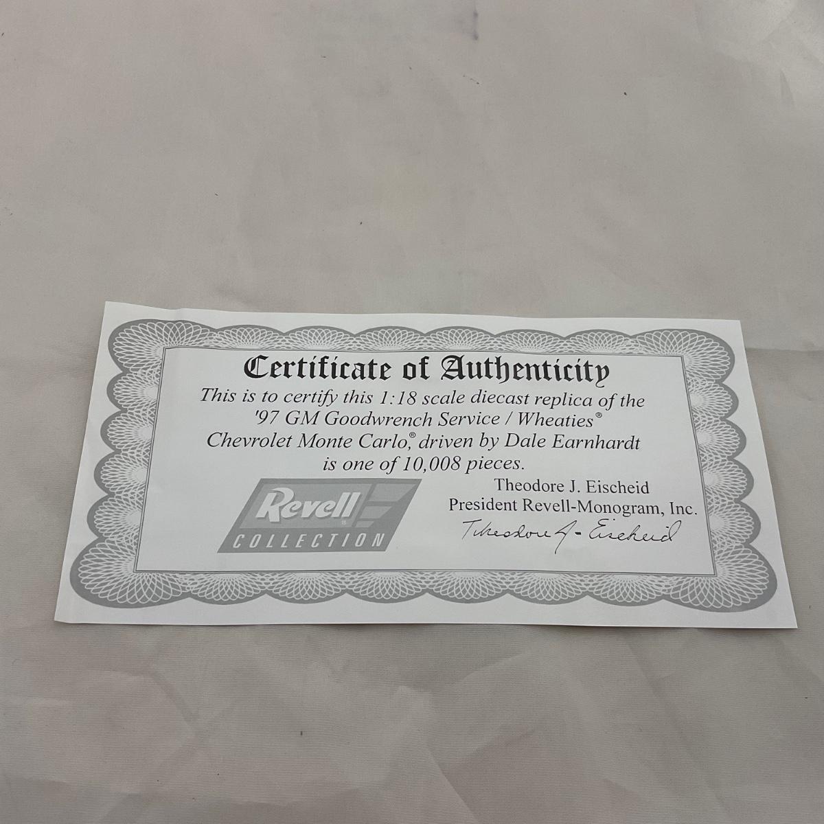 One NASCAR die cast 1:18 scale 1997 Goodwrench and Wheaties Chevrolet Monte Carlo figure. Dale Earnhardt Sr. Comes with a Certificate of Authenticity. Please see photos for details and condition. ::: Shipping is available on this lot. If you require shipping you must let us know at the close of the auction. We will coordinate with you after the item has been won. Shipping fees will include insurance up to or exceeding the value of all items being mailed. If you have any questions regarding this lot please contact the auctioneer either via this website, by direct email or by phone. PICK UP TIMES and other important information can be found in the TERMS and DESCRIPTION of the auction. Please take a look for pertinent information. Thanks!