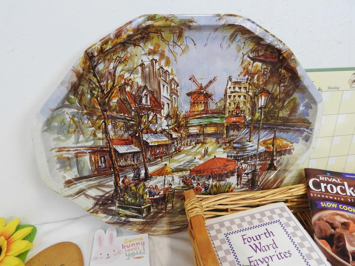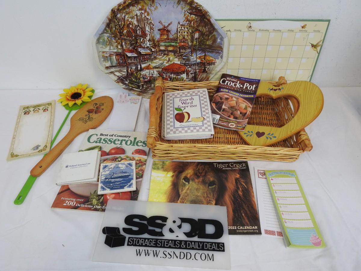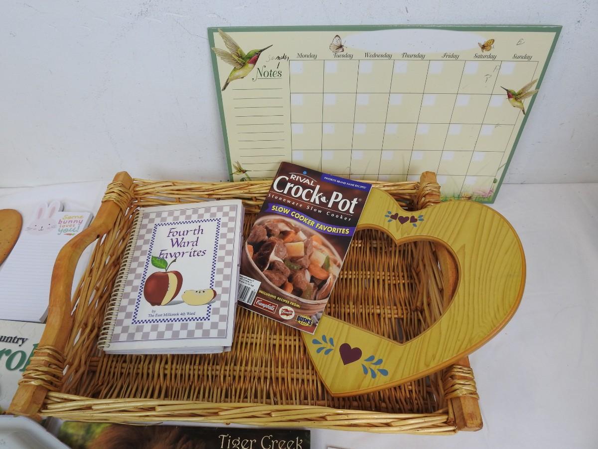 13 pc Kitchen Lot: Wicker Basket, Metal Tray, Cookbooks, 2022 Calendar