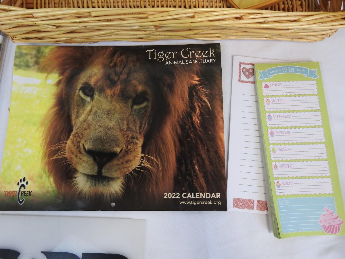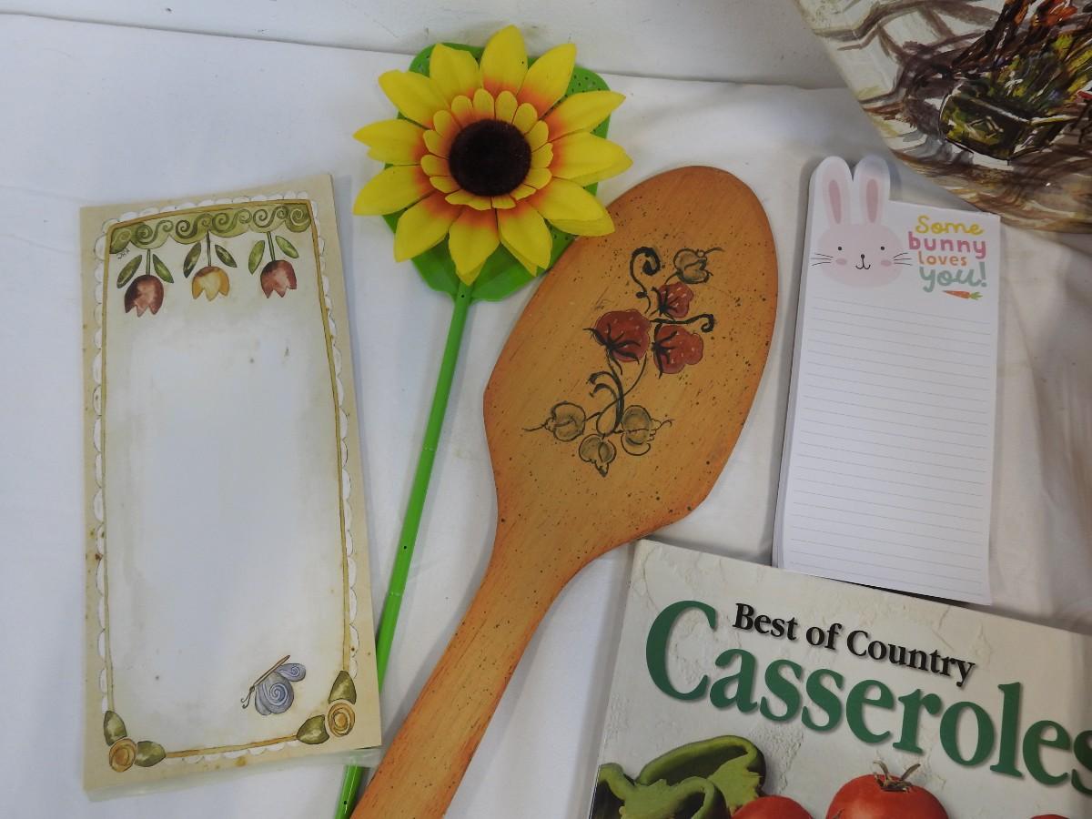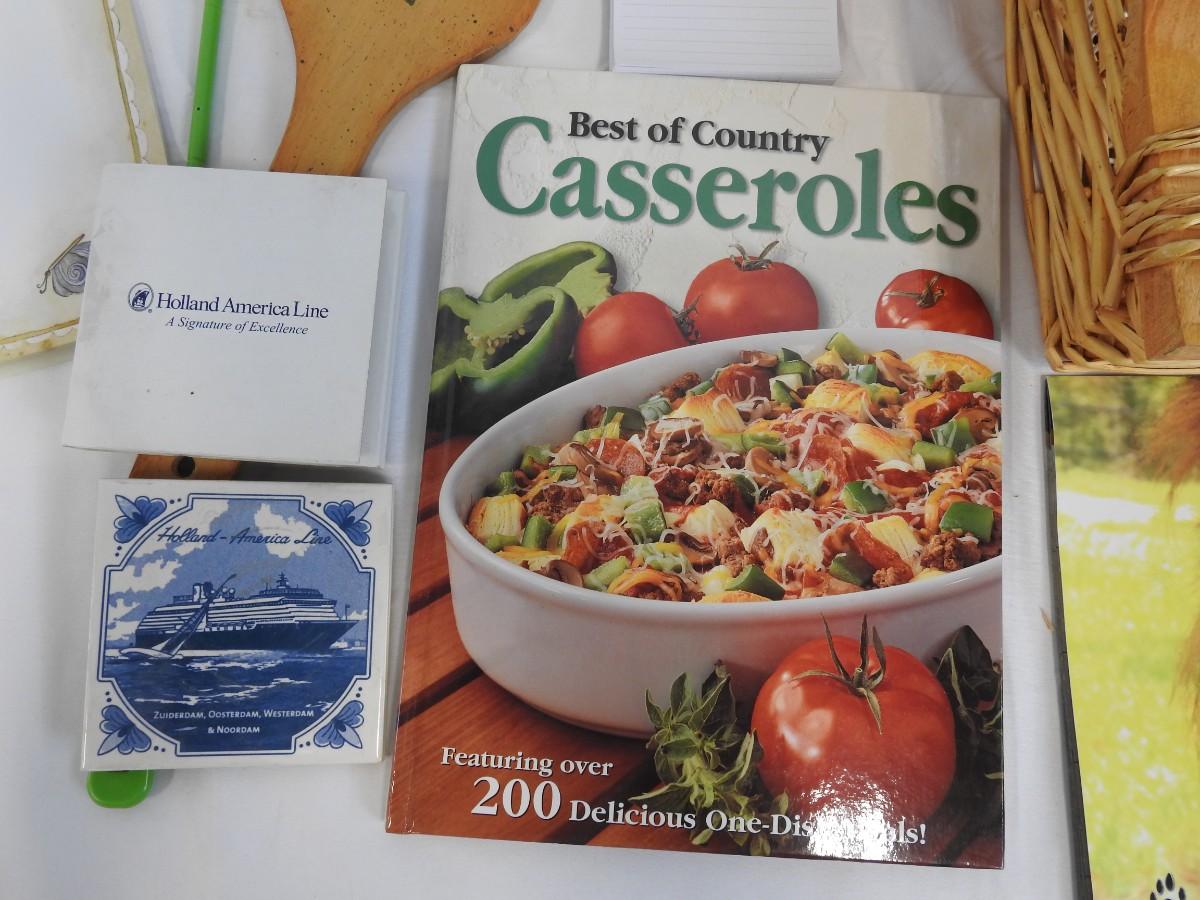 13 pc Kitchen Lot: Wicker Basket, Metal Tray, Cookbooks, 2022 Calendar