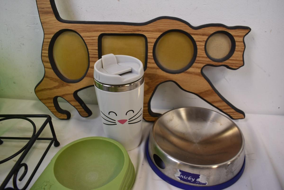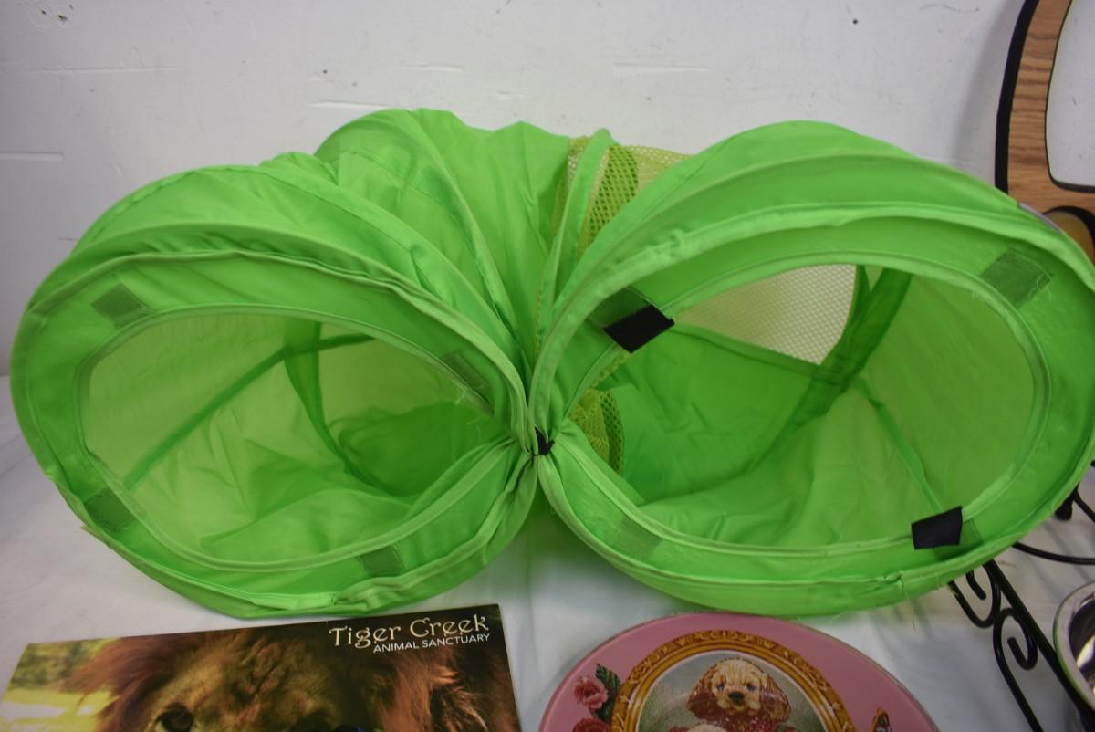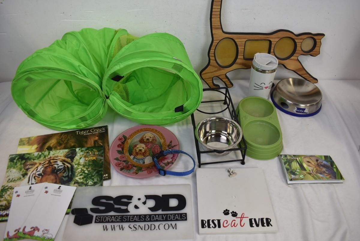 13 pc Pet Lot: Cat Bowls, Cat Tunnel, Cat Photo Frame, Animal Calendars