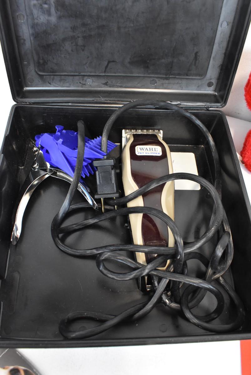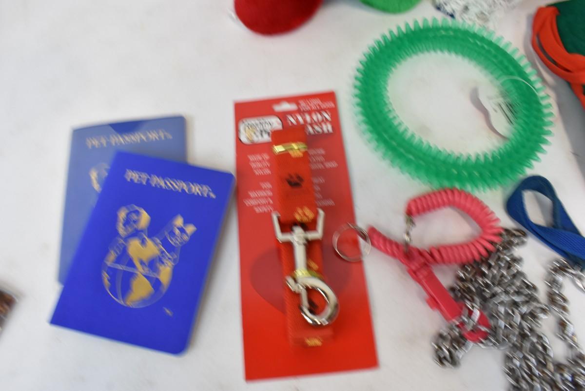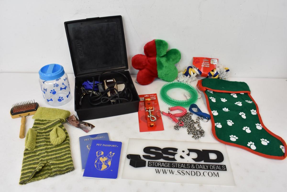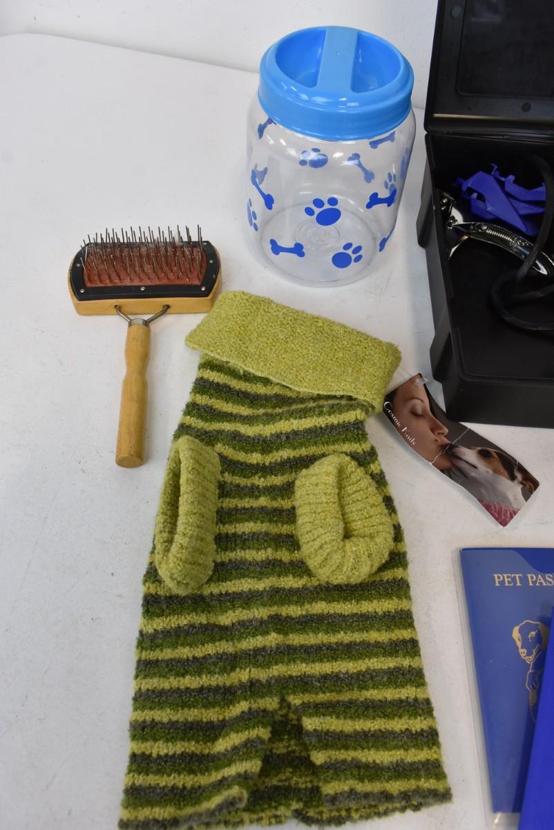 13 pc Pet Lot: Toys, Trimmer, Nail Clipper, Sweater, Leash, Snack Jar