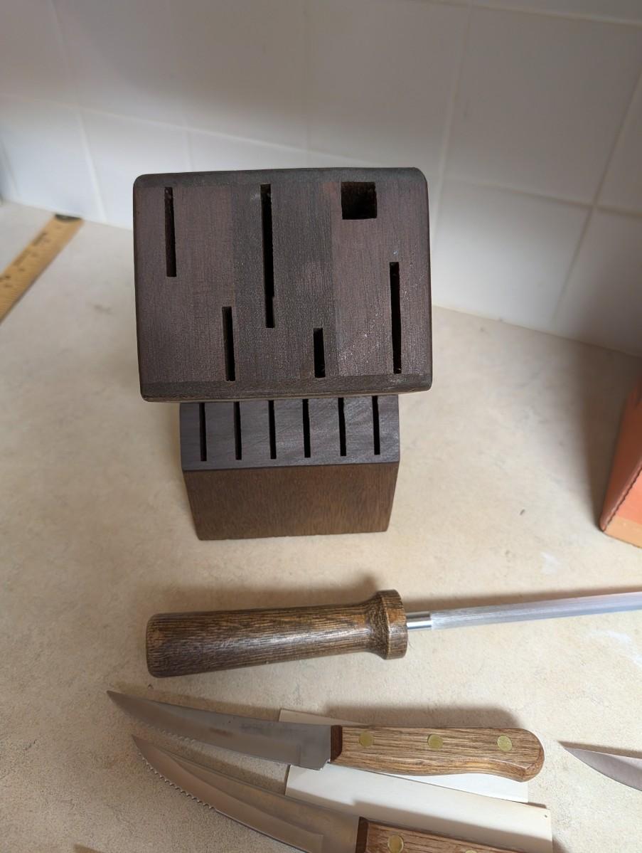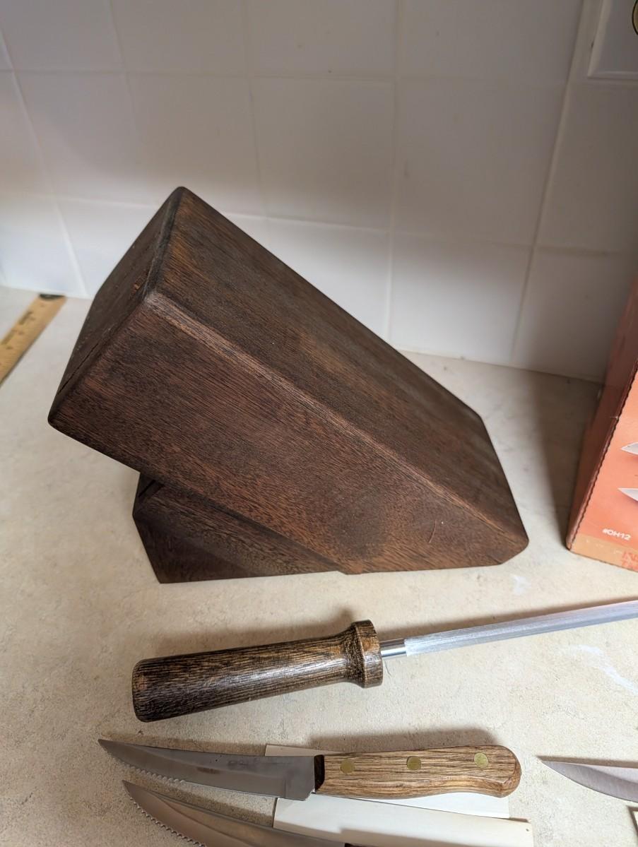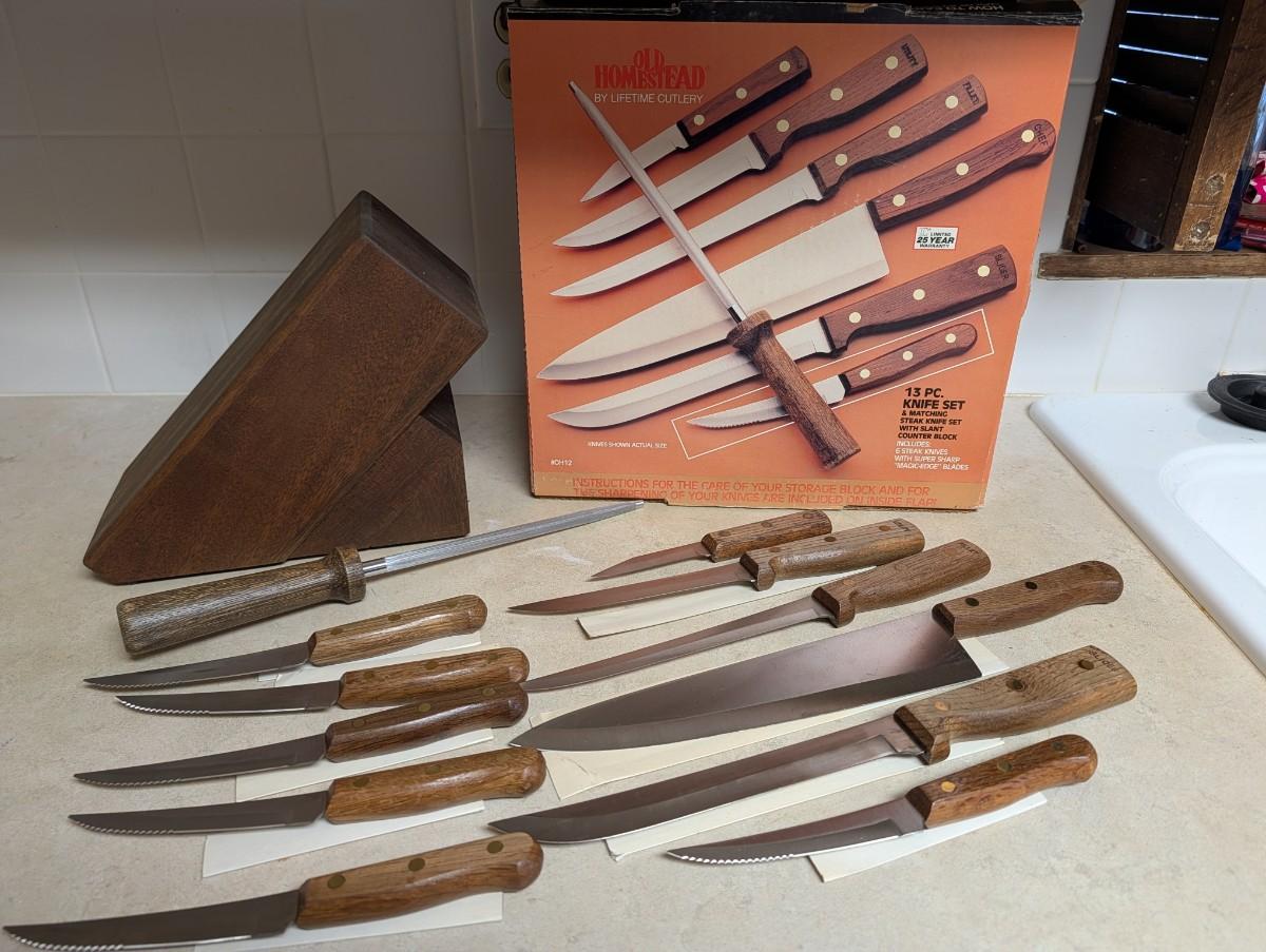 Old homestead 13 piece knife set, and matching steak knife set with slant counter block.