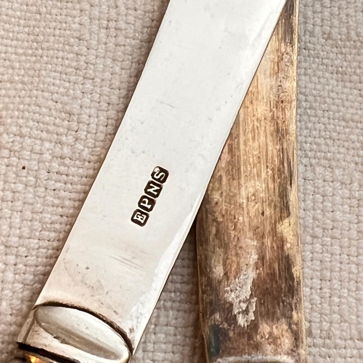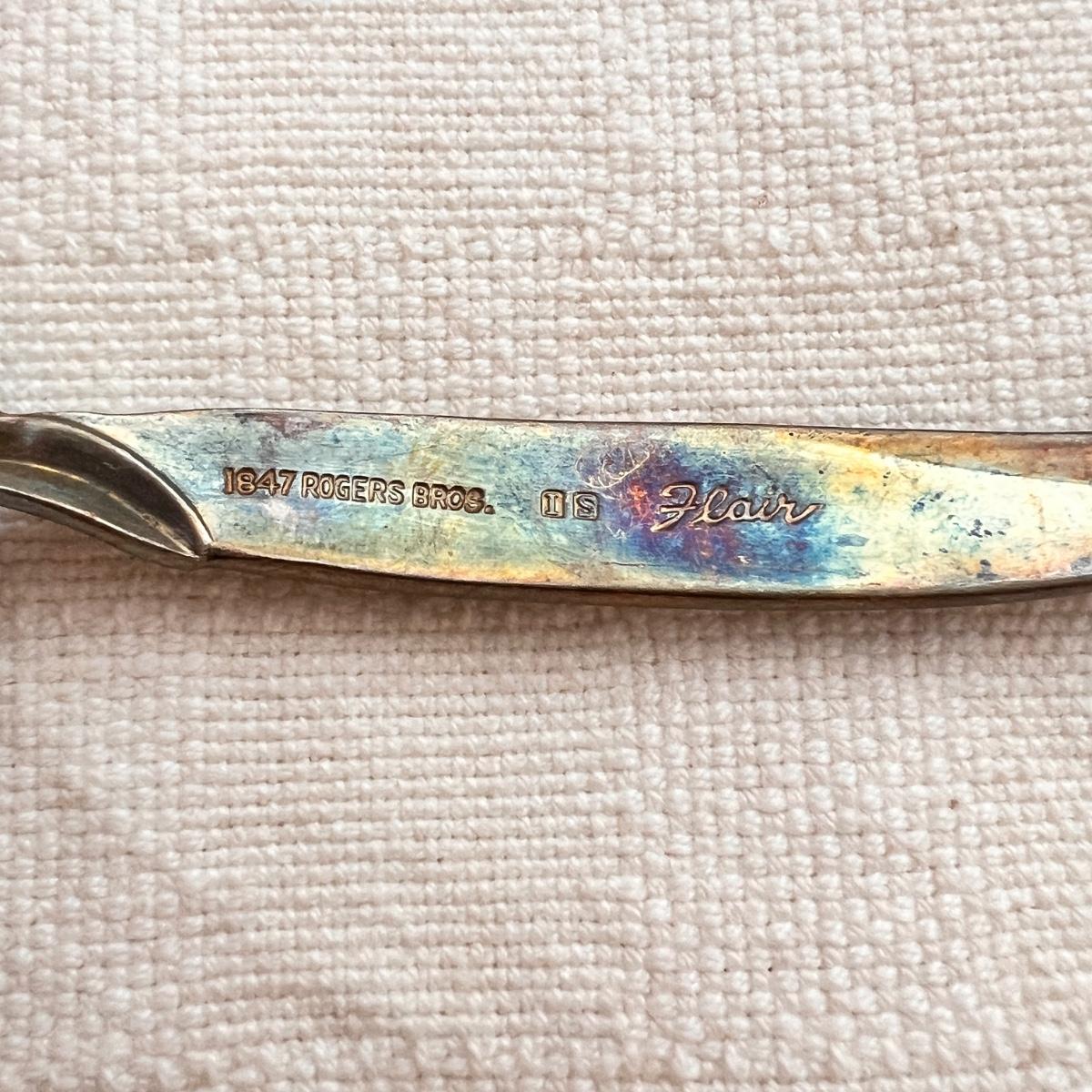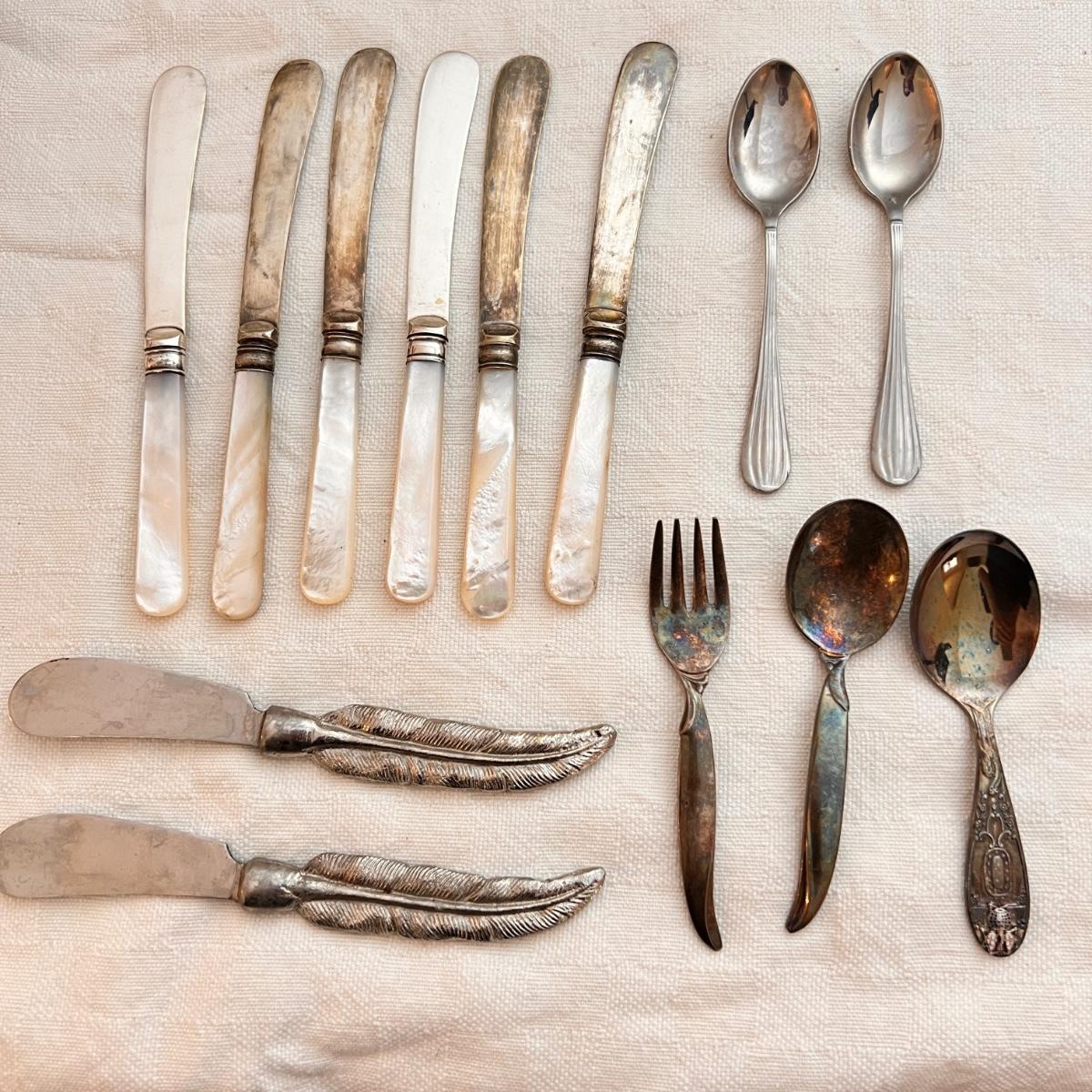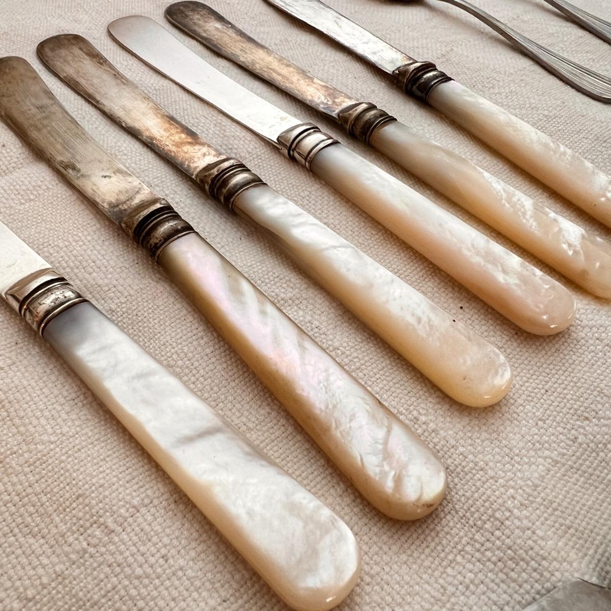 6 electroplated Mother of Pearl handle knives (1 has space between handle and base as shown in pics). Wm. Rogers, Rogers Brothers International Silver.