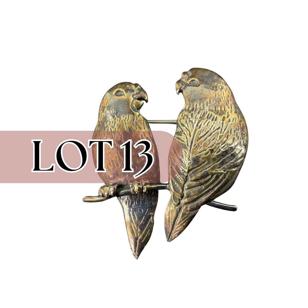 one marked sterling silver GFMW parrot couple brooch. Please see photos for details and condition. Any condition statement is given as a courtesy to a client, is an opinion, and should not be treated as a statement of fact. Reference to condition written, oral or within a condition report shall not be regarded as a full account of condition and may not include all defects, alterations, or restorations. Absence of a condition report does not imply a lot is flawless or lacking imperfections or damage. Katherine’s Auction & Appraisal Service shall have no responsibility for any error or omission. Returns shall not be accepted on the basis of condition. ::: Shipping is available on this lot. If you require shipping you must let us know at the close of the auction. We will coordinate with you after the item has been won. Shipping fees will include insurance up to or exceeding the value of all items being mailed. If you have any questions regarding this lot please contact the auctioneer either via this website, by direct email or by phone. PICK UP TIMES and other important information can be found in the TERMS and DESCRIPTION of the auction. Please take a look for pertinent information. Thanks!