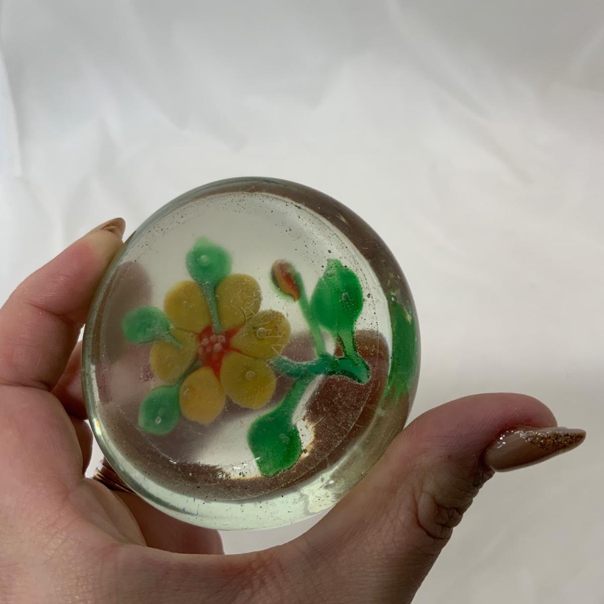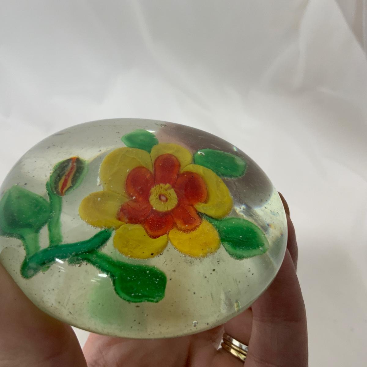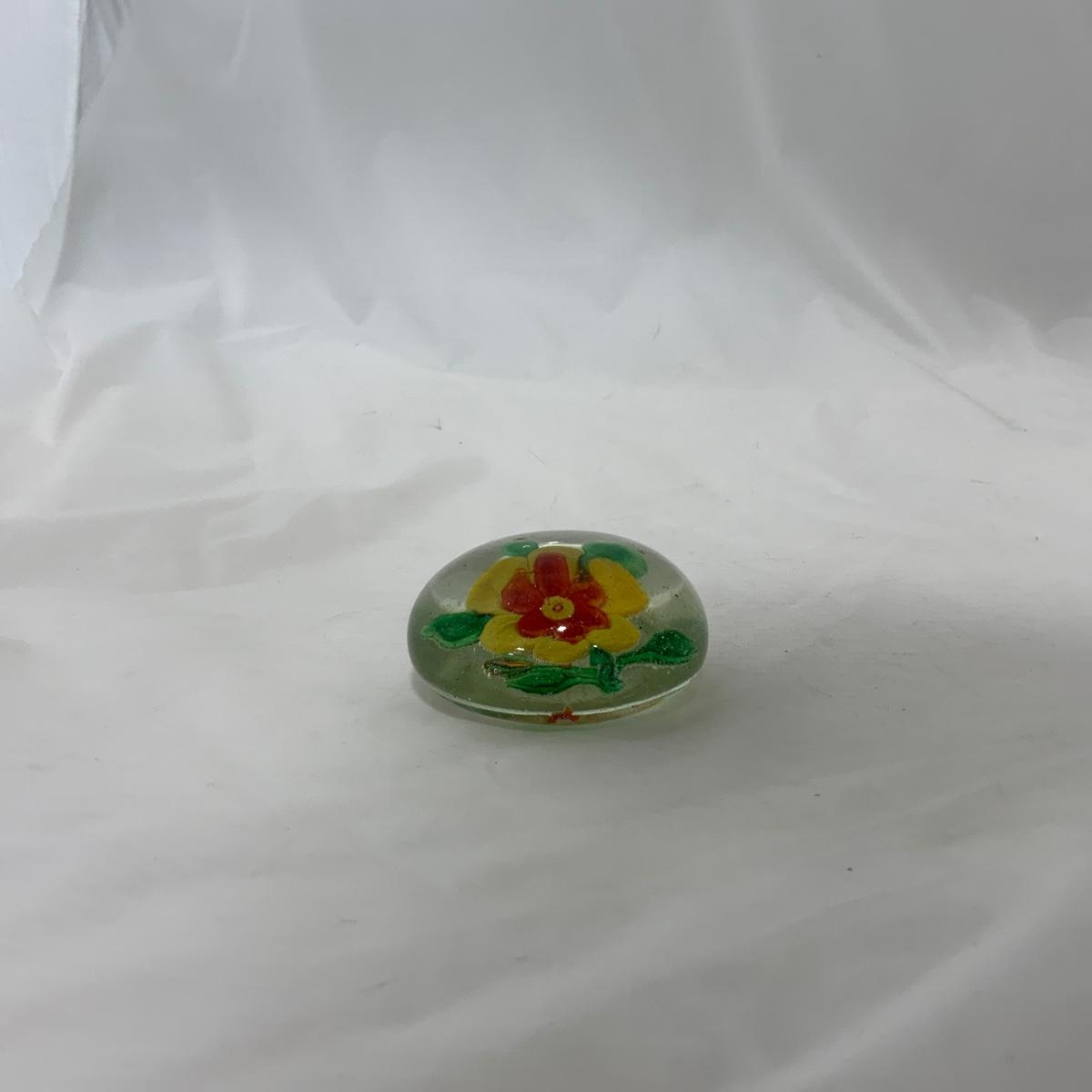 Bright and colorful antique tourist trade flower paperweight from China, circa 1920. There is a flaw in the glass on the top where there may have been a bubble in production. Please see photos for details and condition. ::: Shipping is available on this lot. If you require shipping you must let us know at the close of the auction. We will coordinate with you after the item has been won. Shipping fees will include insurance up to or exceeding the value of all items being mailed. If you have any questions regarding this lot please contact the auctioneer either via this website, by direct email or by phone. PICK UP TIMES and other important information can be found in the TERMS and DESCRIPTION of the auction. Please take a look for pertinent information. Thanks!